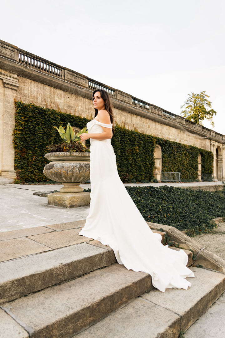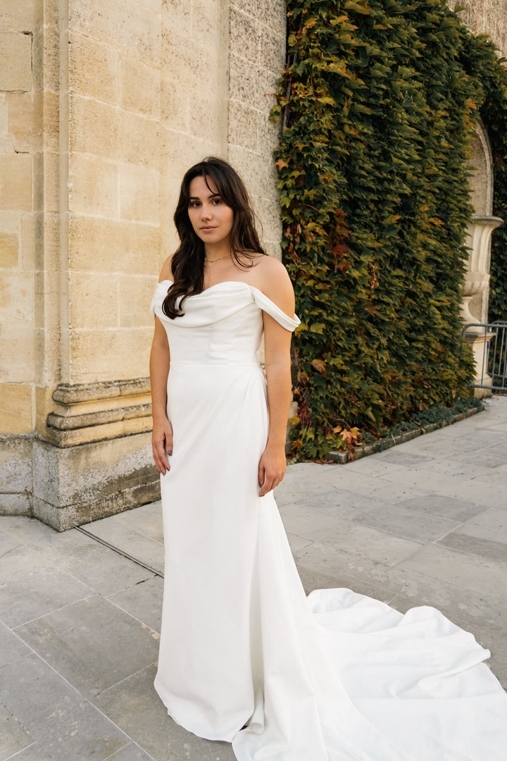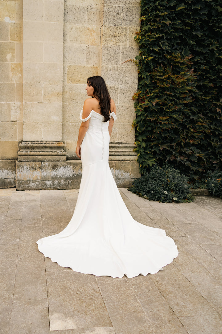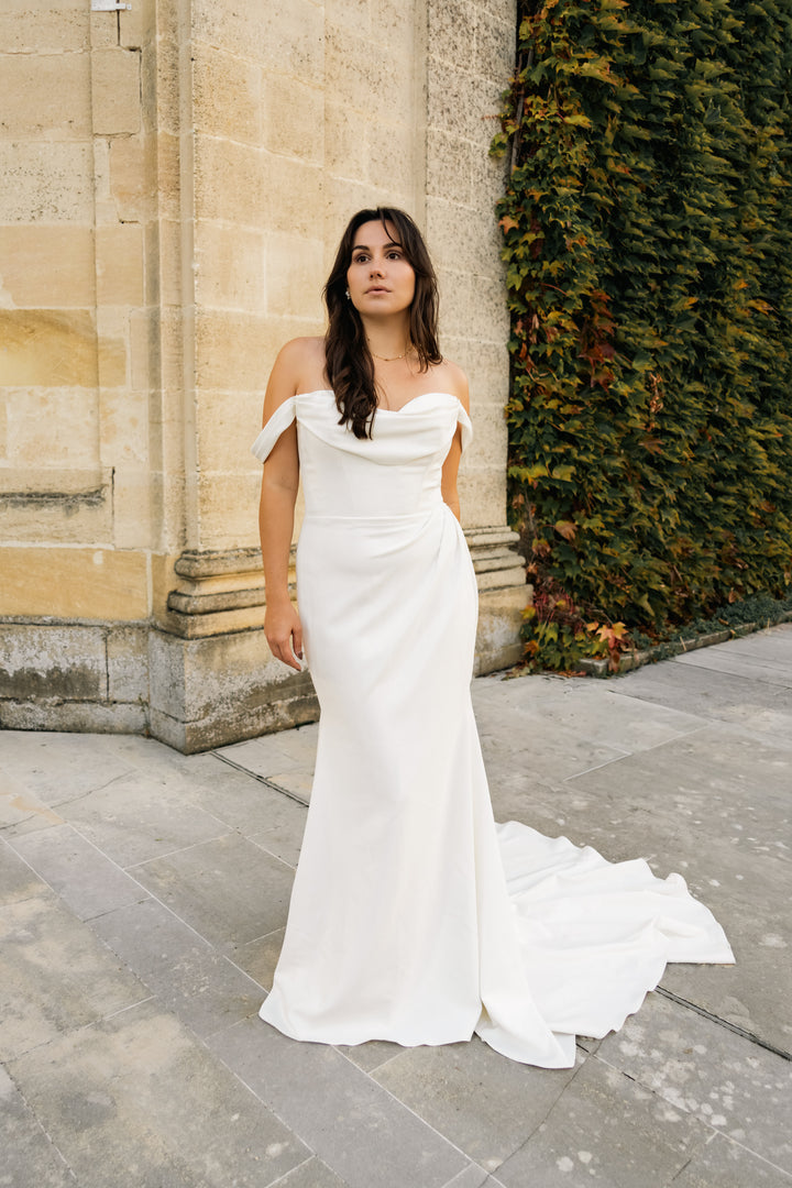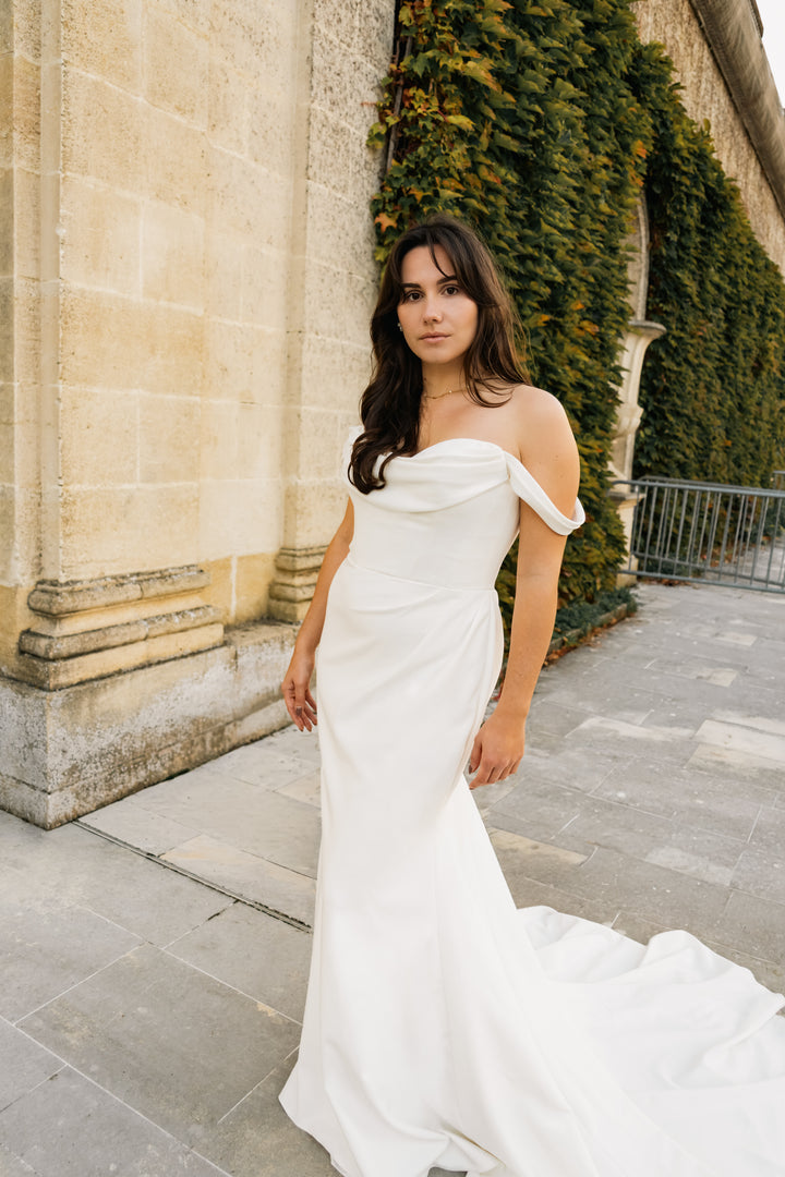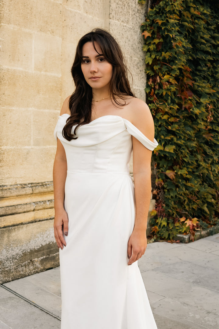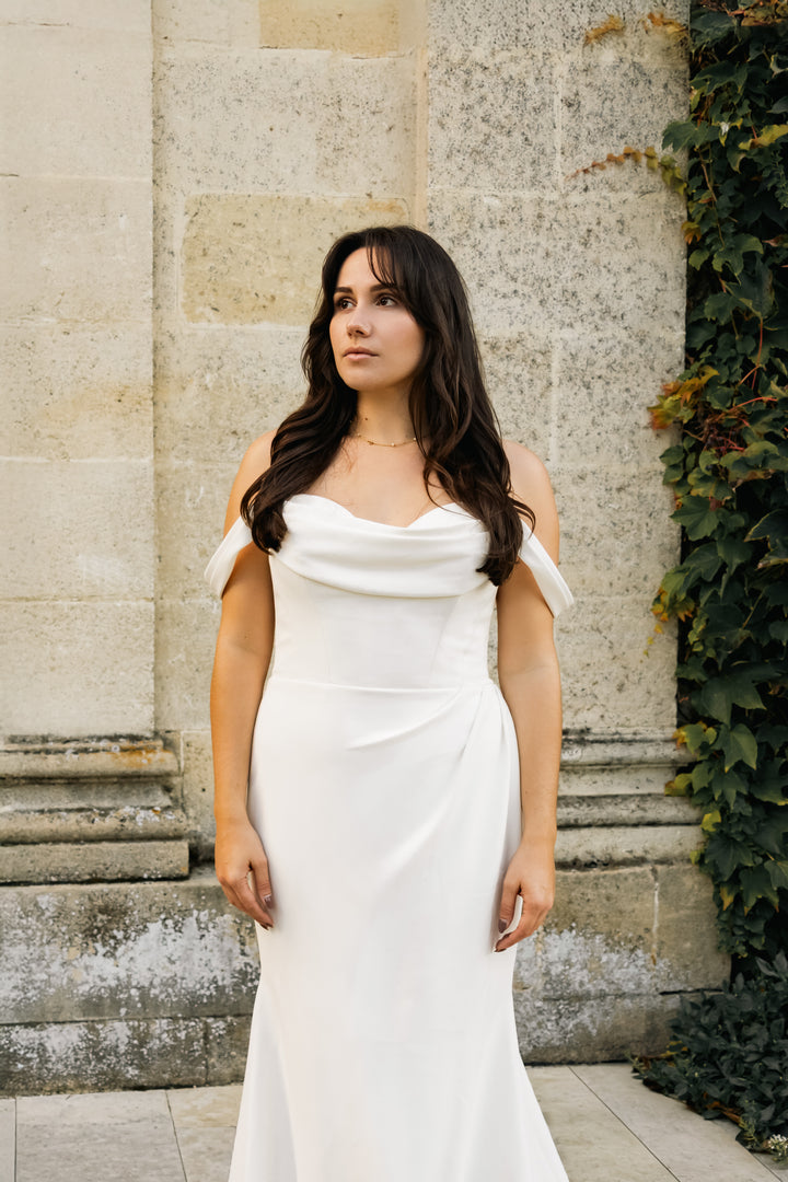 Anele by Noor is exclusive to Nora Eve — a contemporary take on timeless bridal elegance. Crafted from luxurious crepe, her softly draped cowl neckline and off-the-shoulder straps frame the décolletage with effortless grace. The fitted silhouette skims the body before flowing into a gentle train, creating a look that’s both refined and romantic. Understated yet unforgettable, Anele is designed for the modern bride who adores simplicity with substance.