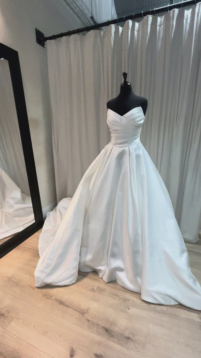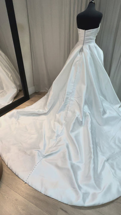 The skirt falls smoothly from the waist, creating a light, fluid silhouette that moves with ease. A classic train completes the look, adding just the right touch of sophistication.