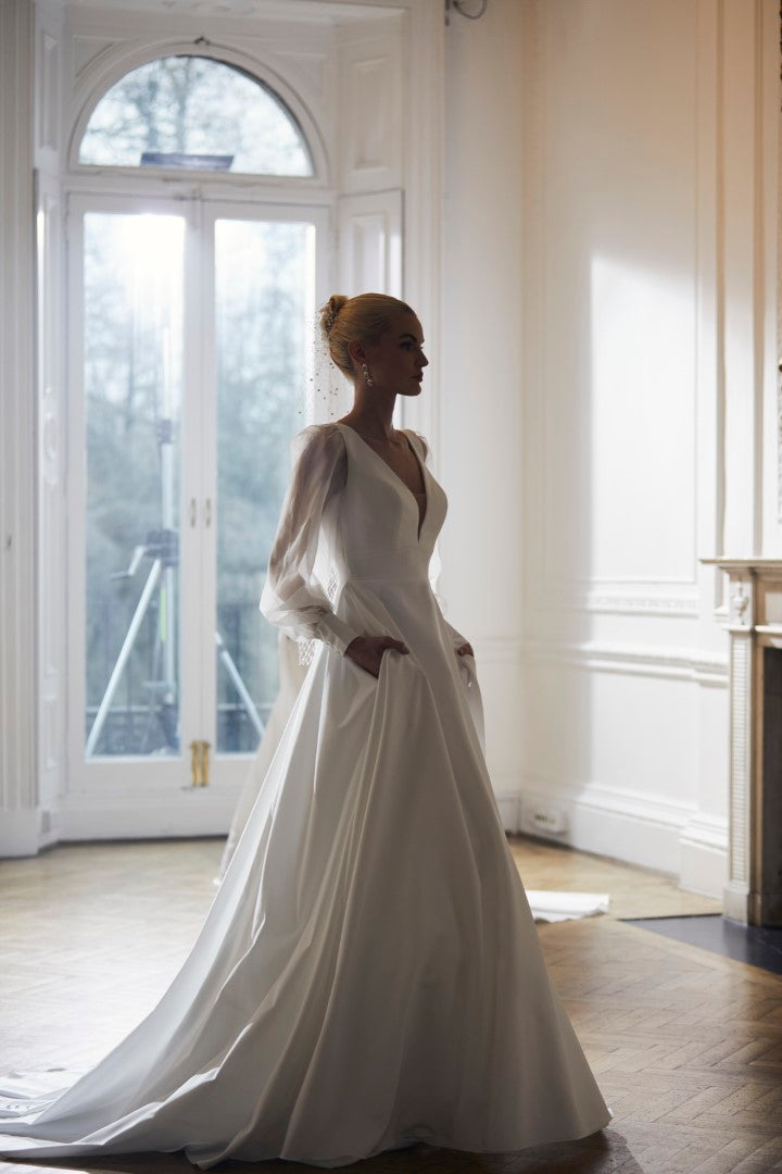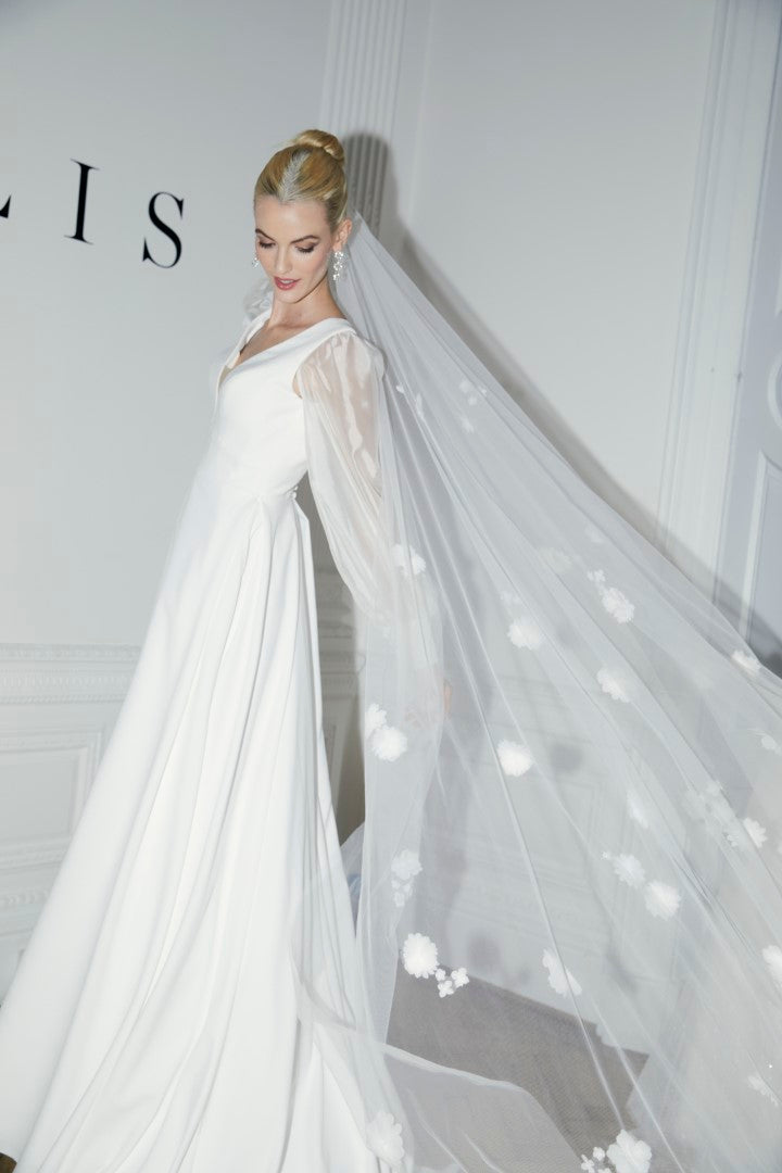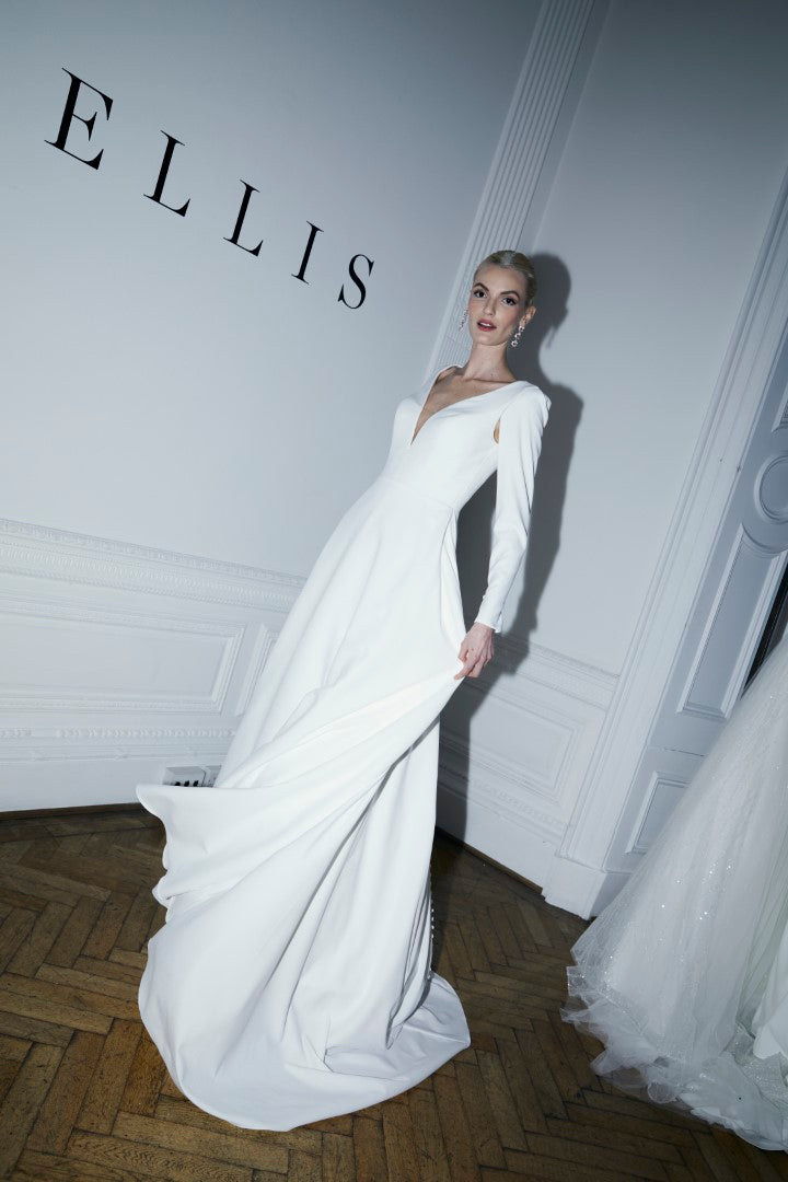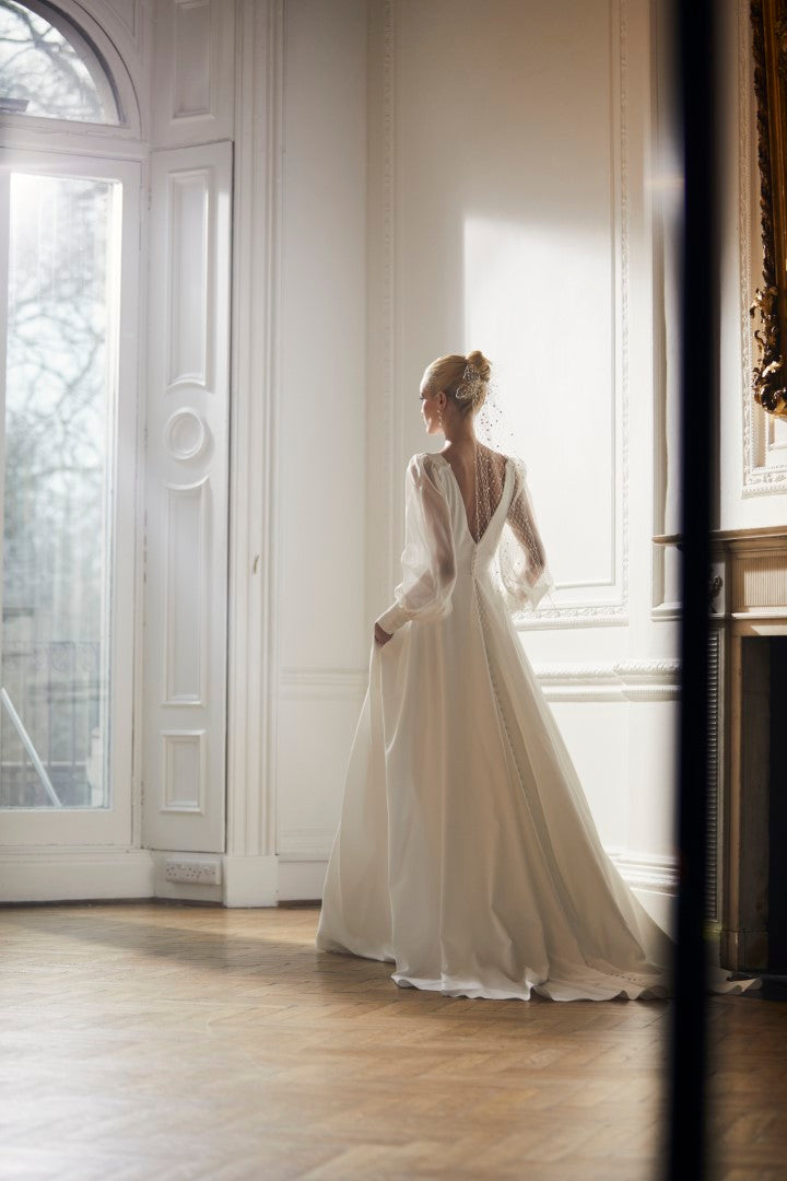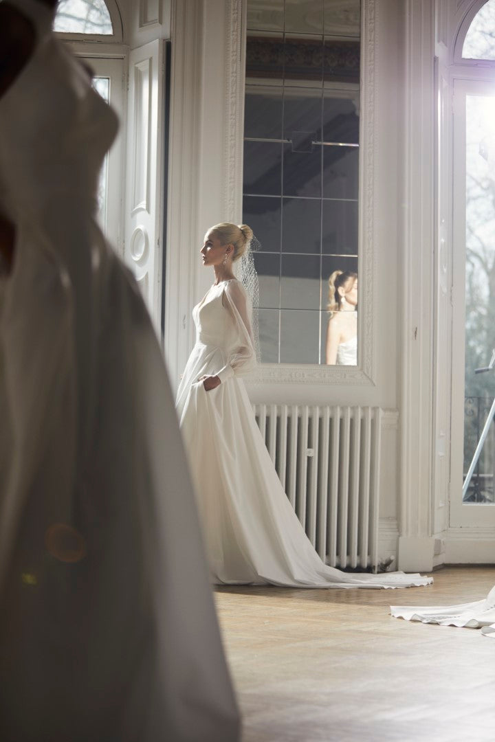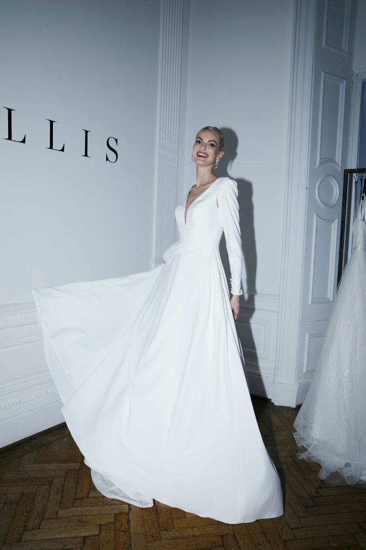 Minimalist and modern, Tegan by Ellis is a modest crepe gown designed for effortless elegance. Her structured bodice with thick straps and shallow plunge neckline flows into a full circle skirt with pockets. Detachable blouson organza sleeves allow brides to transform their look from day to night, making Tegan as versatile as she is timeless.