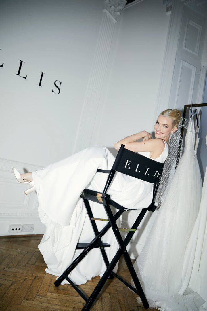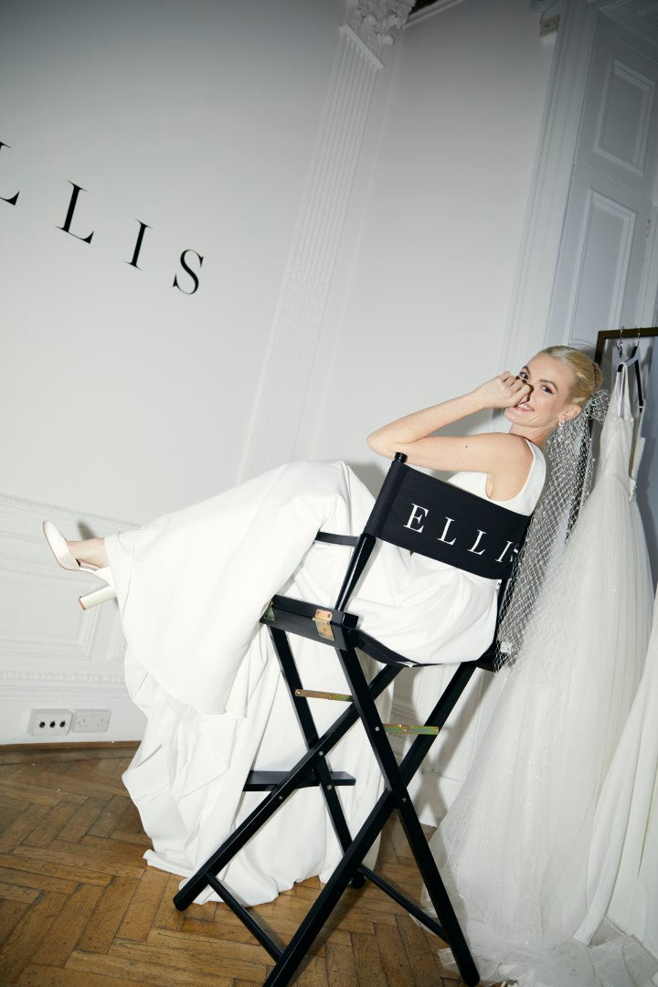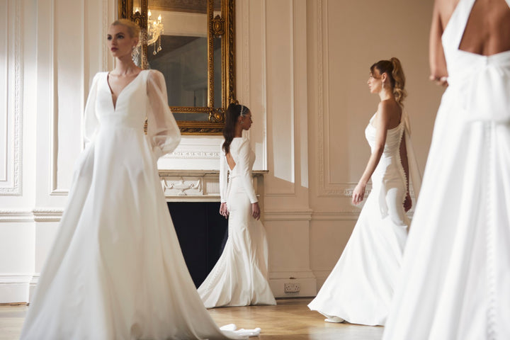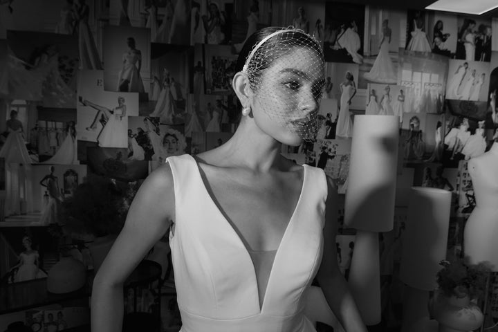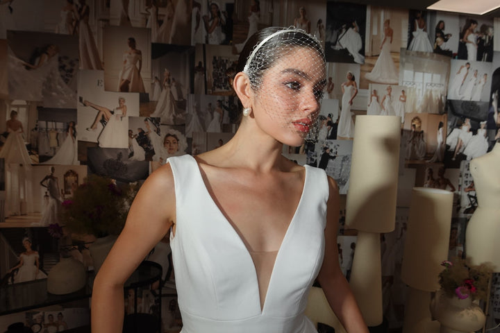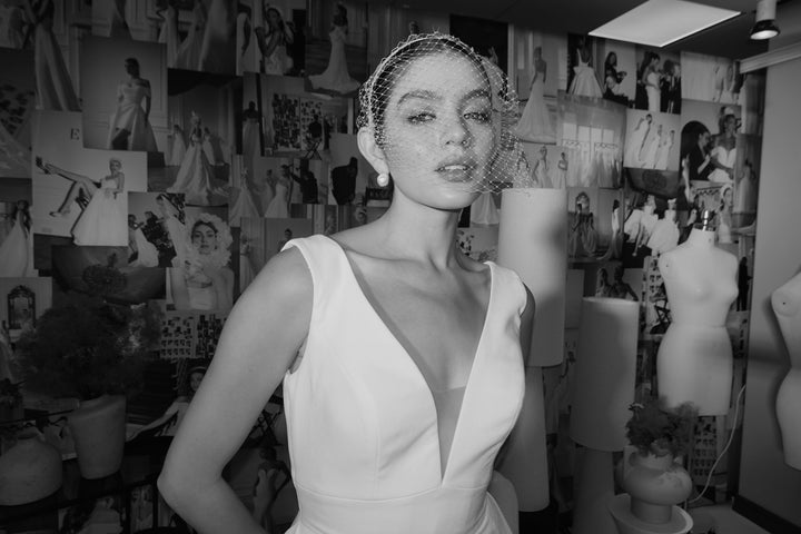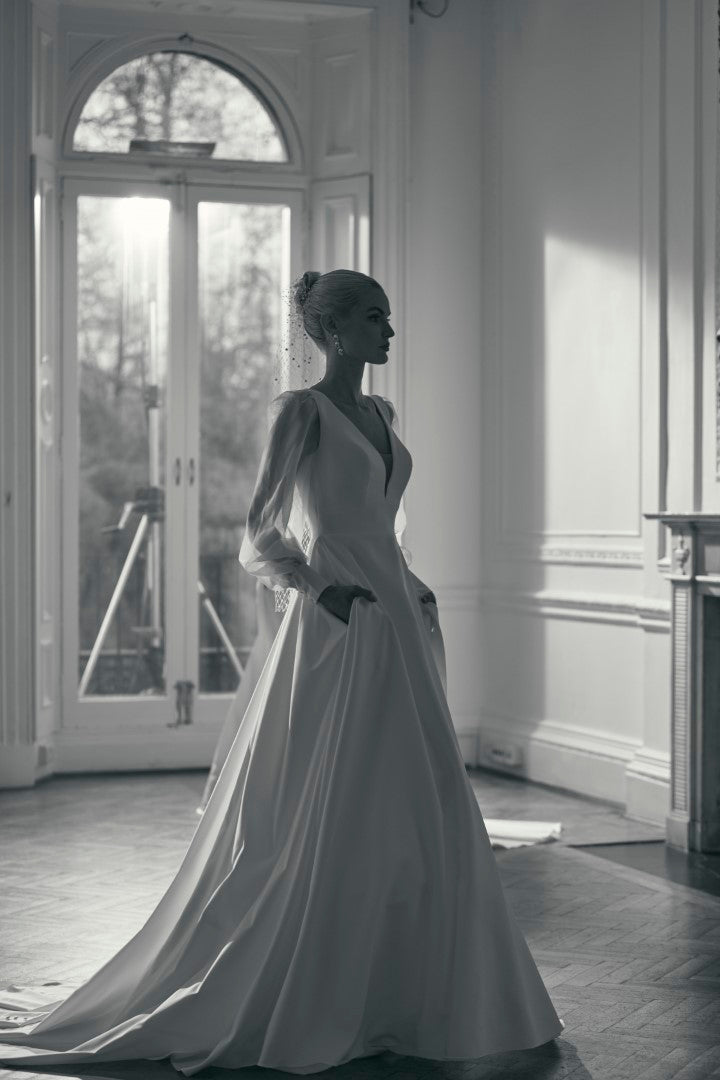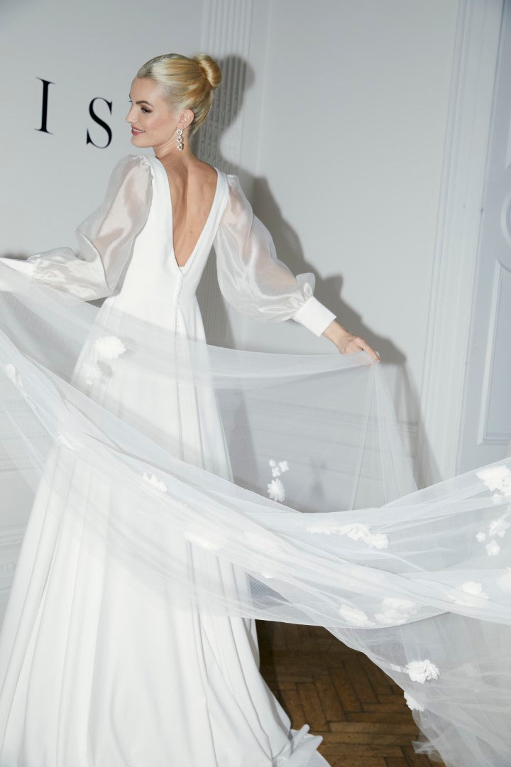 Minimalist and modern, Tegan by Ellis is a modest crepe gown designed for effortless elegance. Her structured bodice with thick straps and shallow plunge neckline flows into a full circle skirt with pockets. Detachable blouson organza sleeves allow brides to transform their look from day to night, making Tegan as versatile as she is timeless.