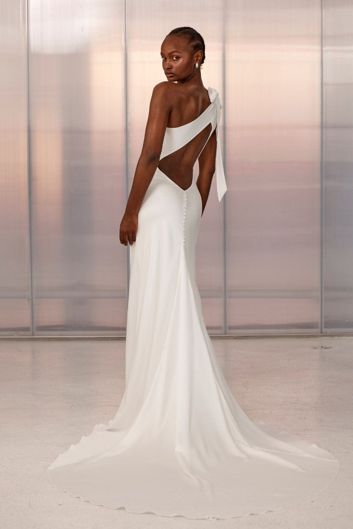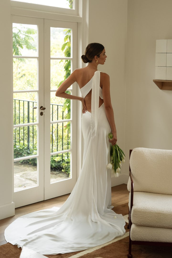 Relaxed elegance with a modern twist, Aire by Grace Loves Lace is a one-shoulder satin gown designed to make an impact. Featuring a side split to elongate the leg, flowing drape, and delicate button details that highlight the back, Aire is both sleek and effortlessly glamorous. Perfect for the bride who wants attitude and elegance in equal measure.