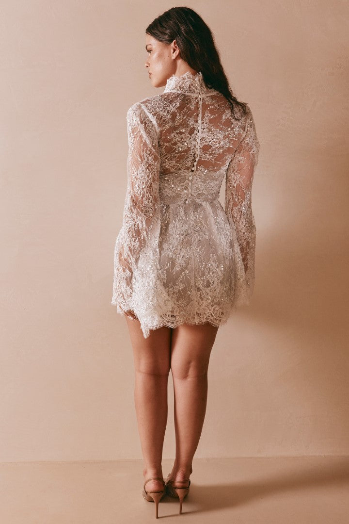 Playful and fashion-forward, Camille by Grace Loves Lace is a short lace wedding dress designed to make a statement. Crafted from exclusive corded lace with long sleeves, a plunging neckline, and shimmering sequin detail, Camille can be styled with the Chantilly lace overskirt for a versatile two-in-one look. A chic choice for modern brides who love individuality.