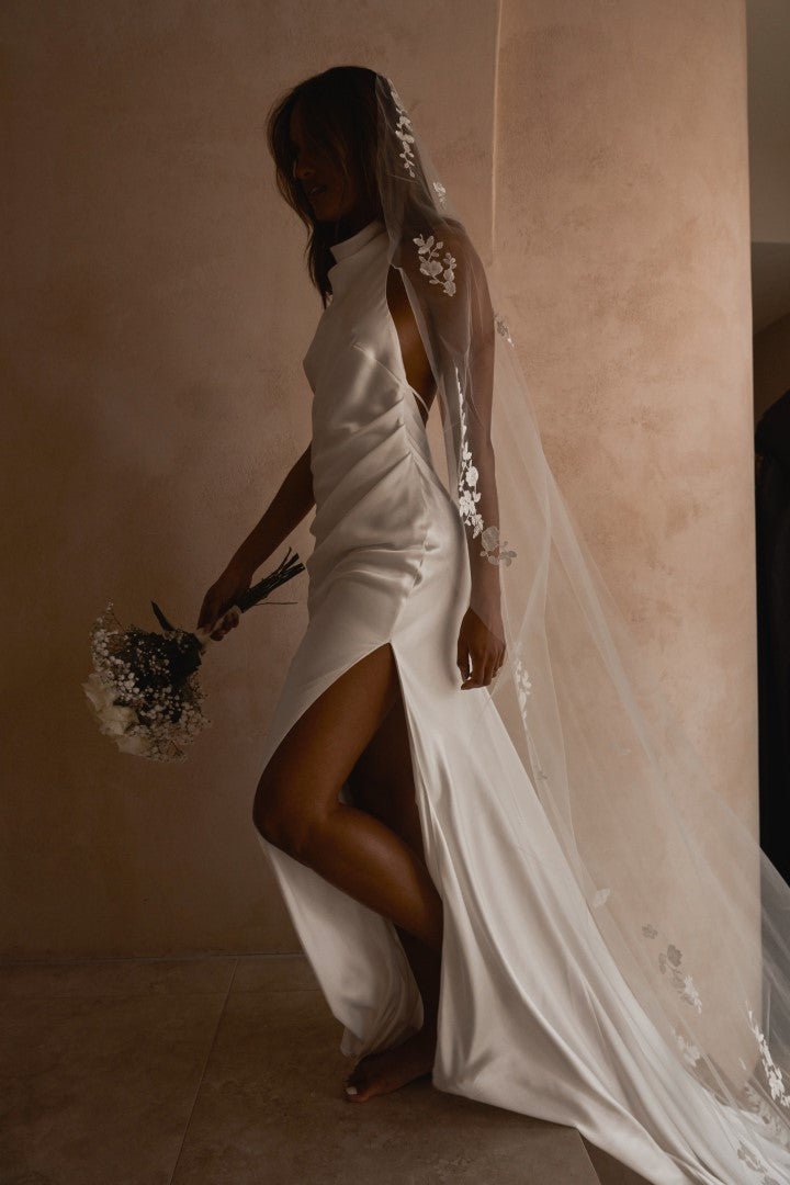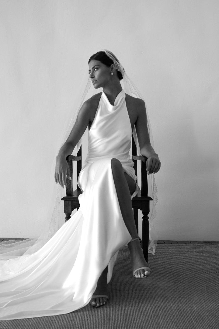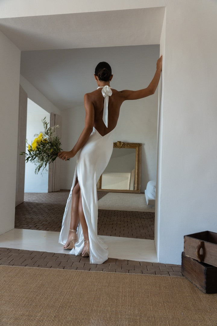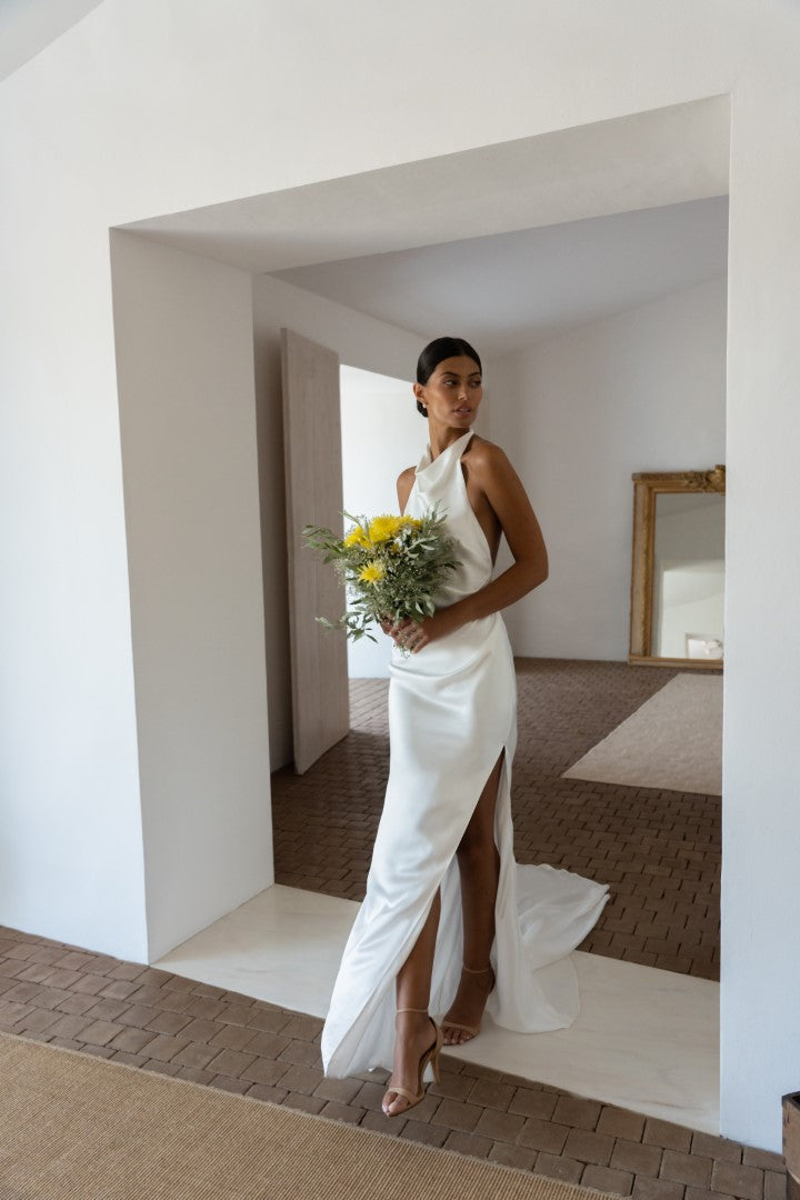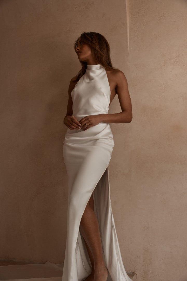 Effortlessly glamorous, Goldie by Grace Loves Lace is a pearlescent satin gown with a chic halter neckline and dramatic low back. A softly draped neckline adds romance, while the fluid satin silhouette is made to move with you from ceremony to dance floor. Sleek, modern, and captivating, Goldie is designed for brides who want to shine.