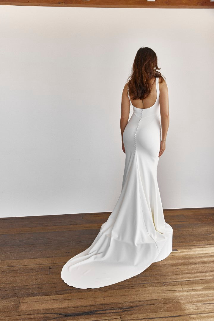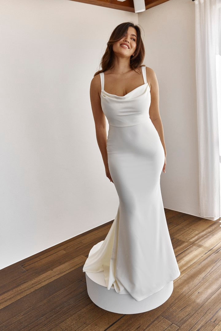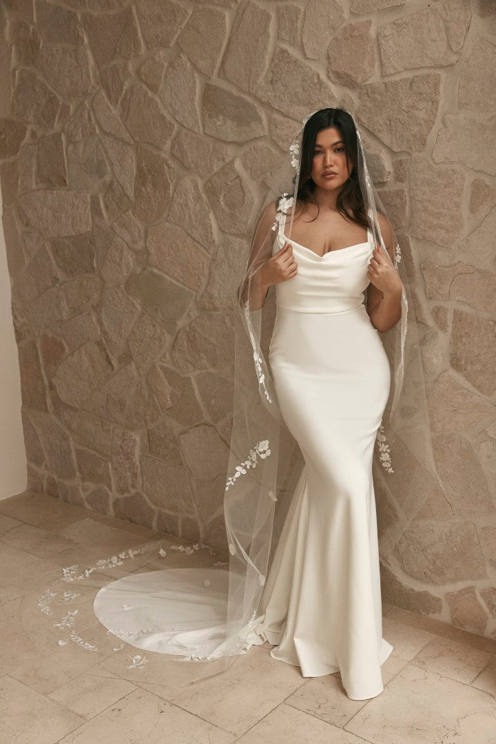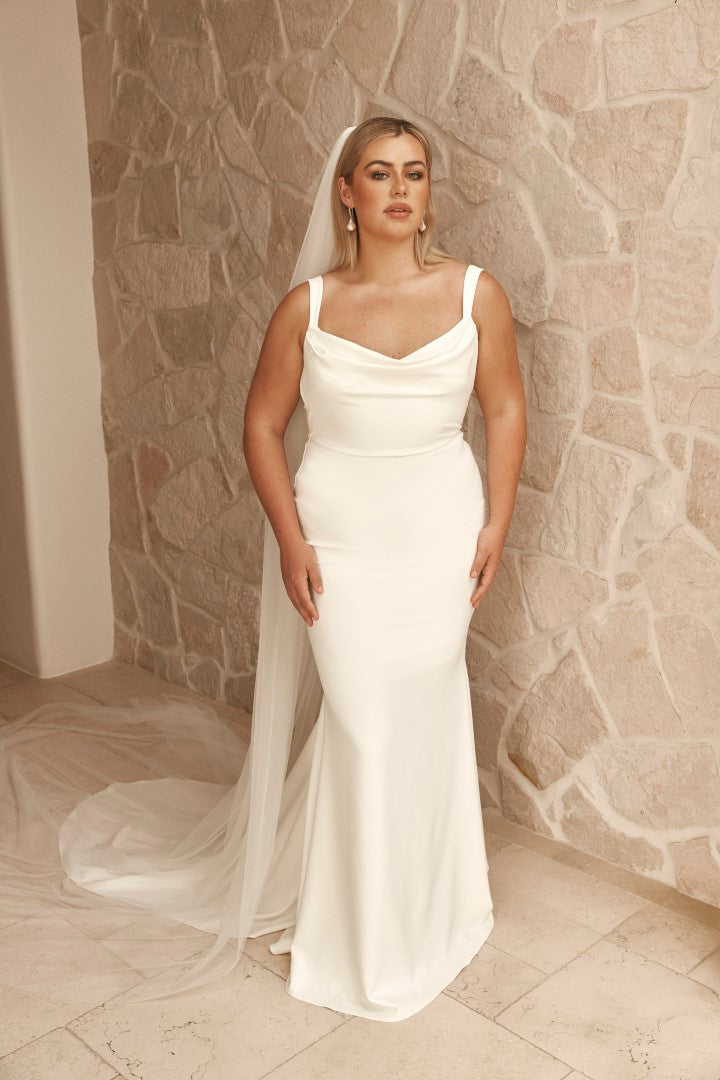 Designed for the curvy bride, Grace Curve by Grace Loves Lace offers timeless elegance with a flattering draped neckline and sleek crepe silhouette. Inspired by Old Hollywood, this gown celebrates curves with confidence and style. Modern yet classic, Grace Curve is the perfect balance of comfort, sophistication, and glamour.