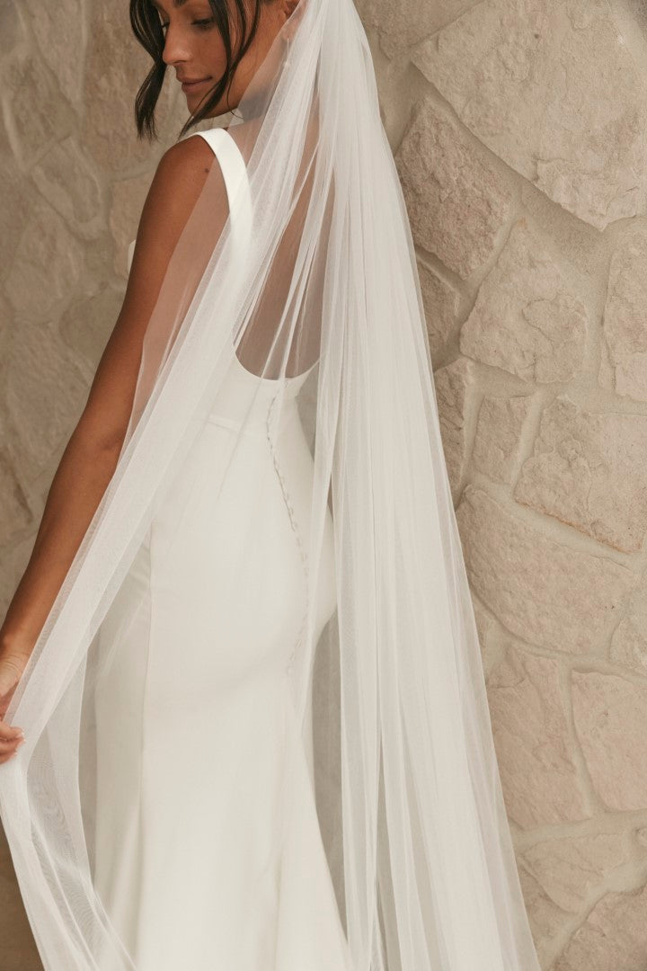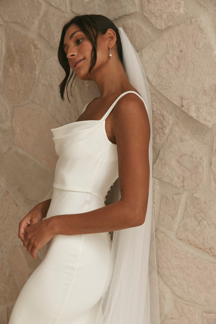 Timeless with a touch of Old Hollywood glamour, Grace by Grace Loves Lace is crafted from luxurious stretch crepe. Featuring a softly draped neckline and clean, sculpted silhouette, she blends classic elegance with modern simplicity. A gown that feels as effortless as it looks, Grace is perfect for brides seeking refined sophistication.