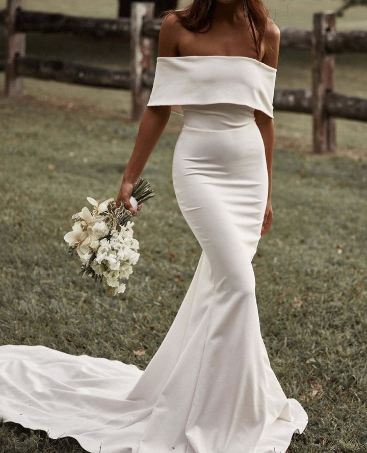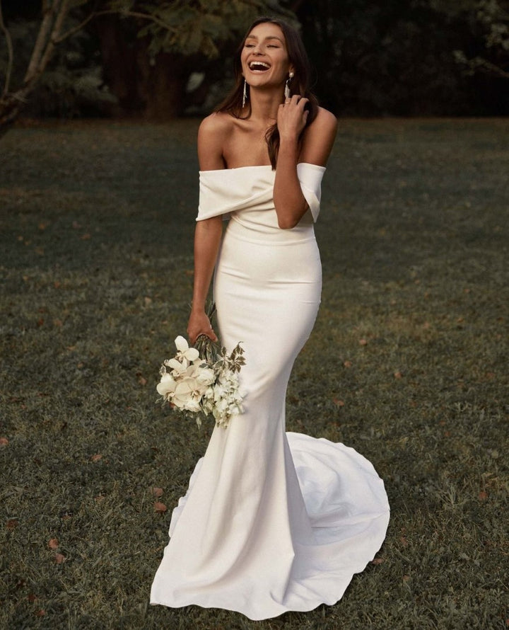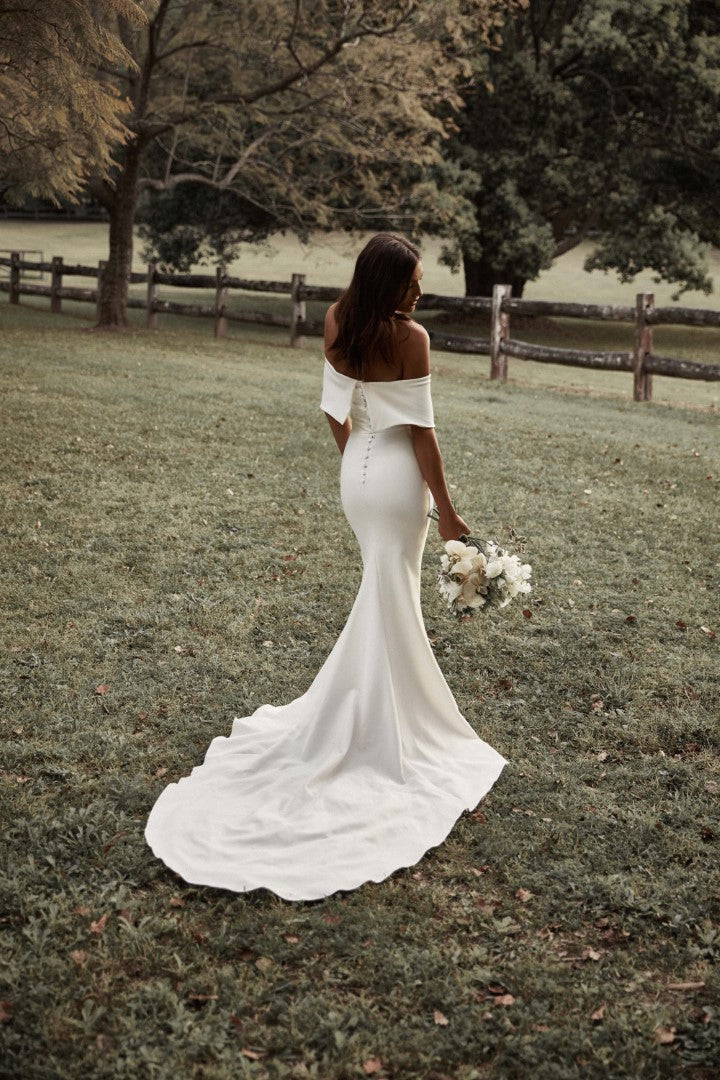 Modern and timeless, Mila by Grace Loves Lace is an elegant off-the-shoulder gown handcrafted from buttery stretch crepe. This classic silhouette accentuates natural curves while offering comfort and freedom of movement. Minimalist yet striking, Mila is a true Grace icon – perfect for the bride seeking effortless sophistication.