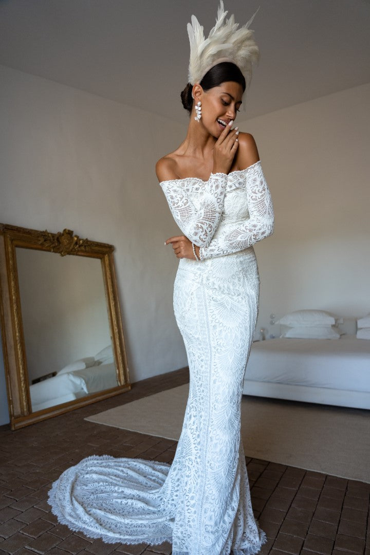 Romantic and refined, Nathalia by Grace Loves Lace is crafted with intricate trims and delicate panelling for a beautifully sculpted look. Her off-the-shoulder lace neckline highlights the décolletage with feminine elegance, while the fit flatters every curve. A gown that balances soft textures with timeless sophistication, Nathalia is designed for brides who want detail with impact.