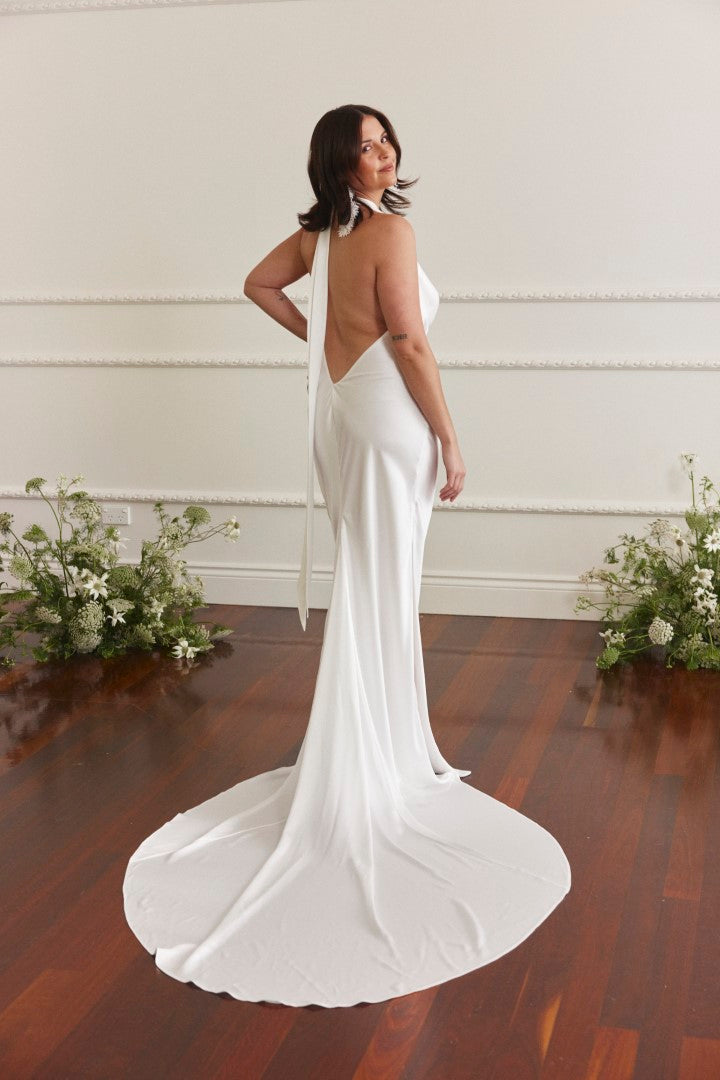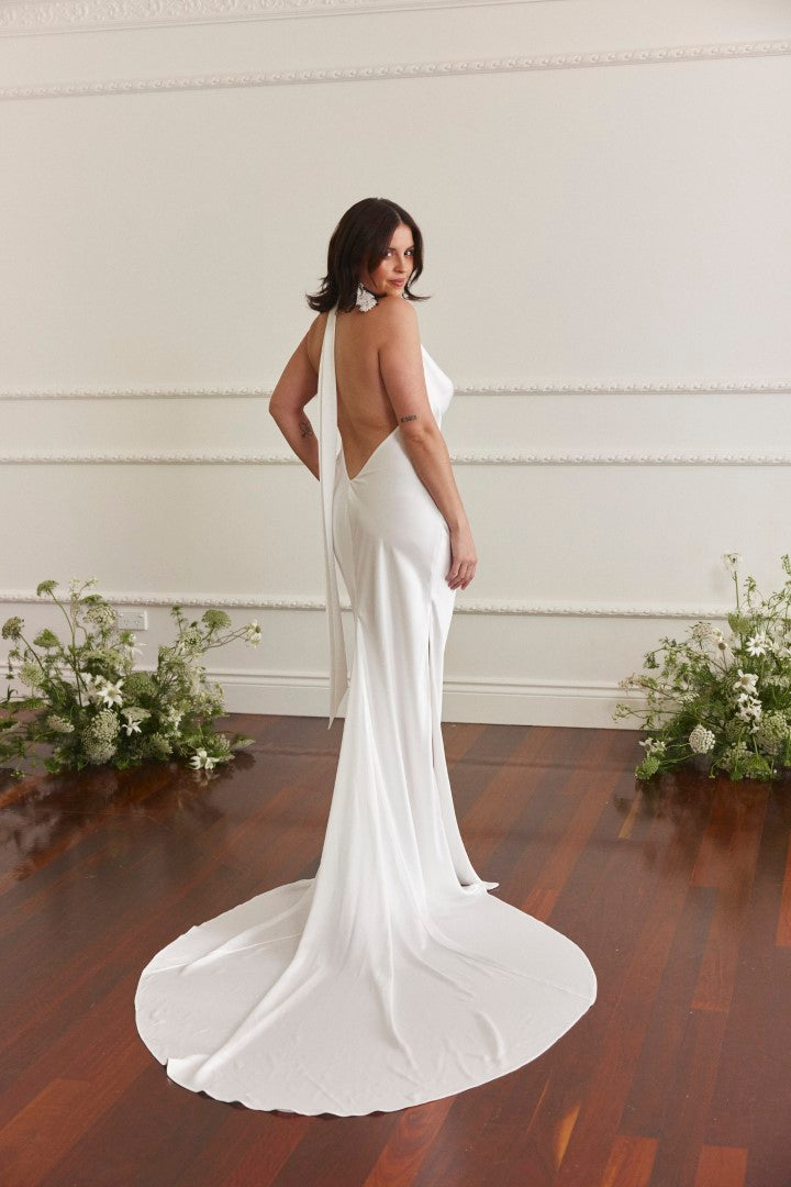 Confident and captivating, Suki by Grace Loves Lace is crafted from luxe pearl satin for a sleek, show-stopping look. Featuring a feminine cowl neckline, bias-cut silhouette, and daring low back, Suki is designed for the bride who loves modern glamour. Effortlessly draped and reception-ready, this gown is made to turn heads from aisle to after-party.