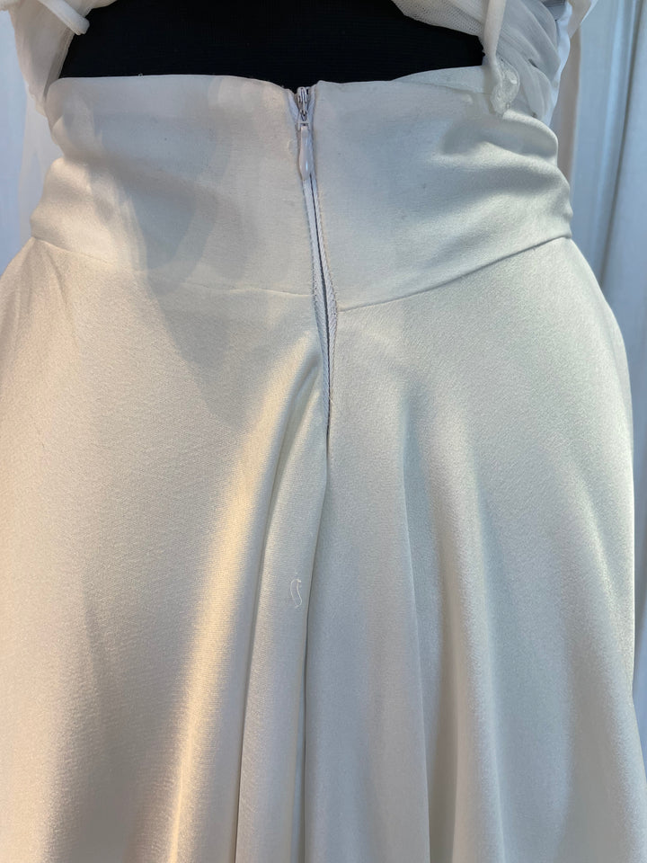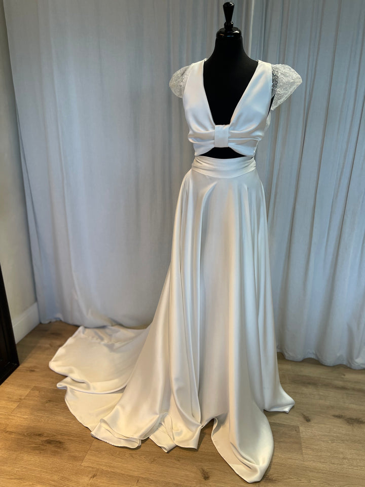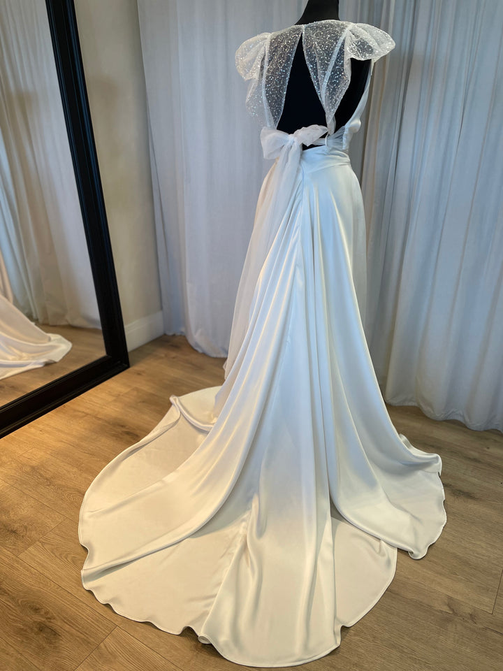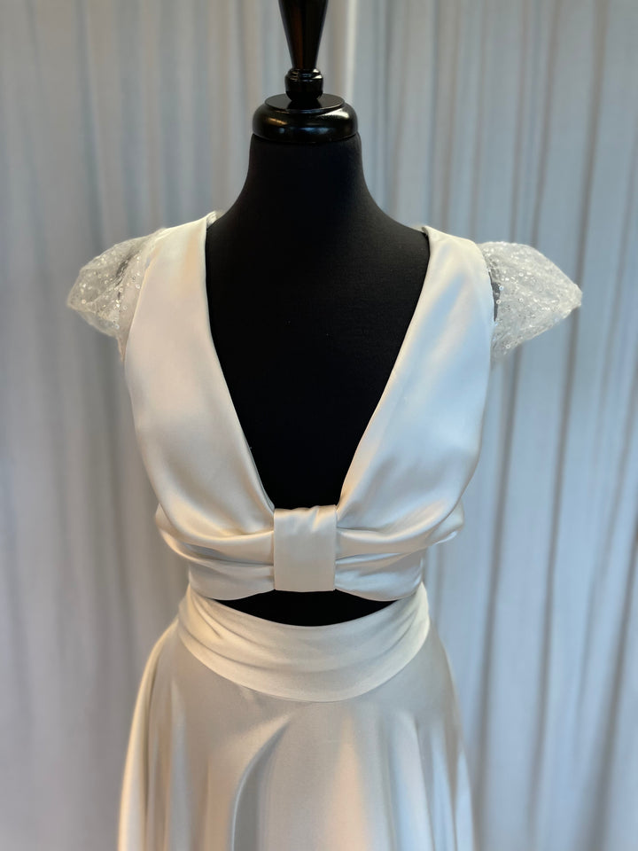 OK so she’s just cool! . The combination of sparkly sleeves, tie front detail and the open back is just so perfectly balanced that the overall look is unbeatable. Teamed with tulle ties that create the softest of bows and where can you go wrong. Wear with the Indie Skirt or of any of the other flexible Ella Kate separates., for the ultimate modern bridal looks. Definitely a piece you will want to wear again and again.