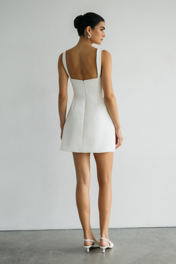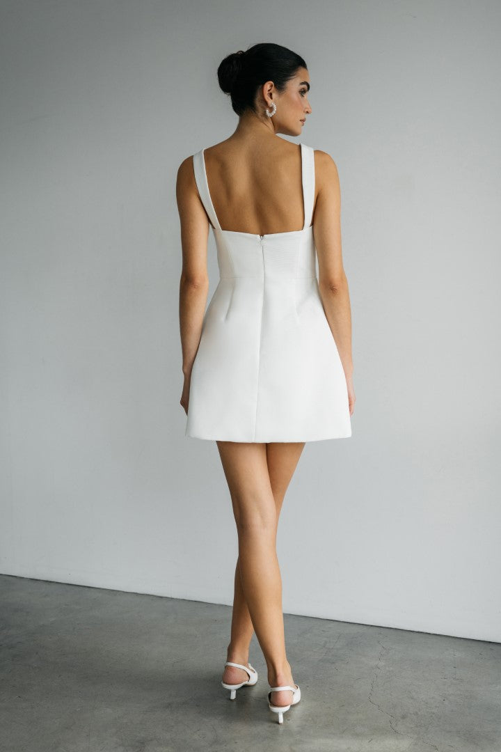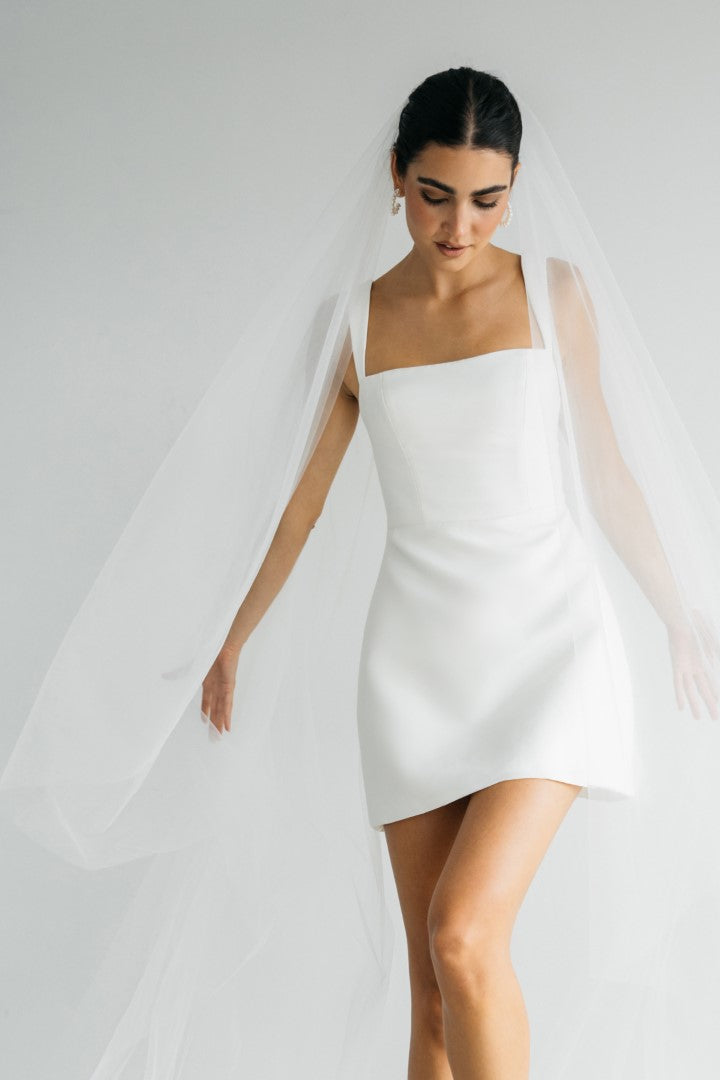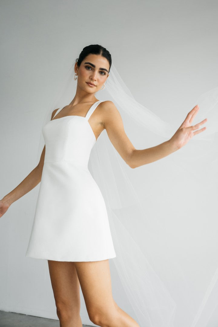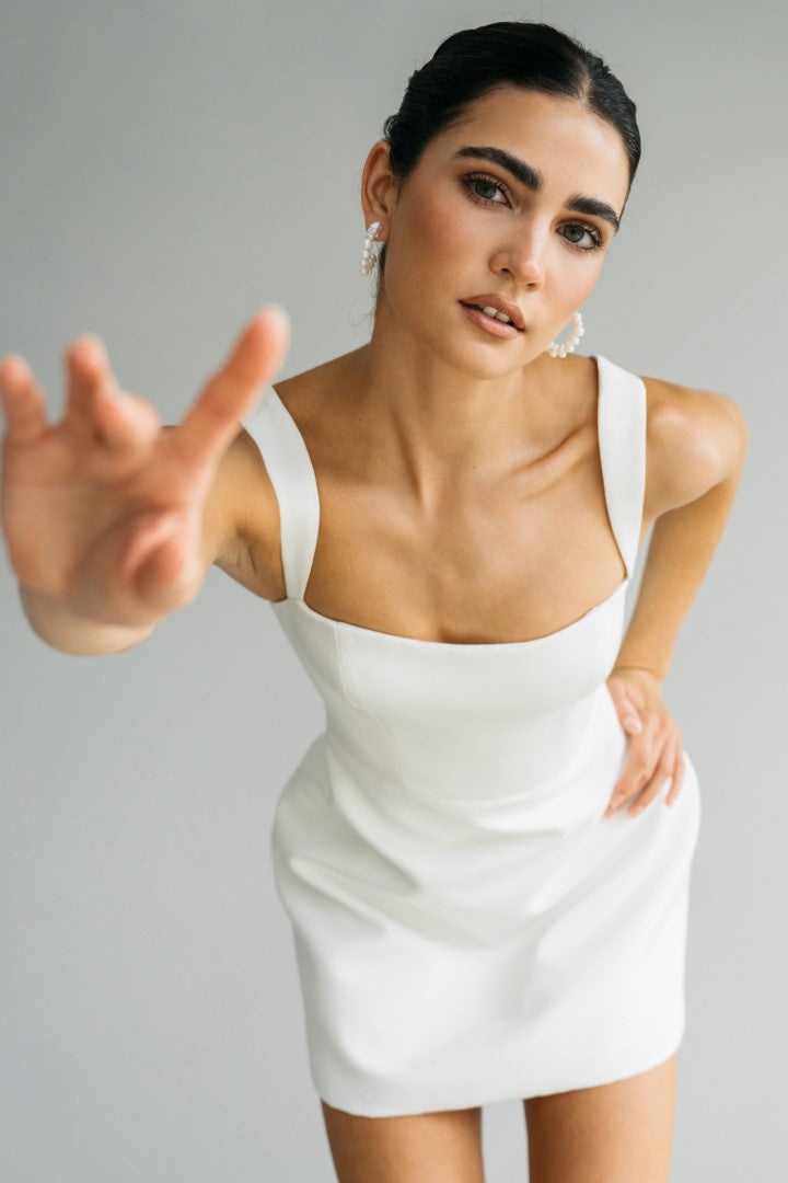 Sleek and chic, Camille by Jenny Yoo is a flirtatious mini dress with clean lines and a modern silhouette. Perfect for your bridal shower, hen party, or after-party look.