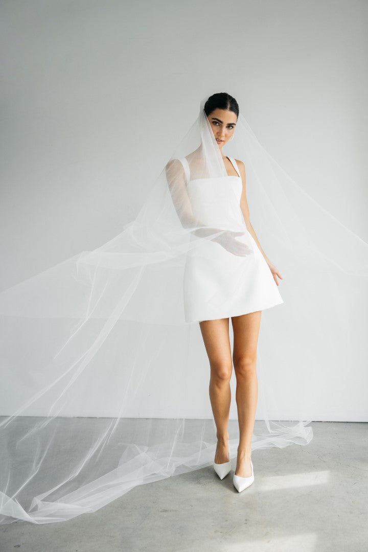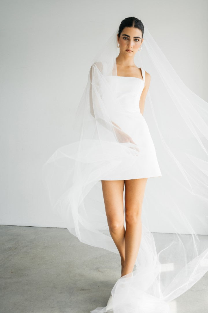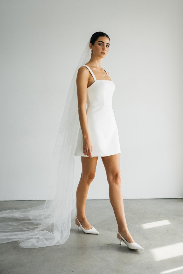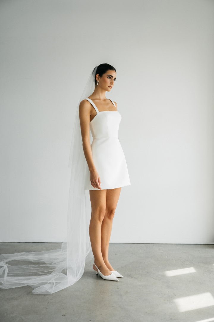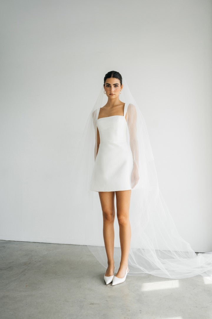 Sleek and chic, Camille by Jenny Yoo is a flirtatious mini dress with clean lines and a modern silhouette. Perfect for your bridal shower, hen party, or after-party look.