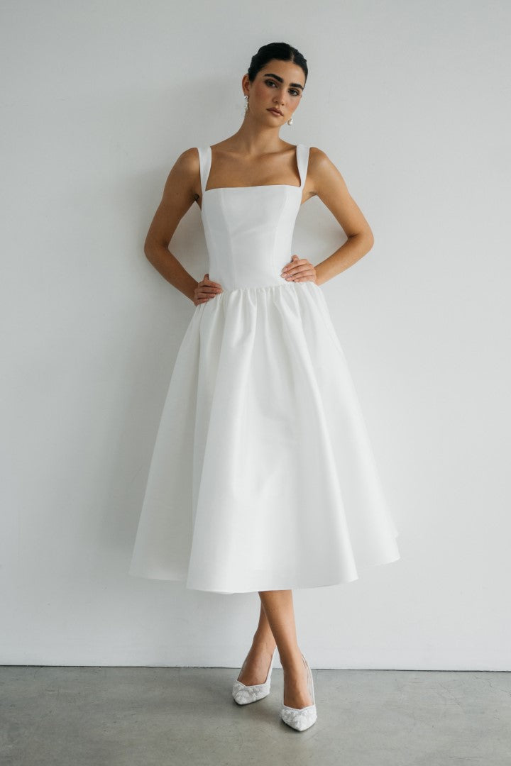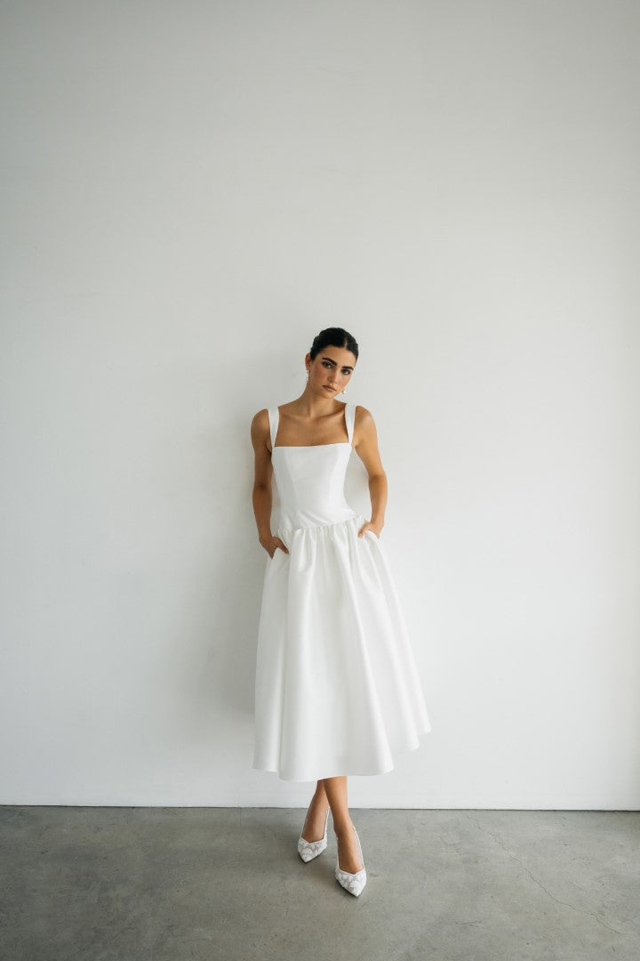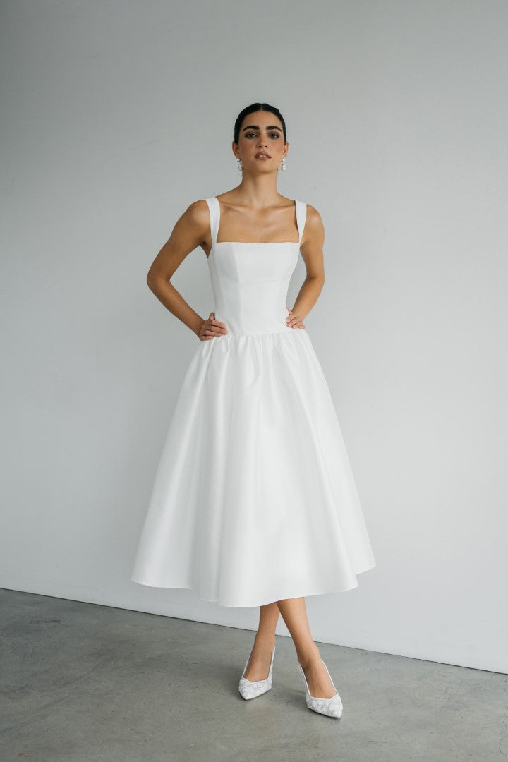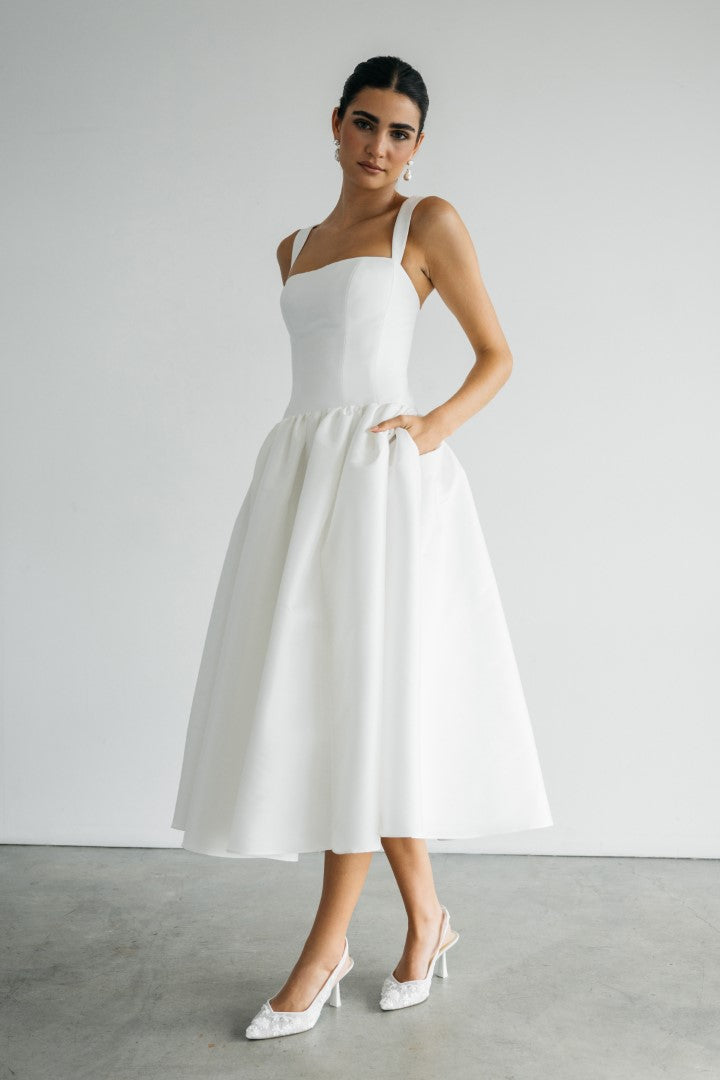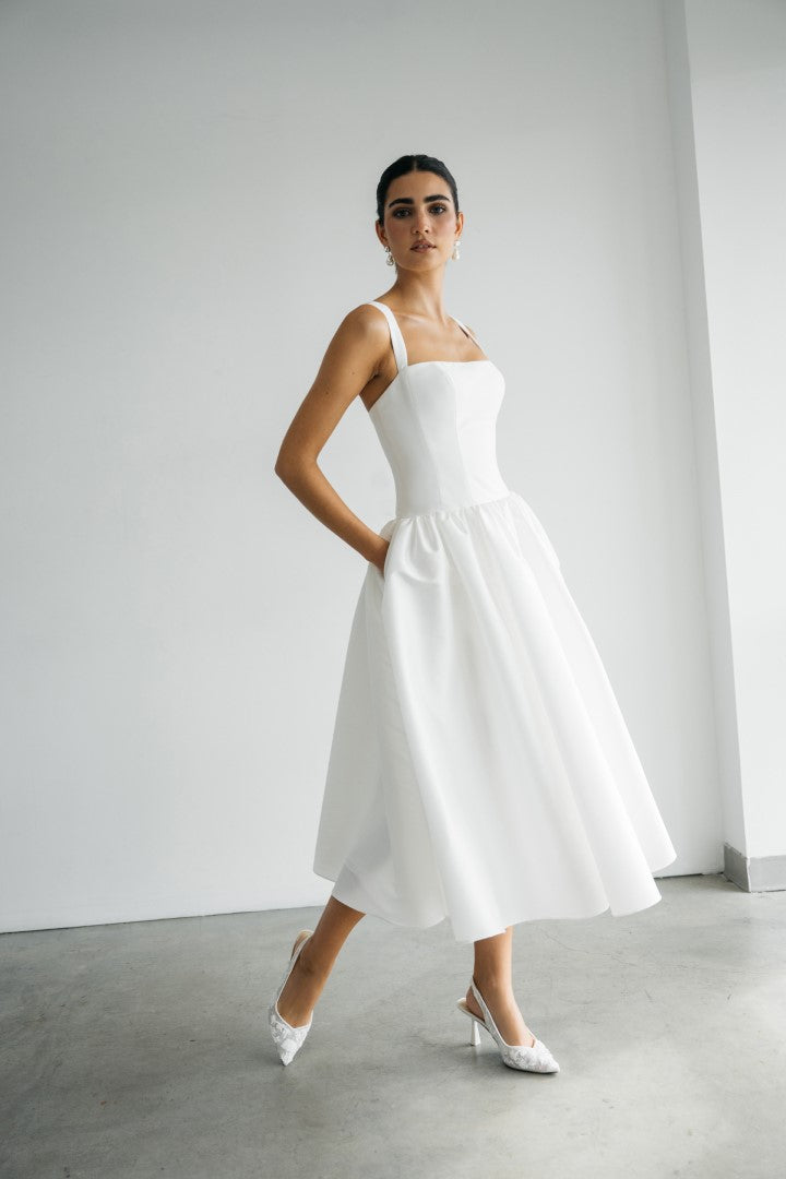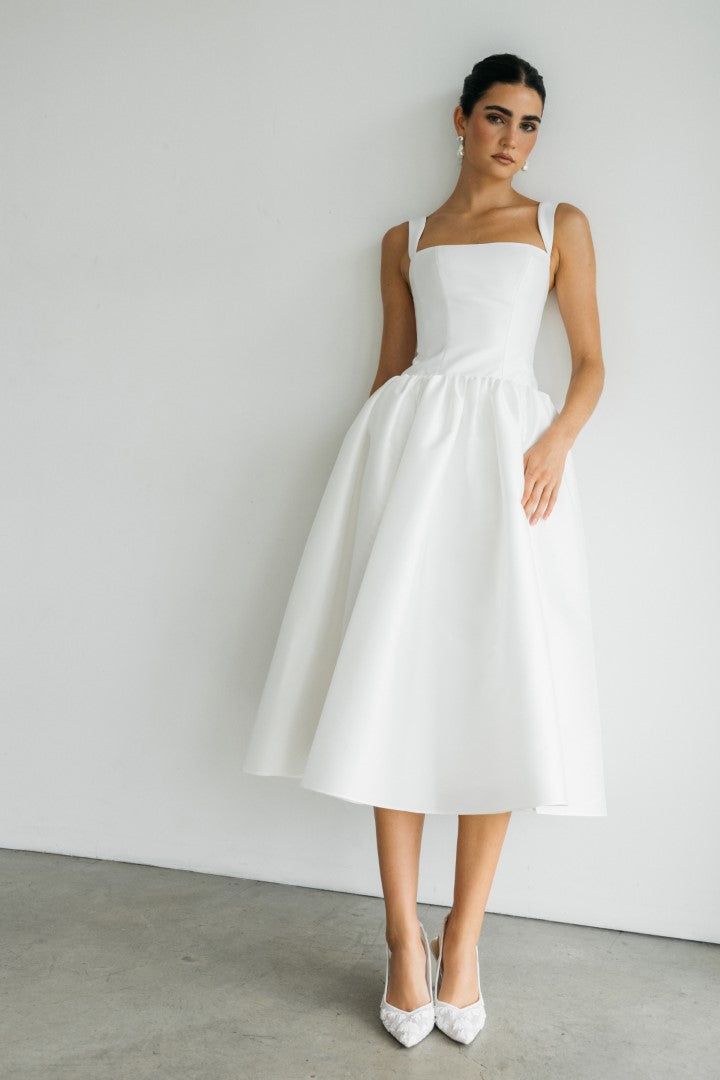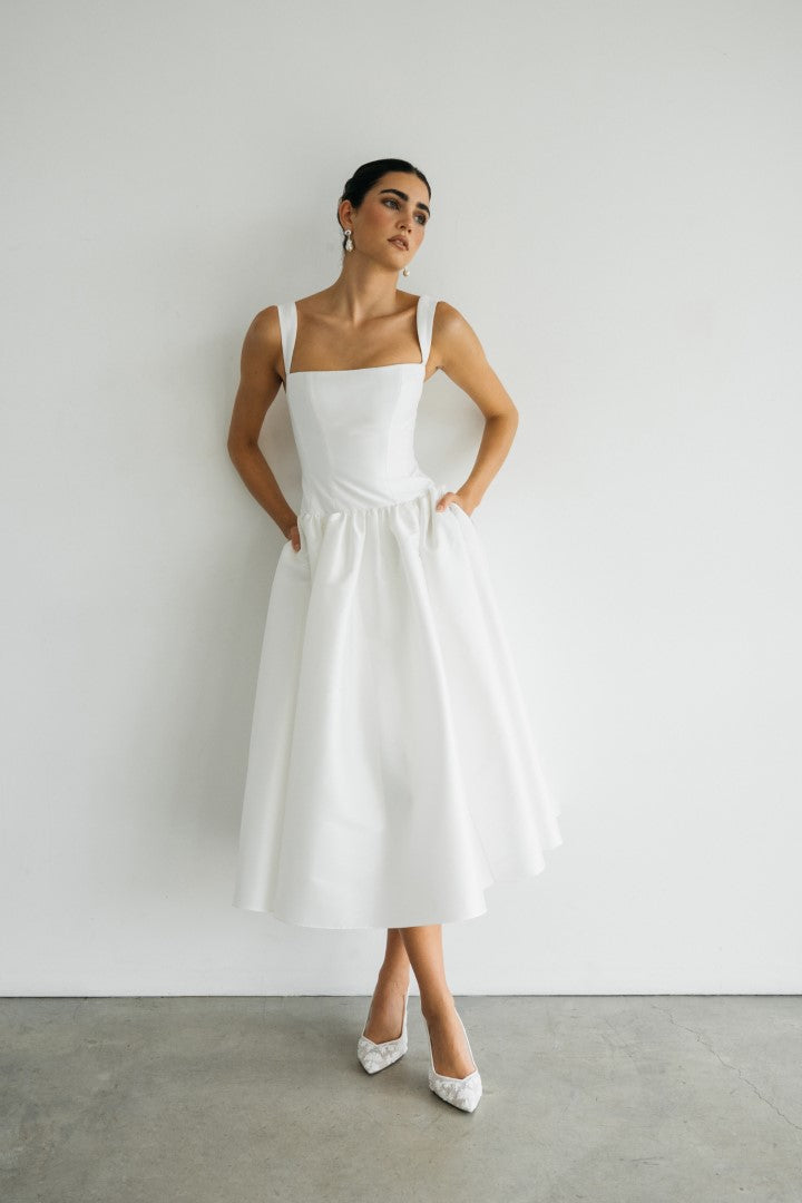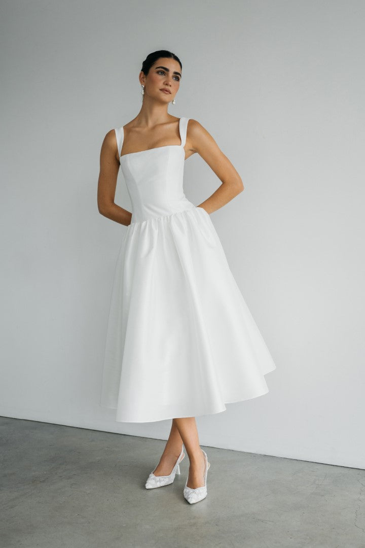 Lucille by Jenny Yoo is the ultimate “Little White Dress” — timeless, playful, and effortlessly chic. Crafted from lightweight Luxe Taffeta, she features a structured bodice, thick straps, and a flattering square neckline. Her T-length full skirt and hidden pockets add a fun, Audrey Hepburn-inspired twist — perfect for bridal showers, rehearsal dinners, or a reception-ready second look.