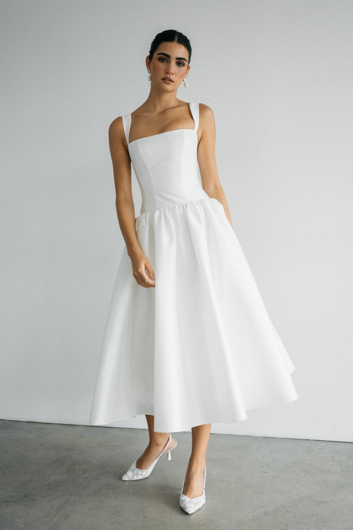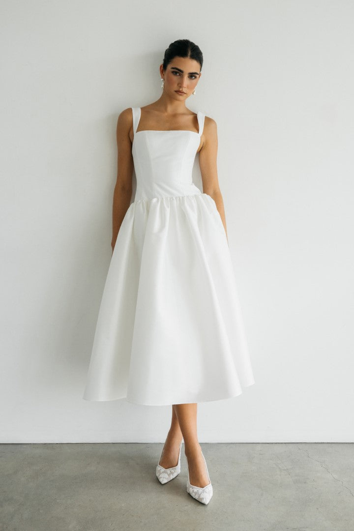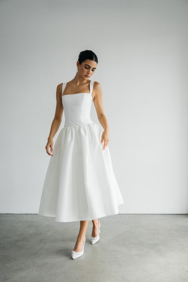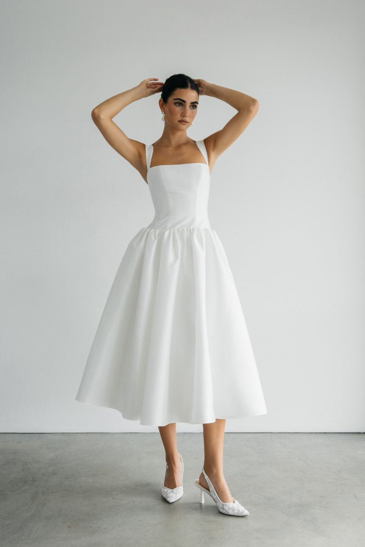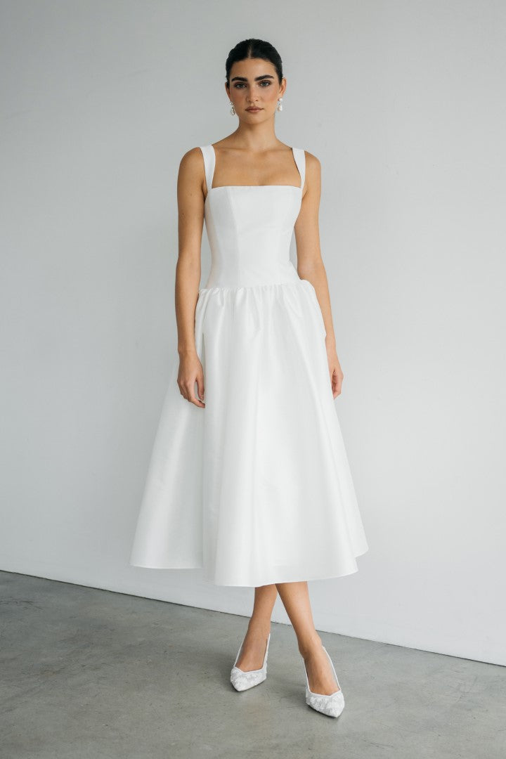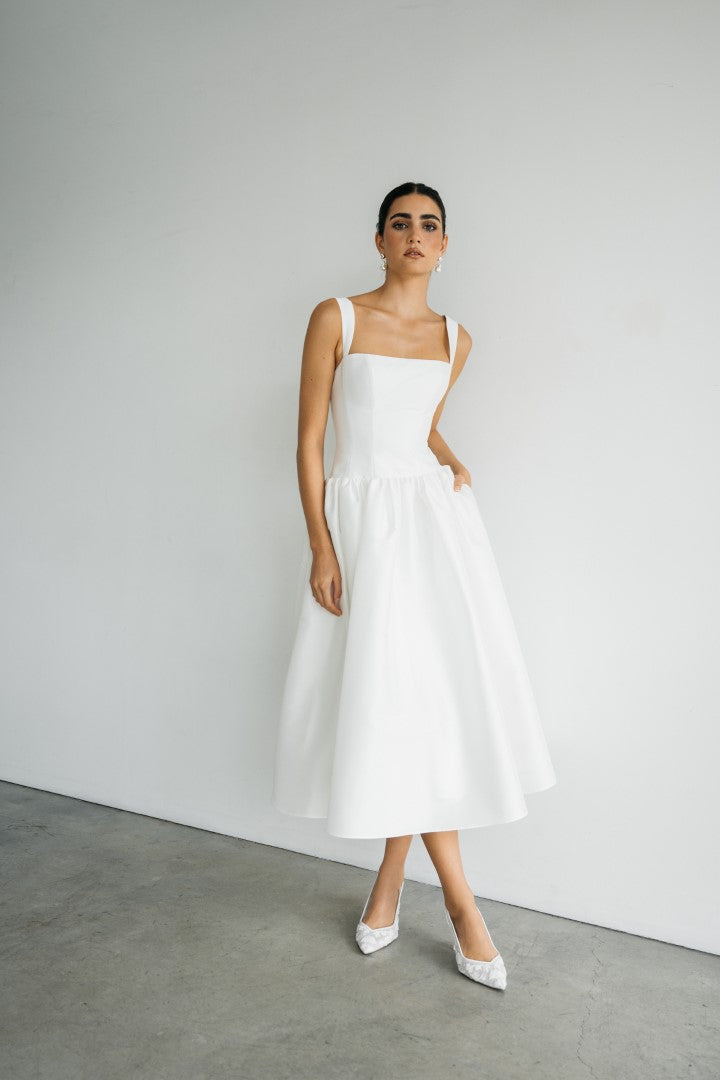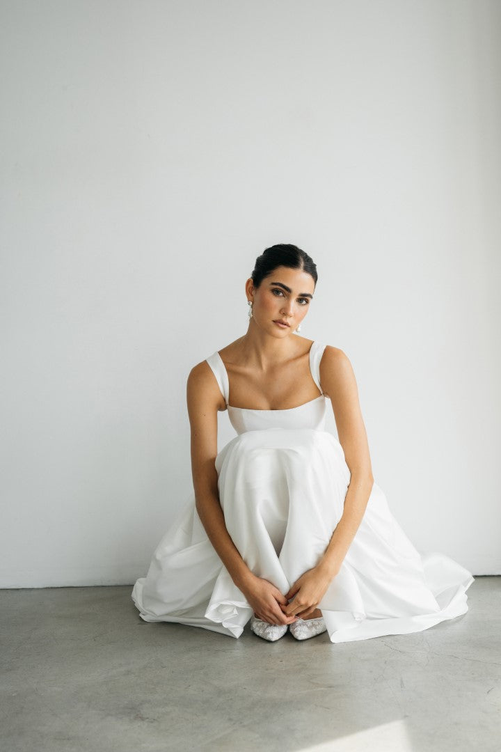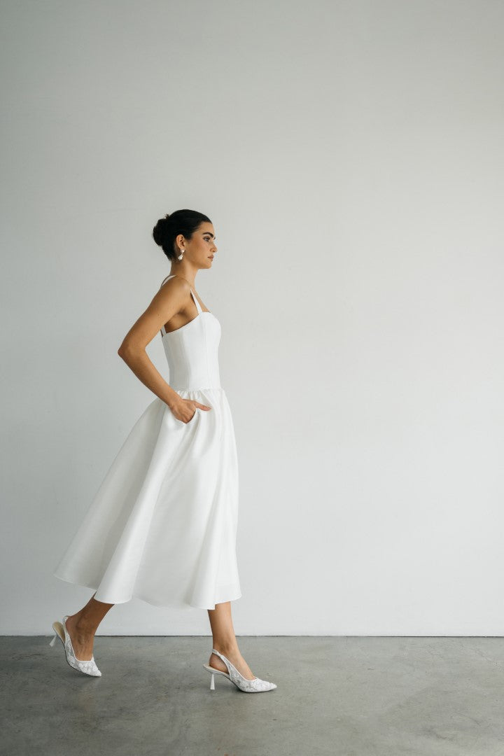 Lucille by Jenny Yoo is the ultimate “Little White Dress” — timeless, playful, and effortlessly chic. Crafted from lightweight Luxe Taffeta, she features a structured bodice, thick straps, and a flattering square neckline. Her T-length full skirt and hidden pockets add a fun, Audrey Hepburn-inspired twist — perfect for bridal showers, rehearsal dinners, or a reception-ready second look.