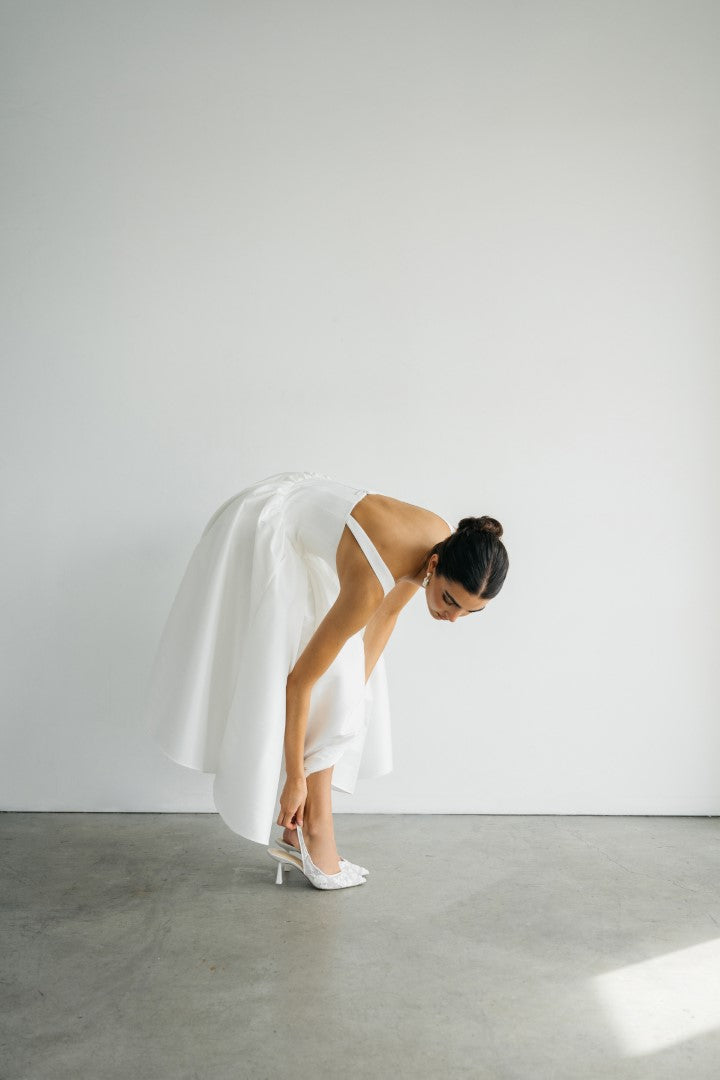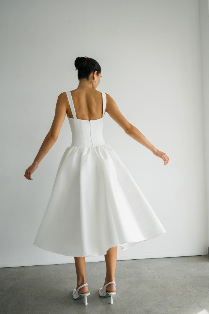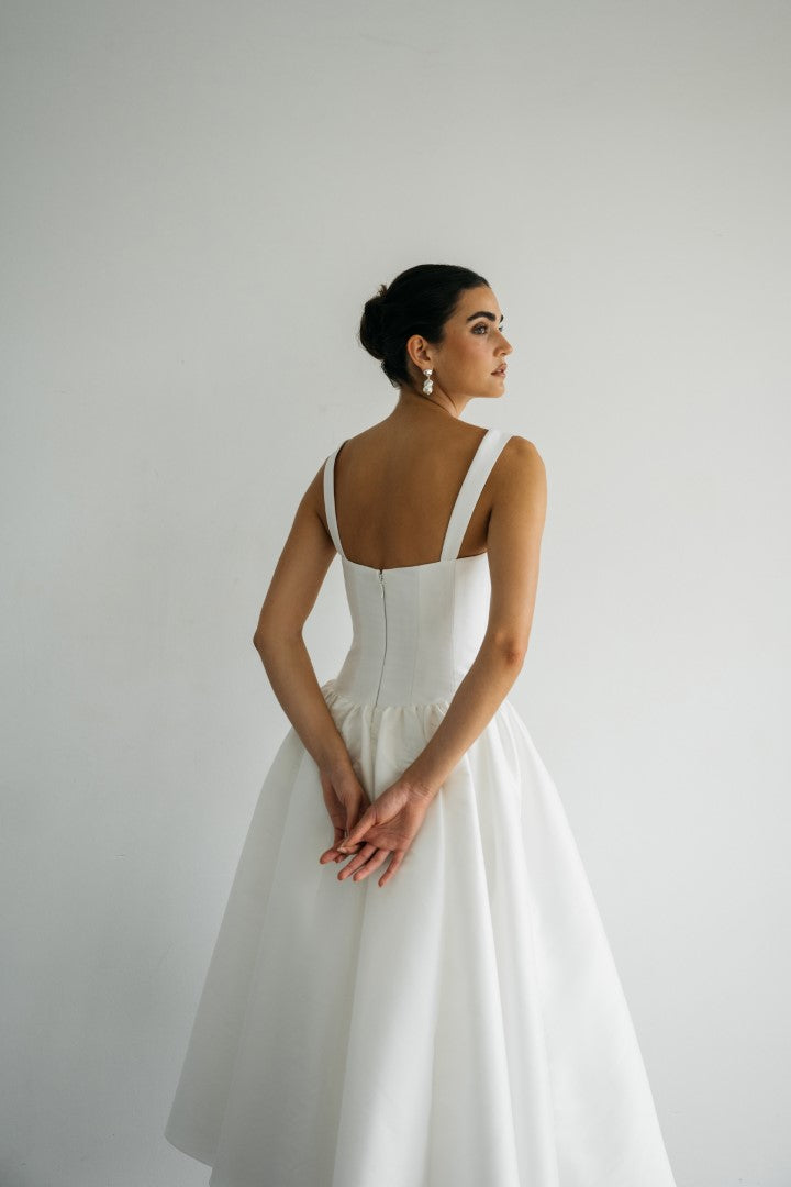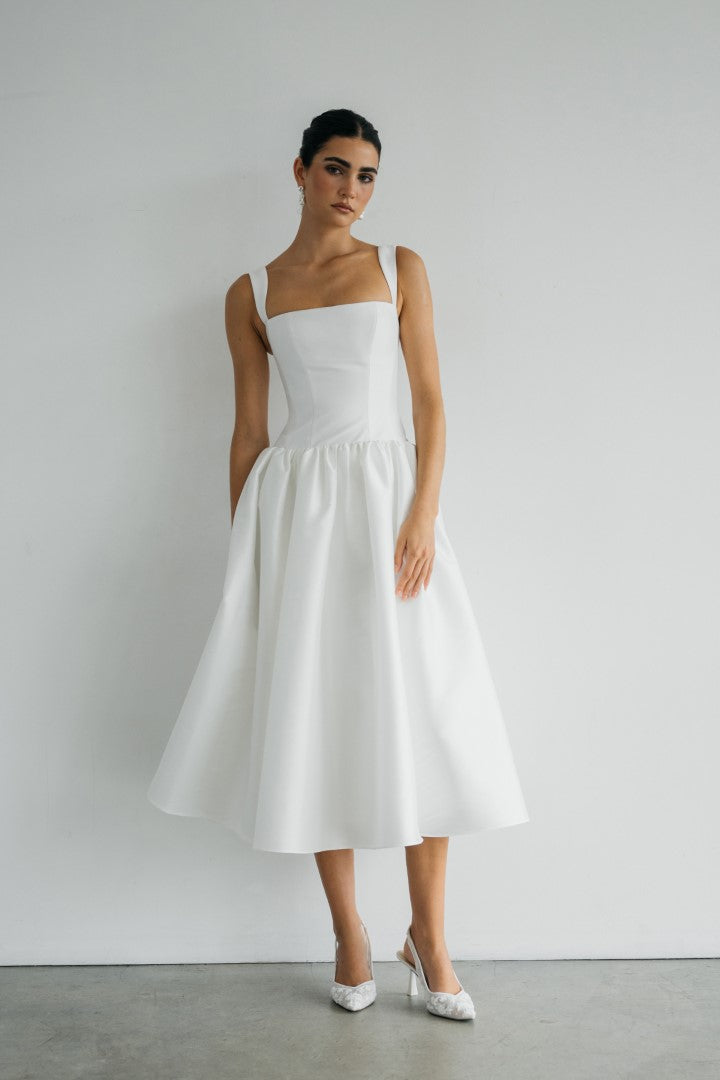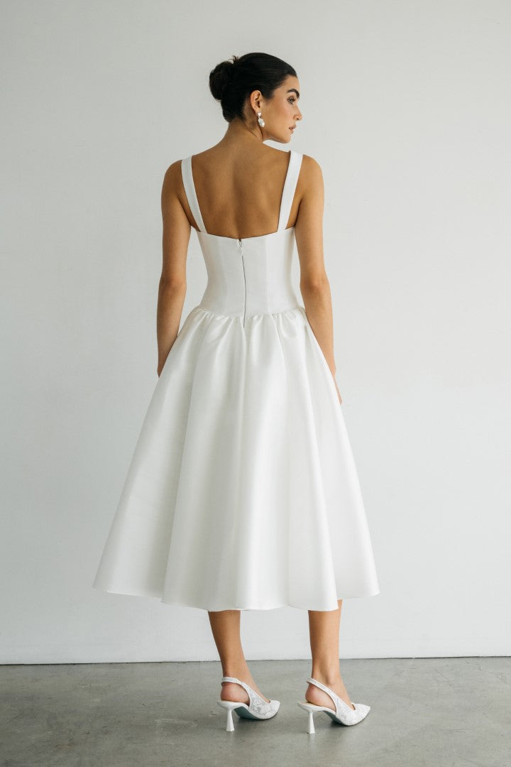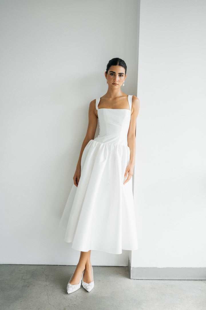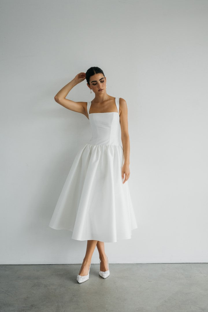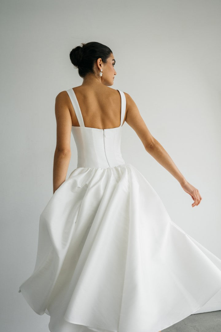 Lucille by Jenny Yoo is the ultimate “Little White Dress” — timeless, playful, and effortlessly chic. Crafted from lightweight Luxe Taffeta, she features a structured bodice, thick straps, and a flattering square neckline. Her T-length full skirt and hidden pockets add a fun, Audrey Hepburn-inspired twist — perfect for bridal showers, rehearsal dinners, or a reception-ready second look.