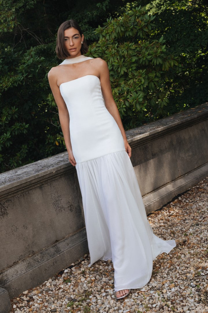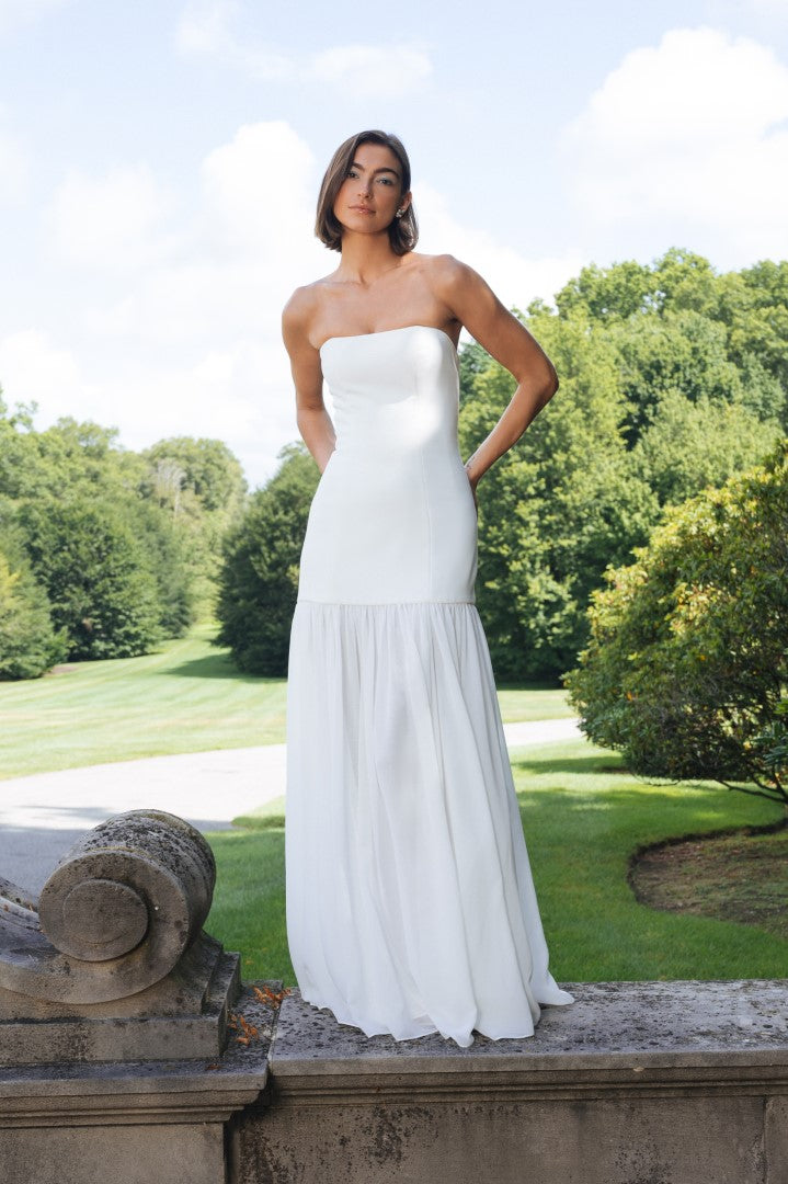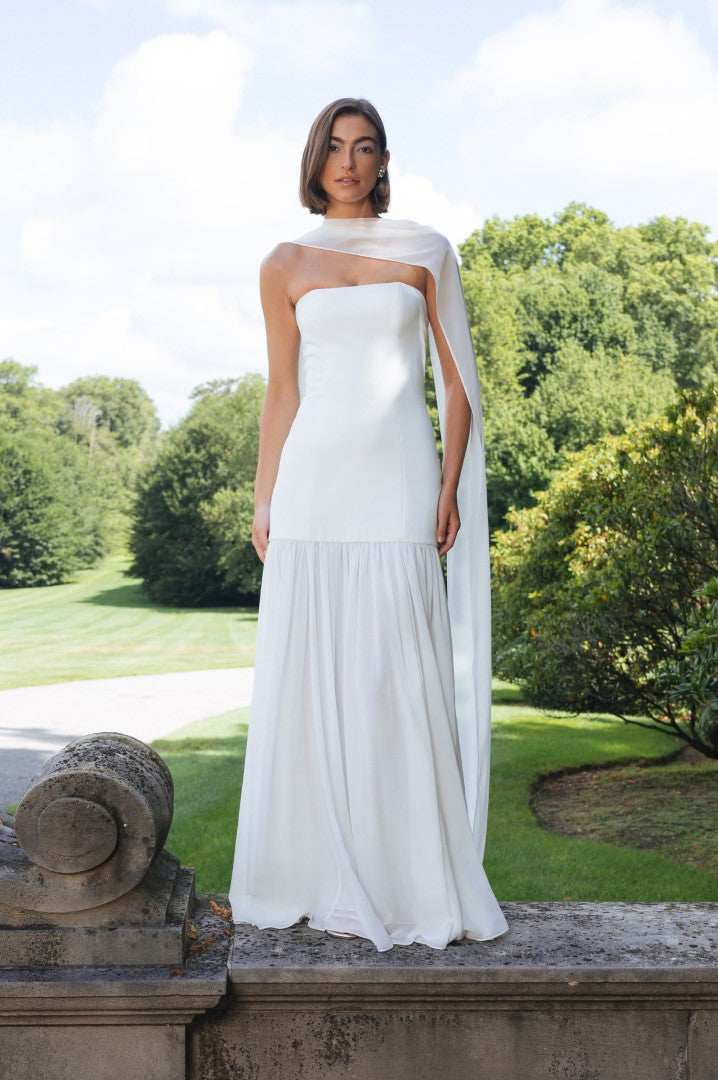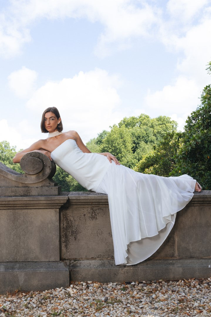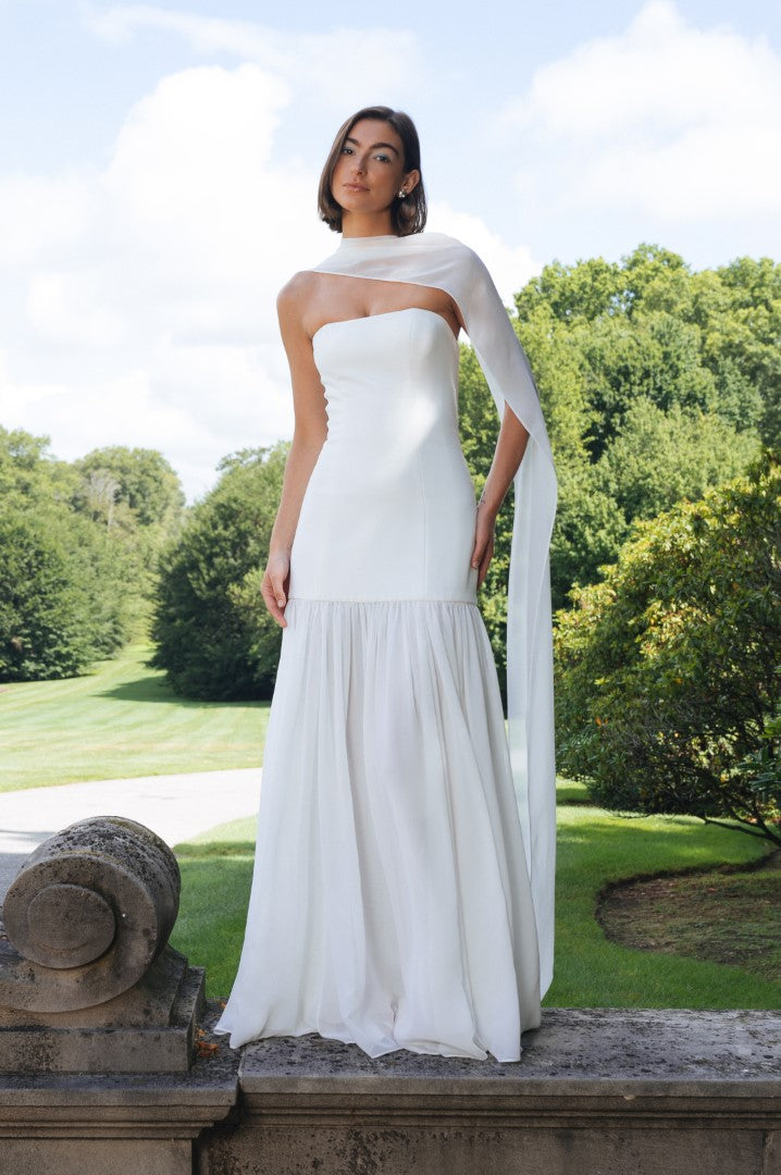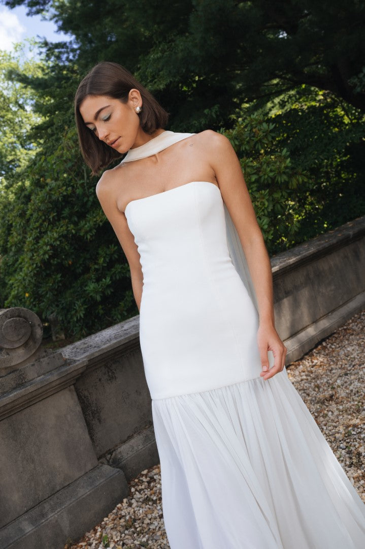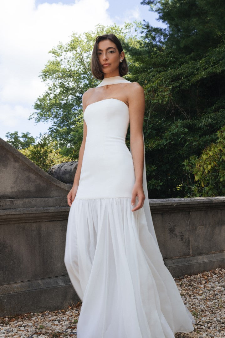 Elegant yet playful, Matilda by Jenny Yoo layers a structured mini with a flowing chiffon overskirt. A dress of contrasts—modern, romantic, and timeless.