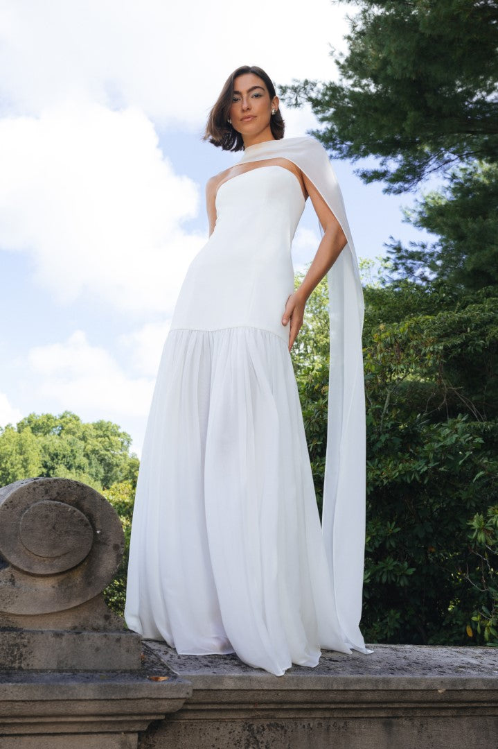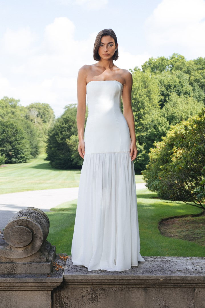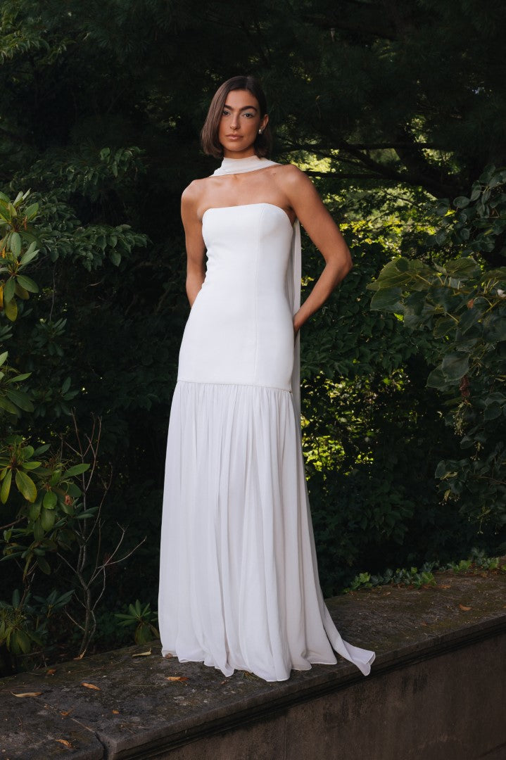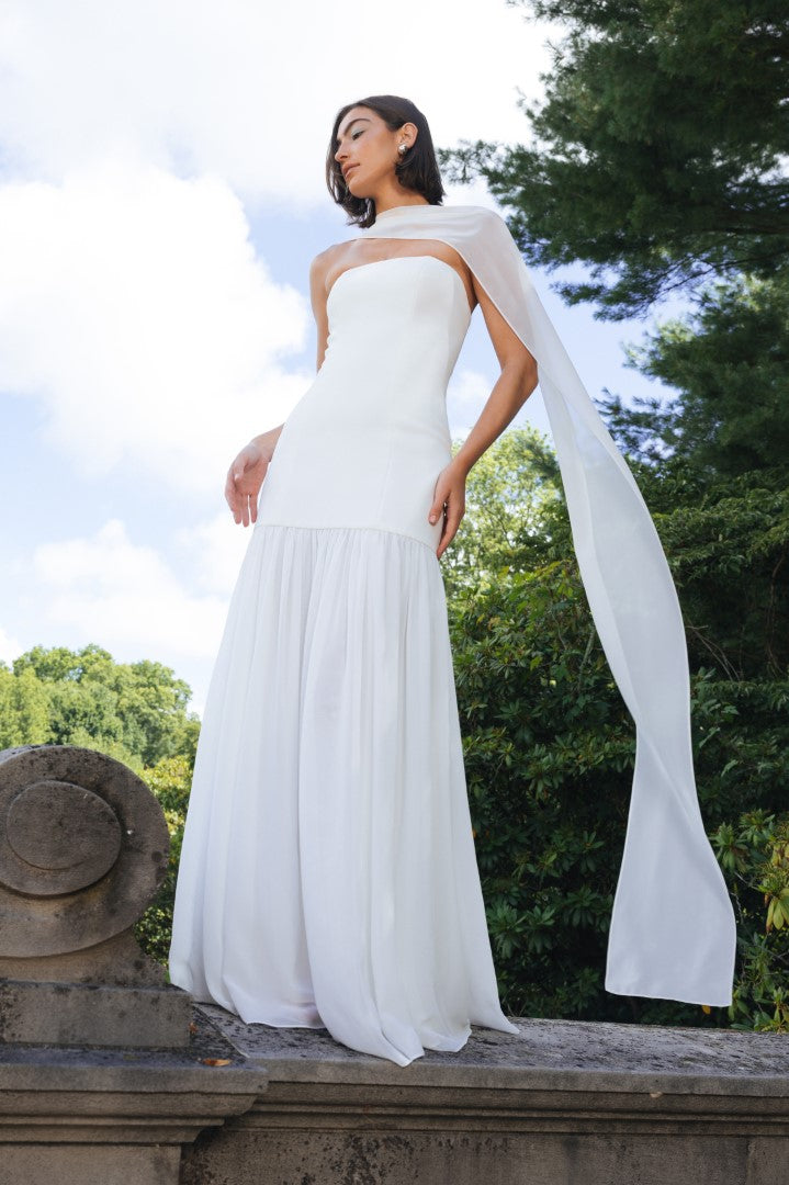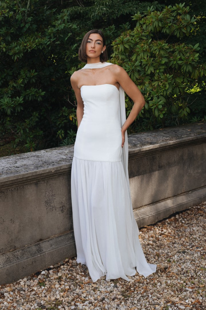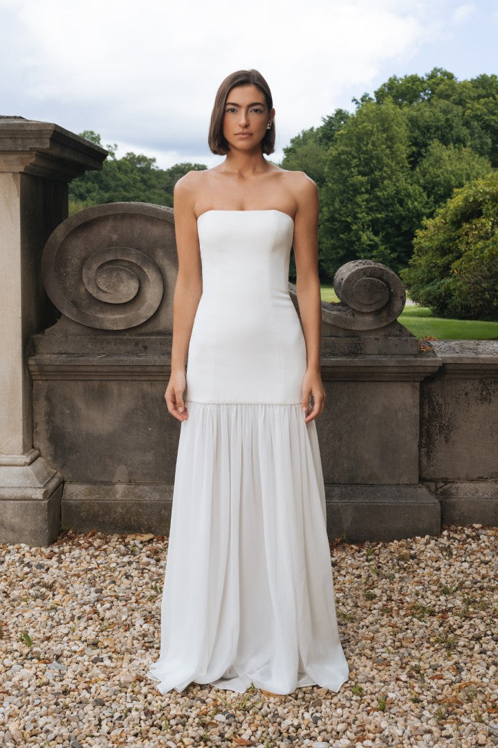 Elegant yet playful, Matilda by Jenny Yoo layers a structured mini with a flowing chiffon overskirt. A dress of contrasts—modern, romantic, and timeless.