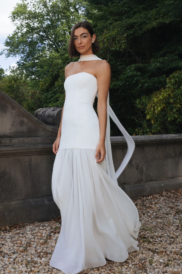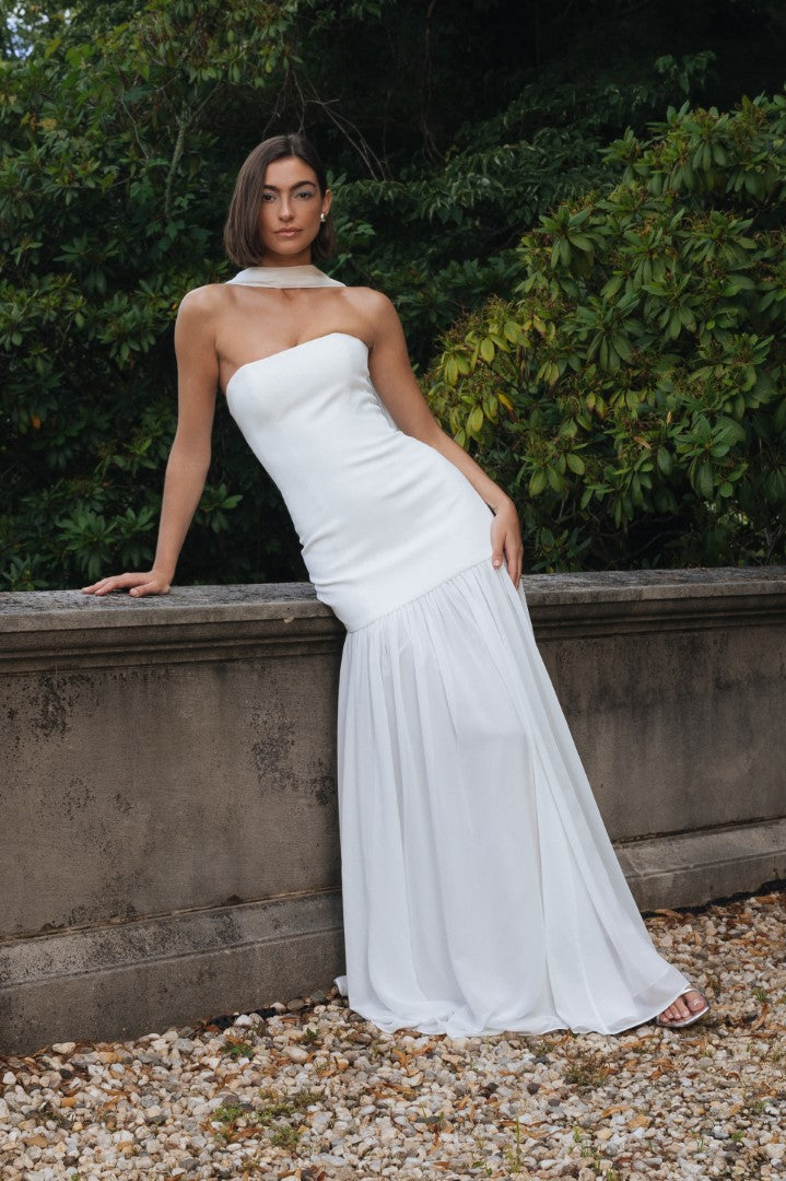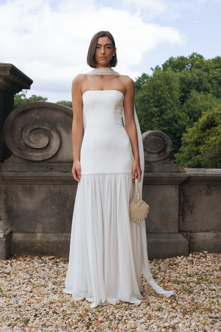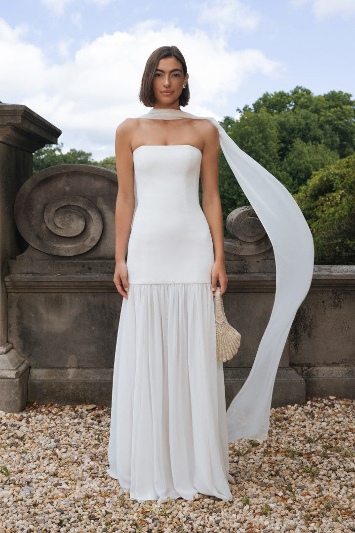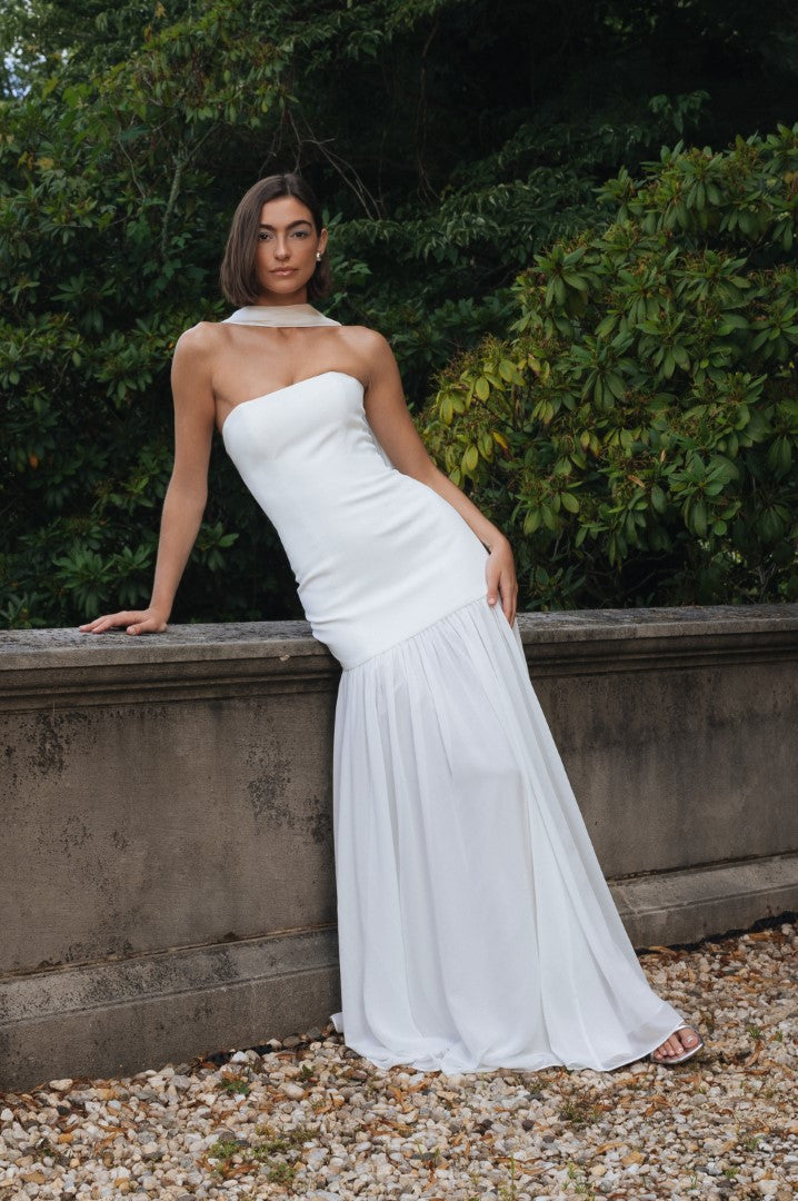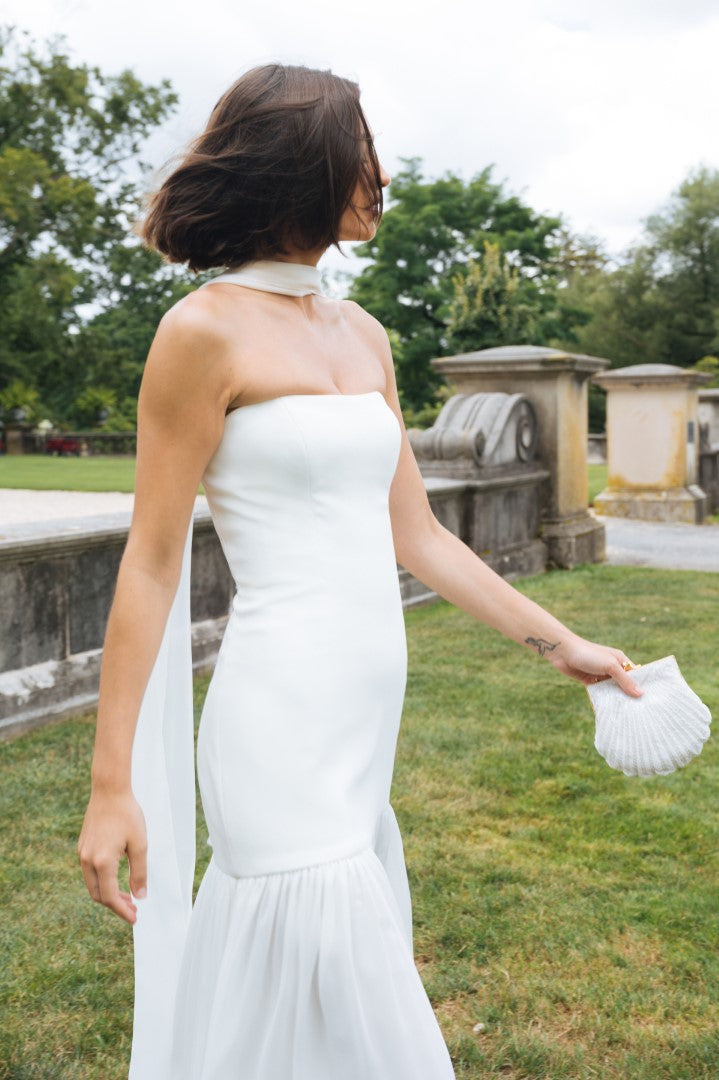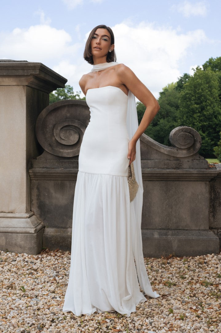 Elegant yet playful, Matilda by Jenny Yoo layers a structured mini with a flowing chiffon overskirt. A dress of contrasts—modern, romantic, and timeless.