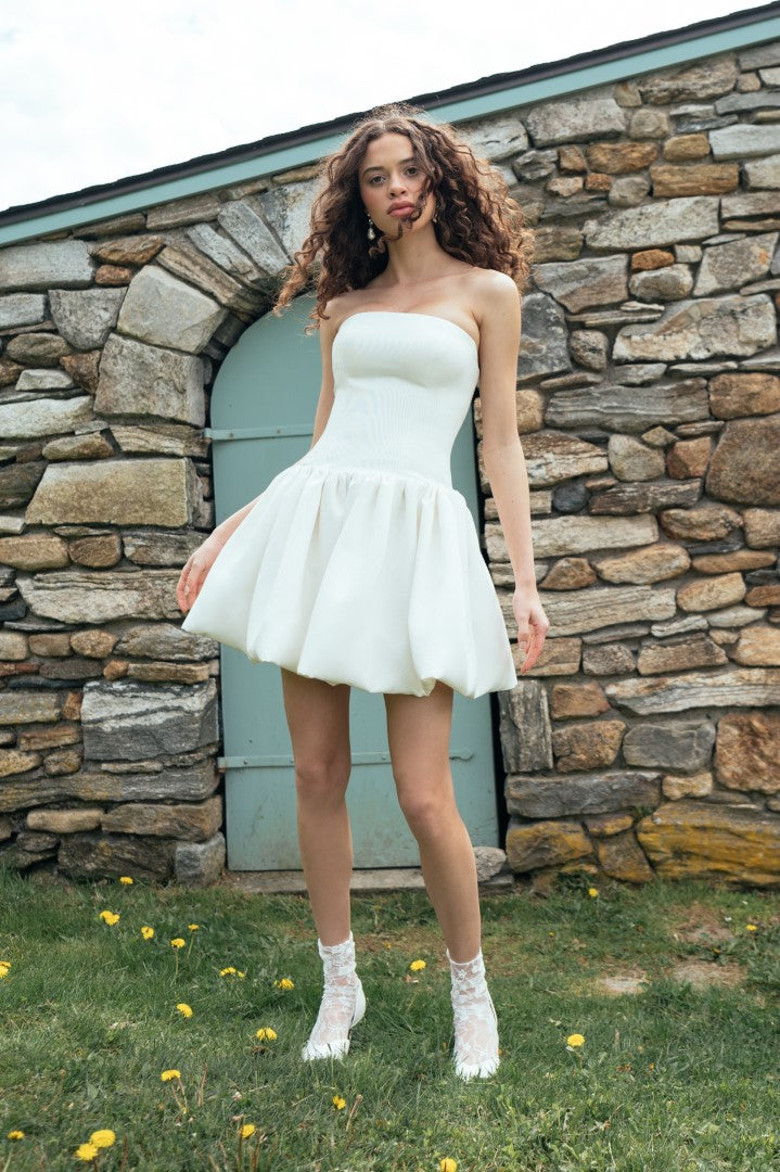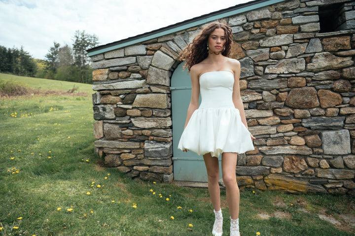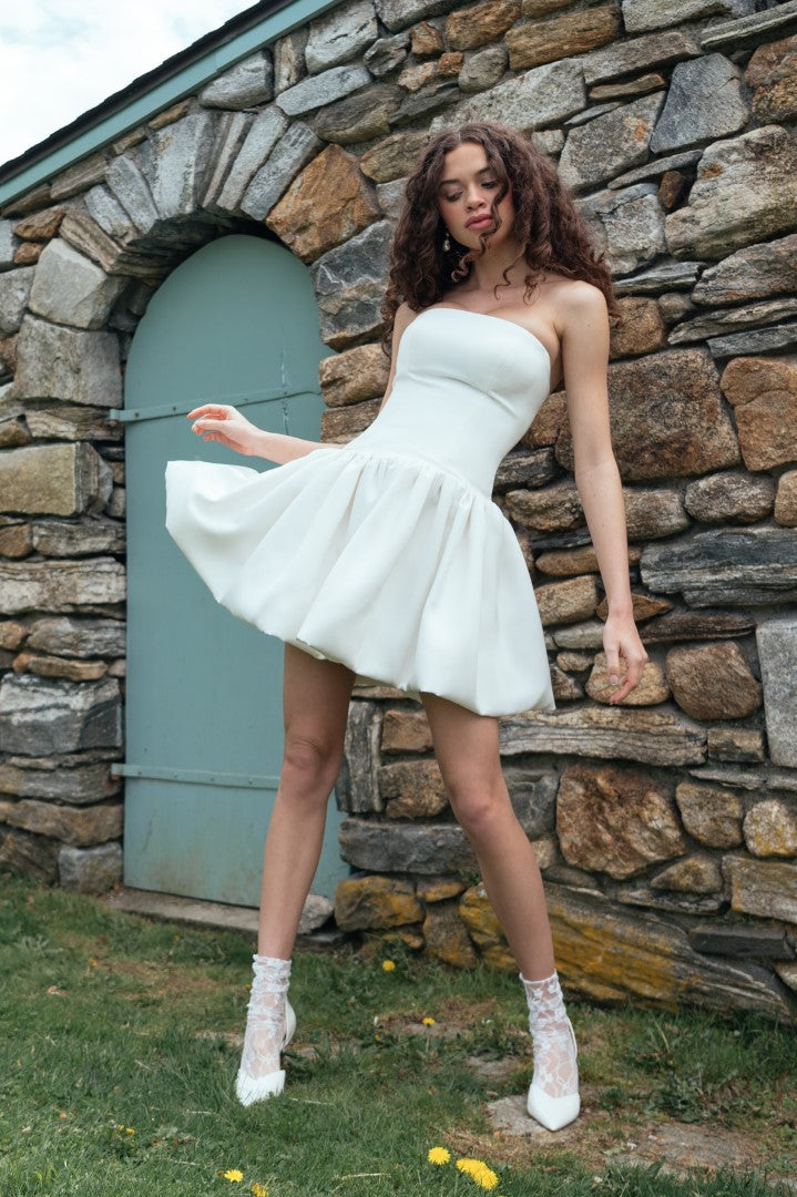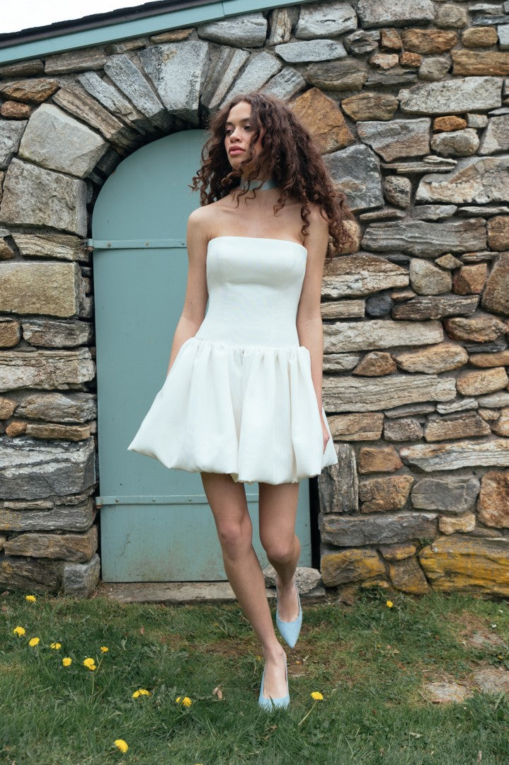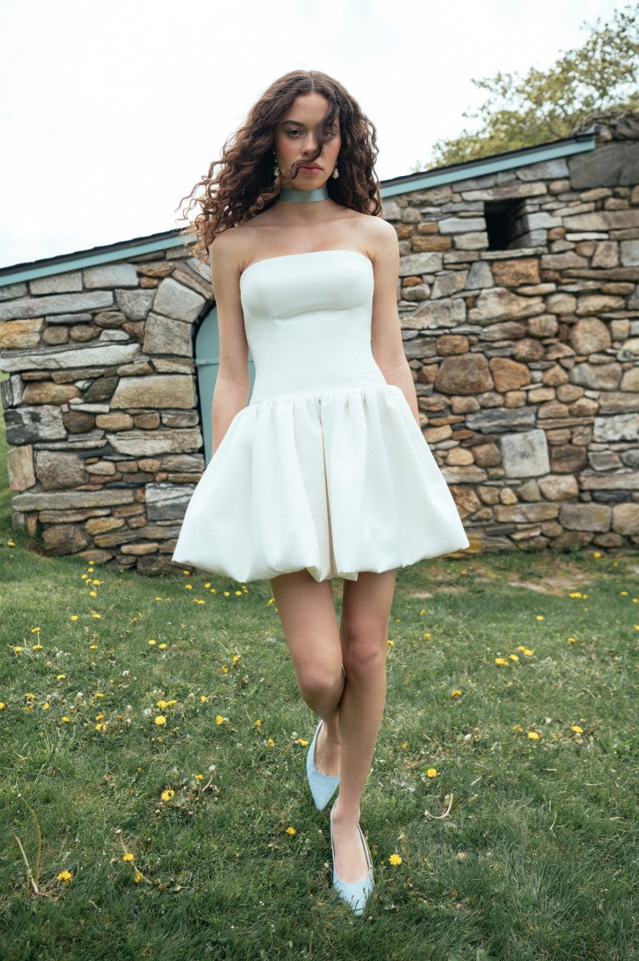 Fun and refined, Tinsley by Jenny Yoo features a chic straight neckline, dropped waist, and bubble skirt with hidden pockets. A playful yet elegant party mini.