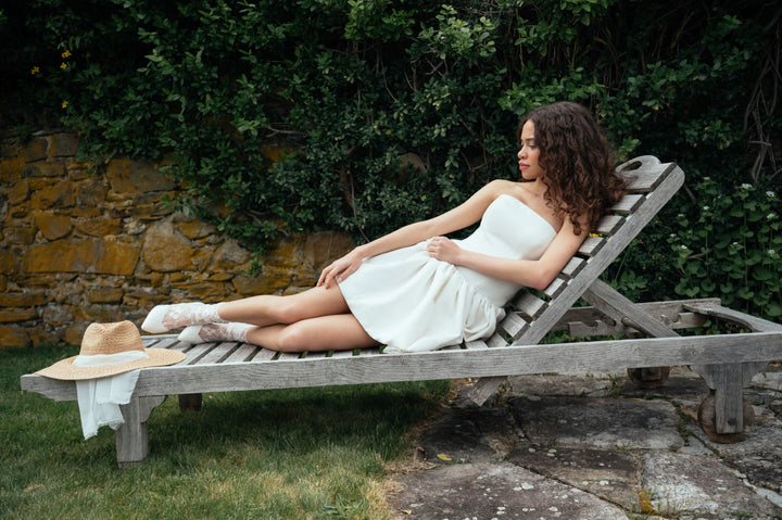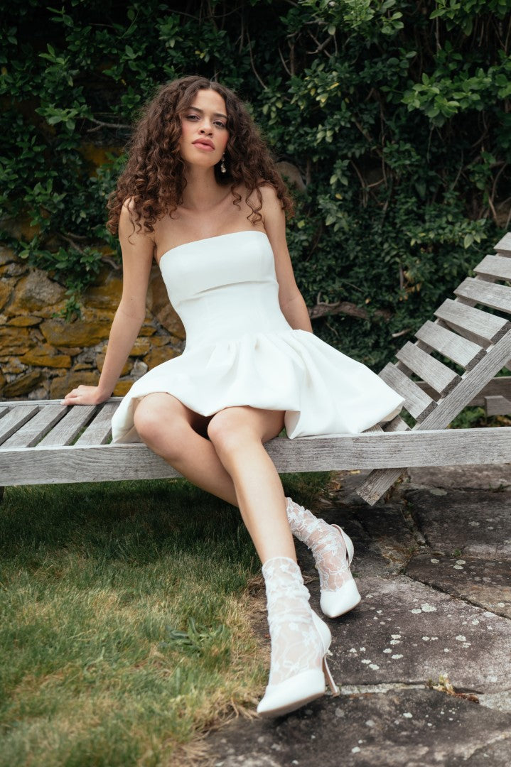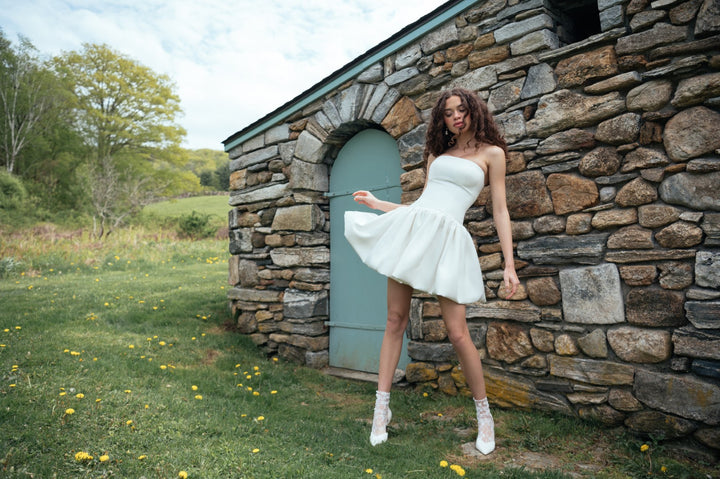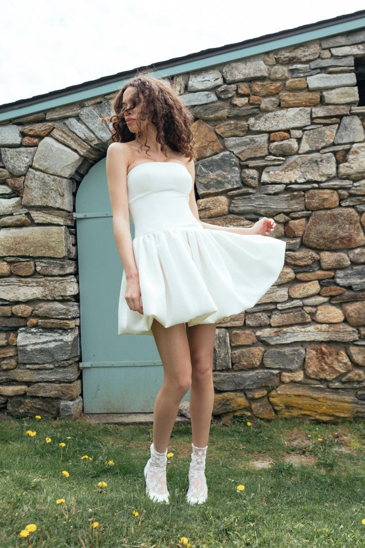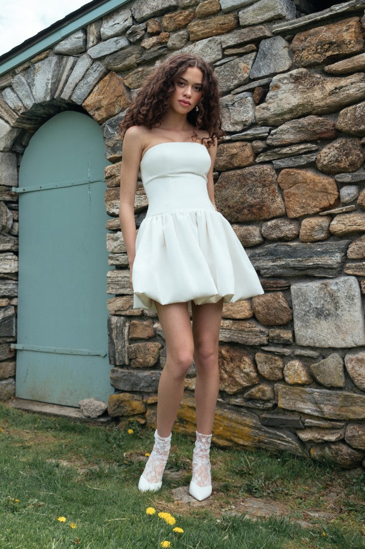 Fun and refined, Tinsley by Jenny Yoo features a chic straight neckline, dropped waist, and bubble skirt with hidden pockets. A playful yet elegant party mini.