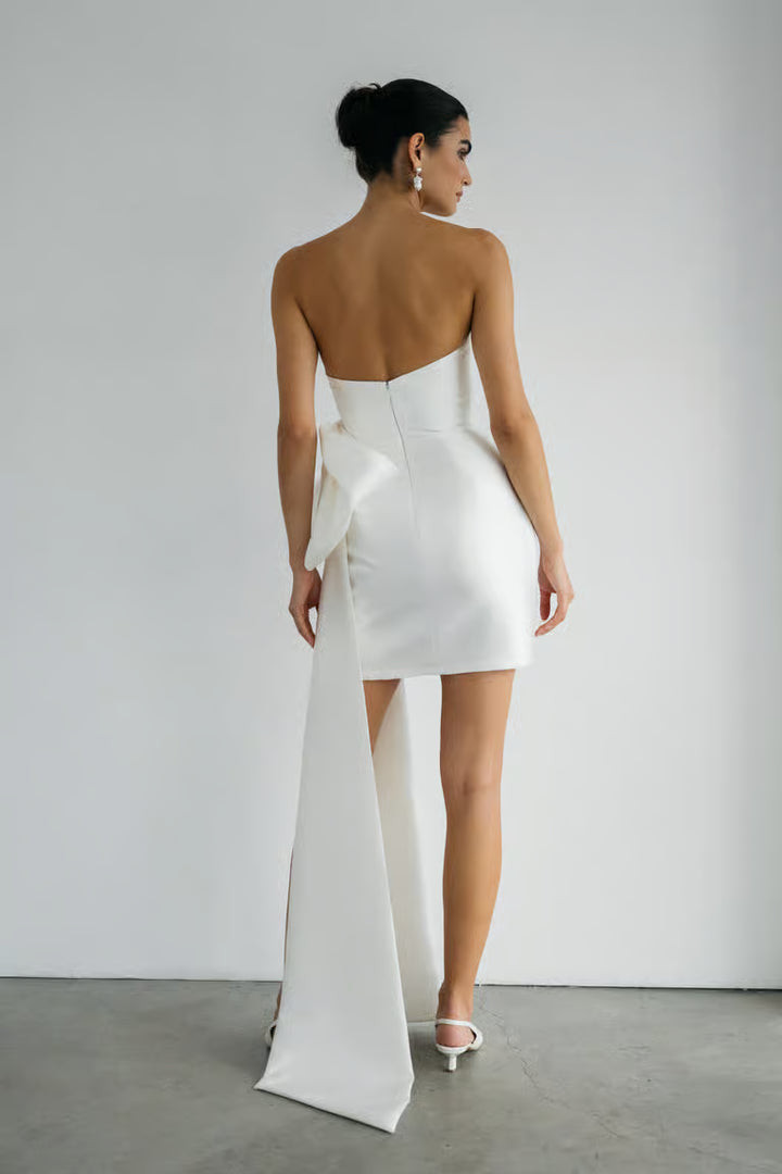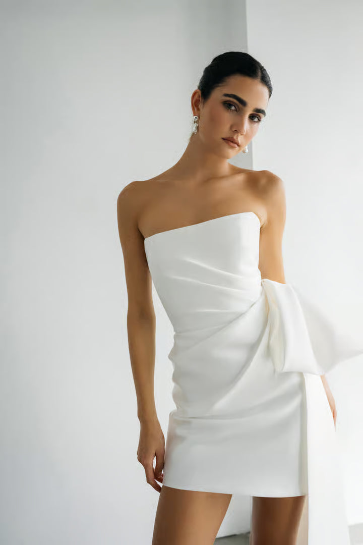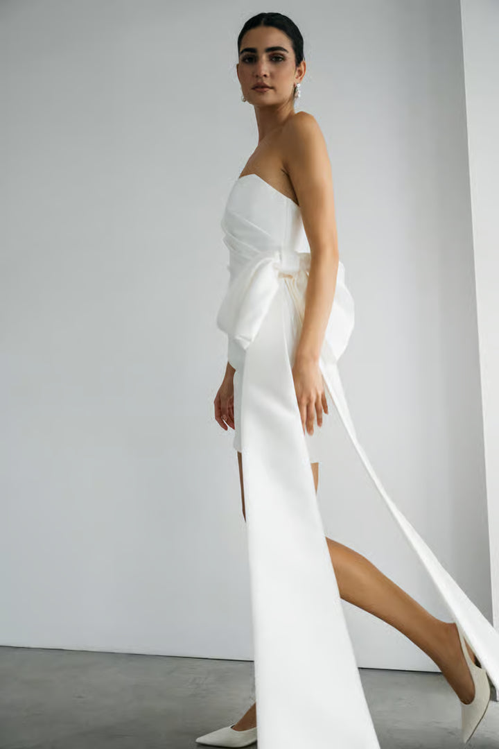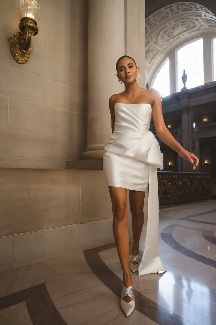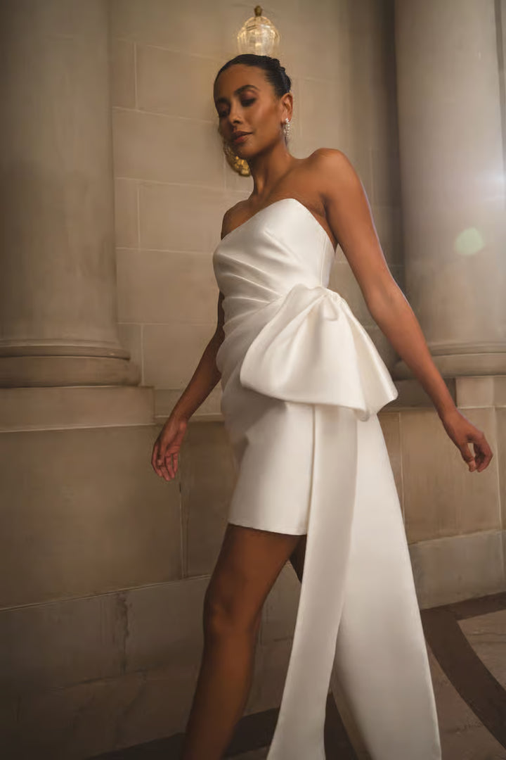 Winnie by Jenny Yoo is a modern mini made for the contemporary bride. Crafted from structured ivory Mikado, she features sculpting pleat details and a statement draped bow for a touch of drama. With a strapless neckline, built-in bust cups, and boning for perfect support, Winnie is the ultimate choice for a second look, civil ceremony, or stylish bridal event.