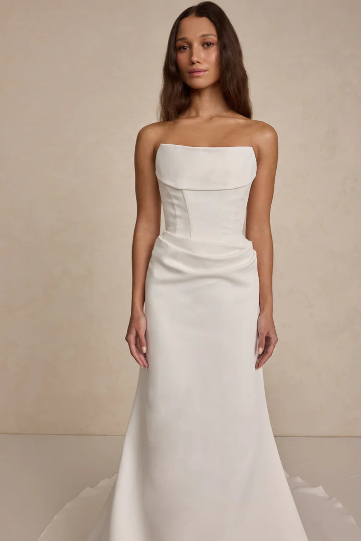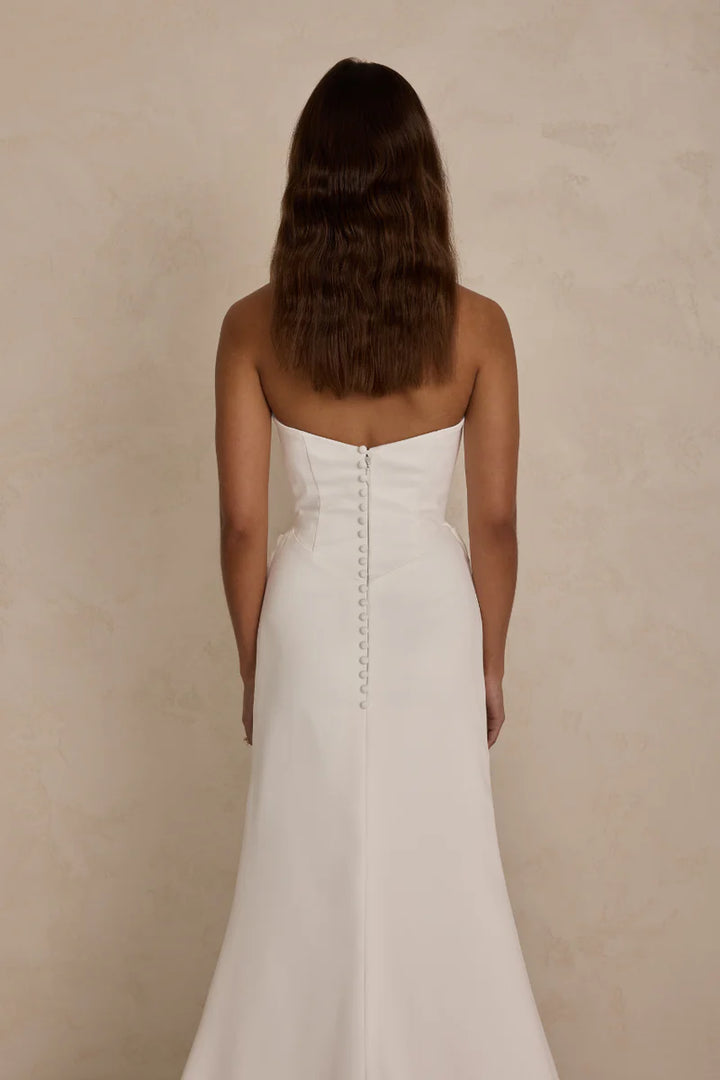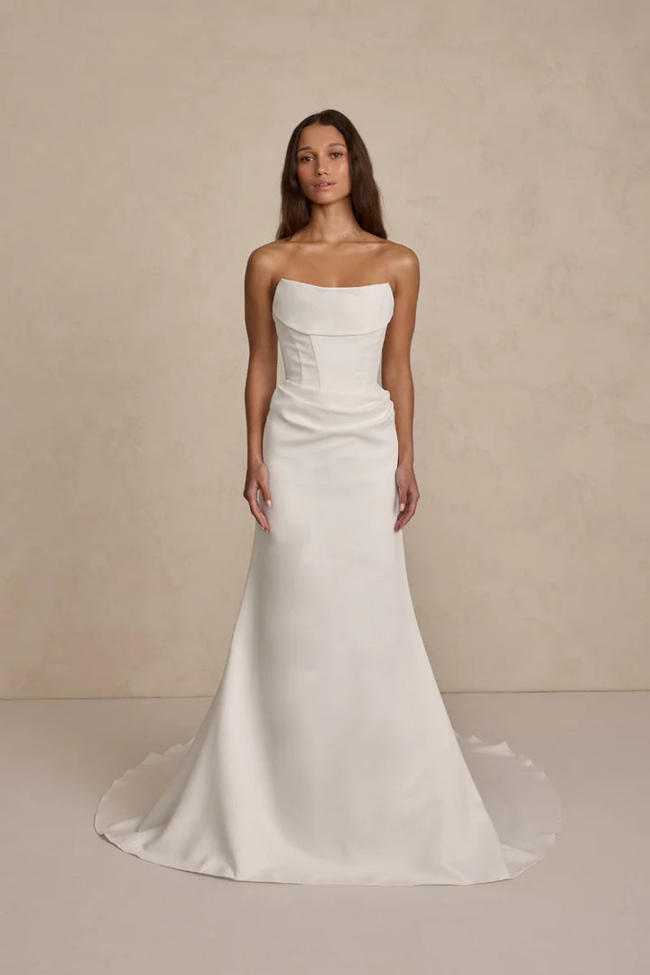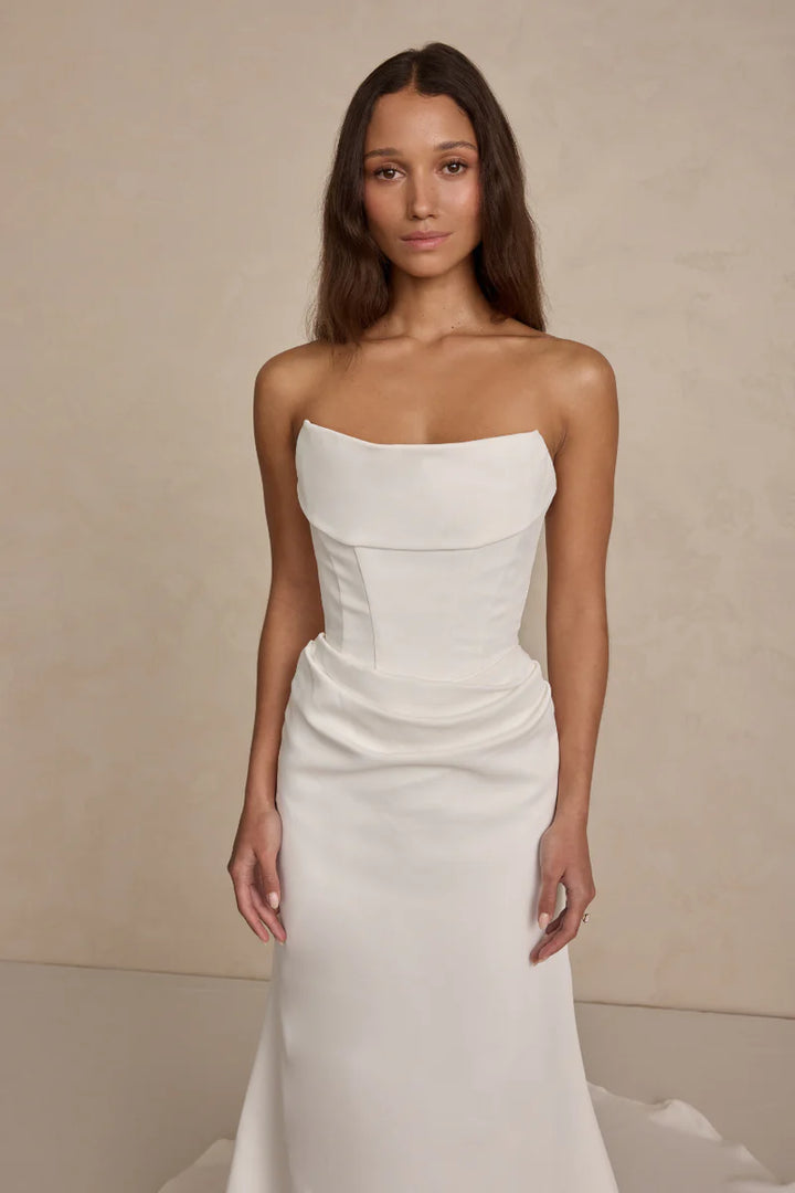 Elegant, architectural, and effortlessly sophisticated. Inspired by our iconic Celine dress, Knox features a newly developed bodice with internal boning for structure and support, creating a refined and flattering silhouette. A soft, sculptural cowl detail at the front adds a modern touch of romance, while the A-line-inspired skirt, crafted from structured fabric, ensures a clean, graceful shape. Finished with our signature Isla pouch at the midsection, Knox perfectly balances contemporary design with timeless elegance.