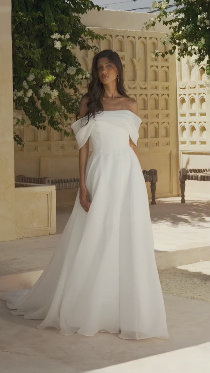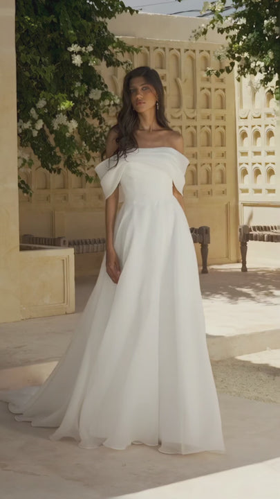 The Lissy wedding dress from our Solara collection beautifully balances romance and simplicity, offering an ethereal aesthetic without the need for lace or sparkle. Crafted from our signature lightweight organza, she feels soft, airy, and effortlessly elegant. A delicate off-the-shoulder neckline is finished with a draped organza cuff, enhancing the gown’s gentle texture, while the asymmetric pleated bodice and modern Basque waist create a flattering, cinched silhouette. Constructed with our signature boning and internal banded support, Lissy ensures comfort, security, and a flawless fit. Her frothy, lightweight A-line skirt adds soft drama and even features side seam pockets for a modern, practical touch. The back sits slightly higher for support across all sizes, mirroring the asymmetric pleating seen at the front. Organza-covered buttons cascade down the illusion organza train, completing this look with refined, romantic ease.