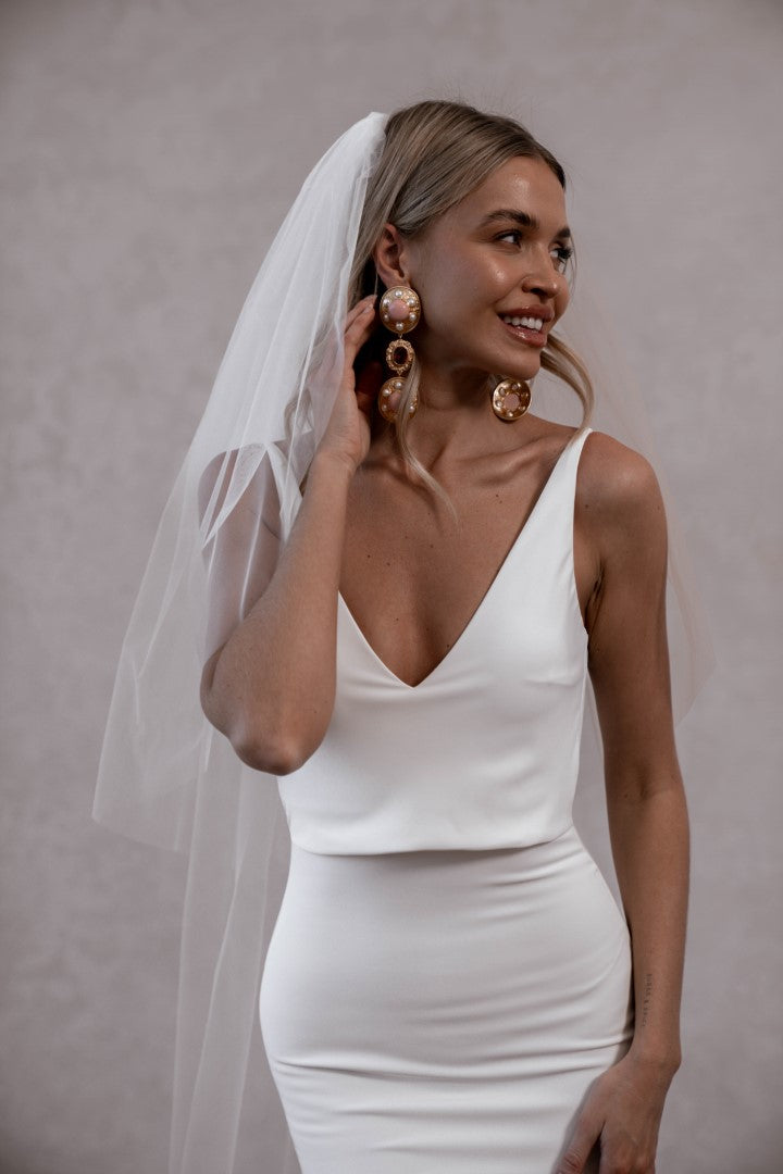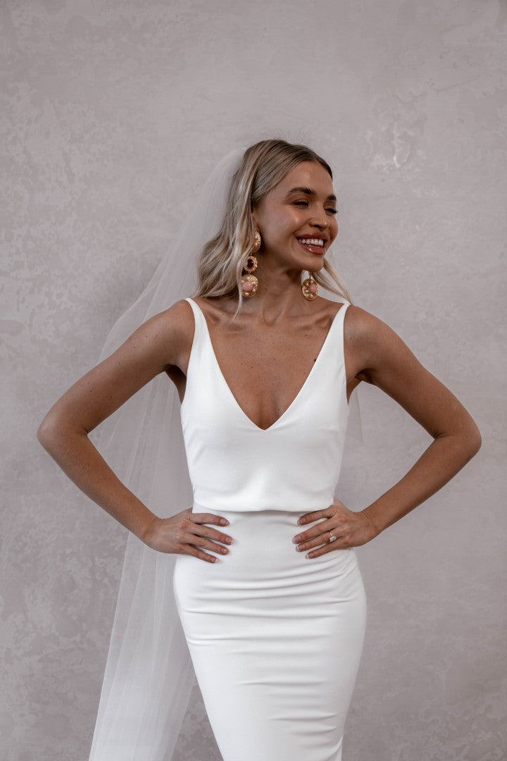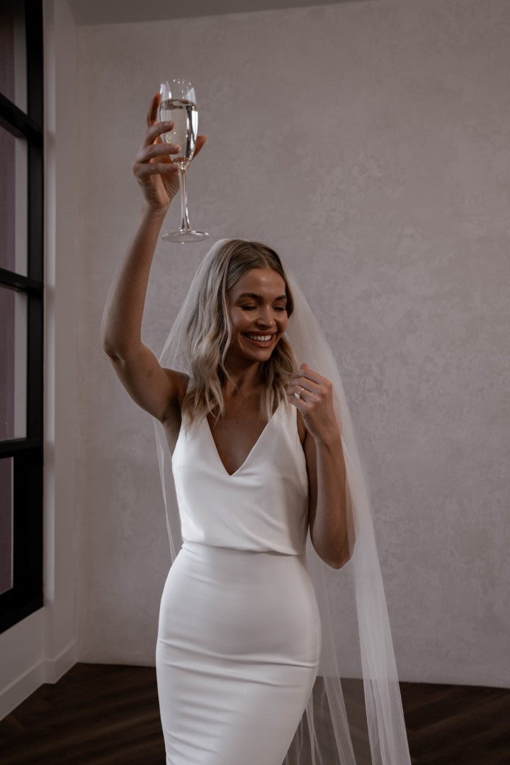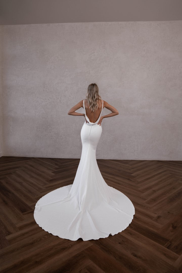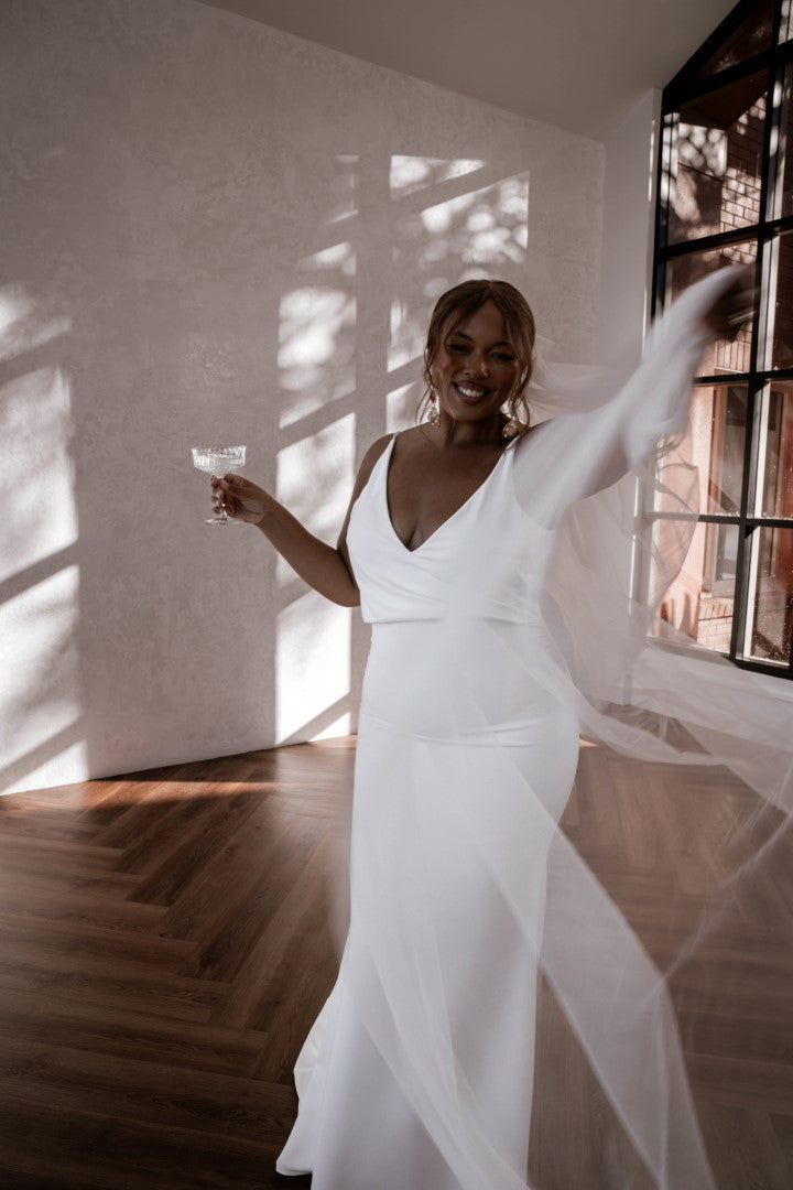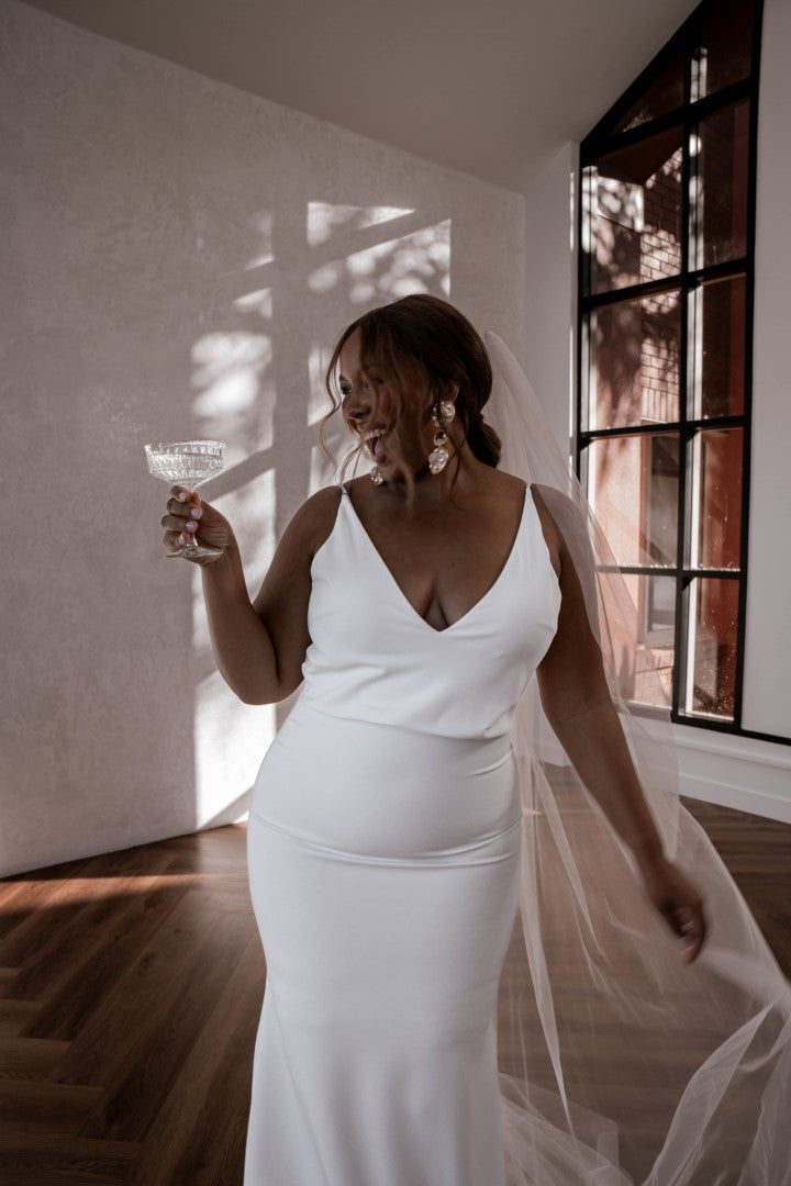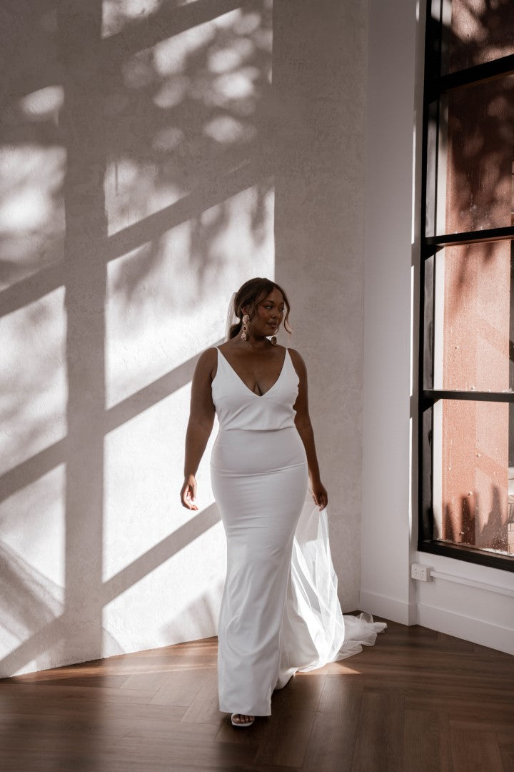 Sleek and sophisticated, Austin by Made With Love offers a modern twist on a classic crepe design. Featuring a delicate drape detail at the waist, this gown enhances your curves with a figure-hugging silhouette that feels both elegant and alluring. Minimalist yet refined, Austin is the perfect choice for brides who love timeless simplicity with subtle couture accents.