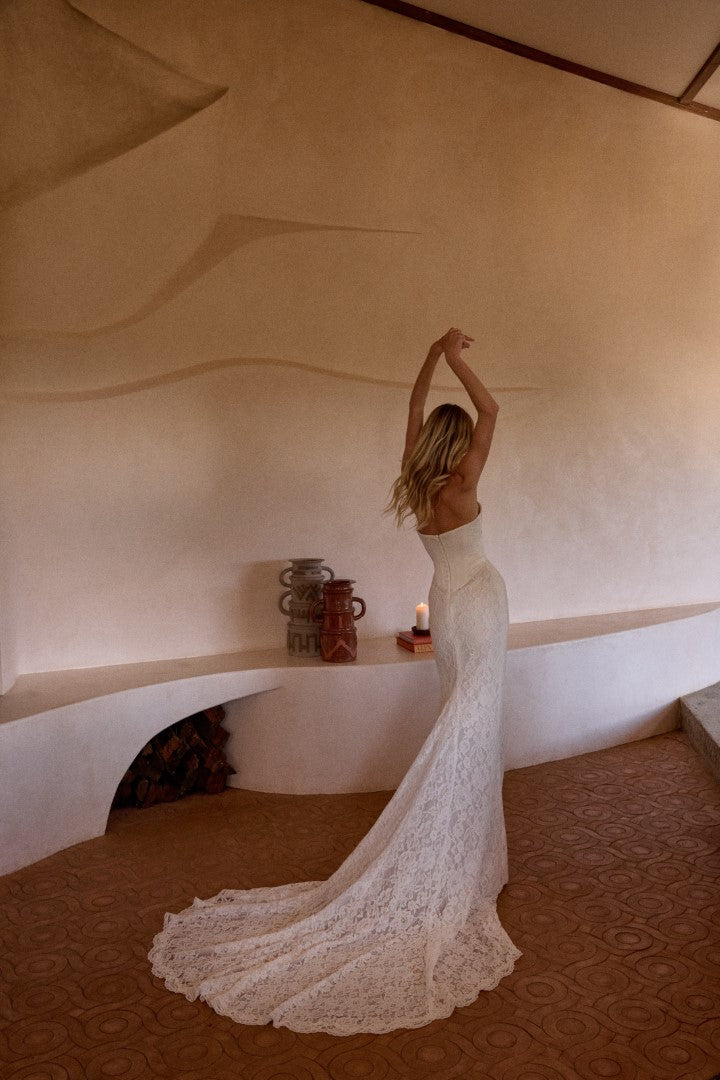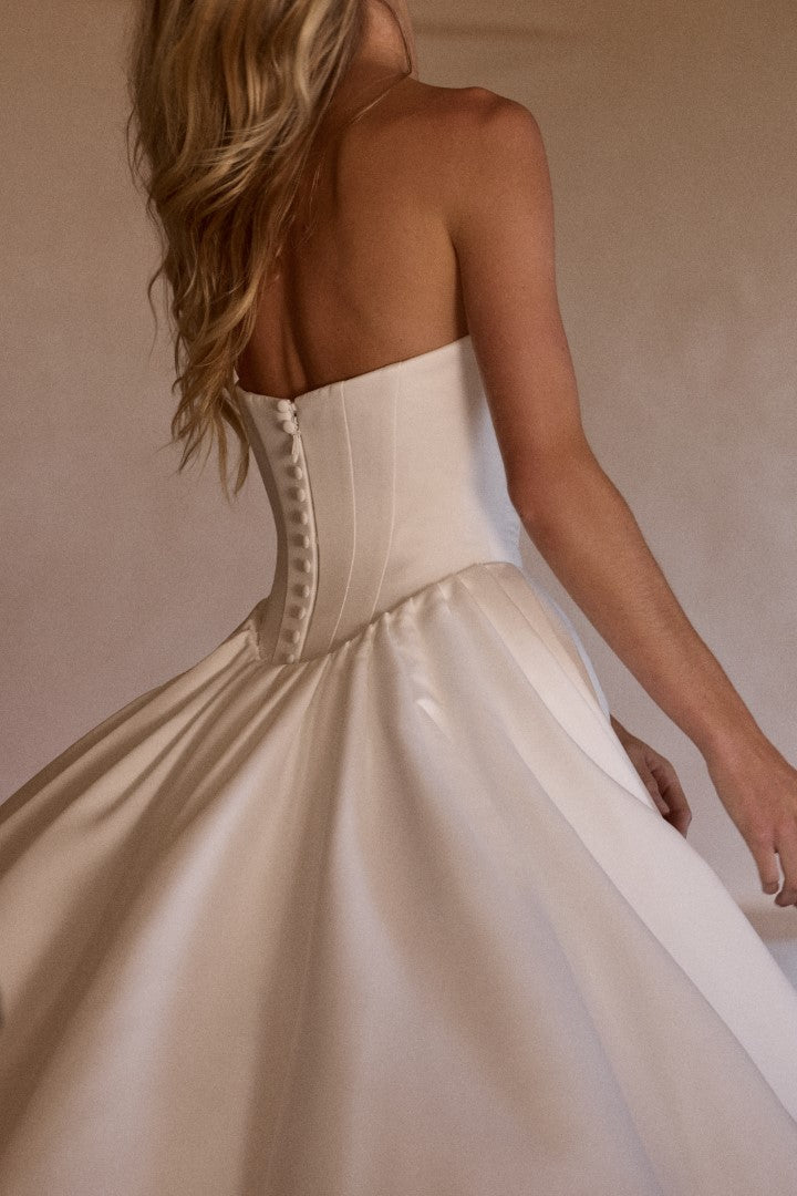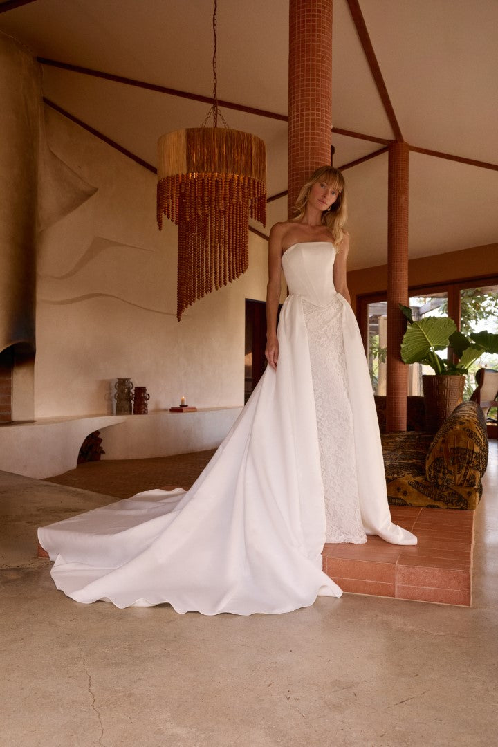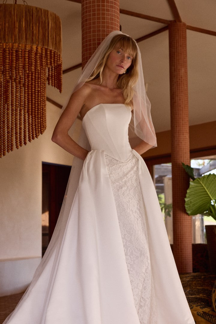 Striking and couture-inspired, Francesca Crepe by Made With Love is a bold evolution of the beloved Frankie. Featuring a strapless structured bodice with a basque waist, this gown is paired with a dramatic detachable overskirt that reveals a sleek lace gown beneath. A study in contrast, Francesca is designed for the bride who values tradition but loves the art of surprise.