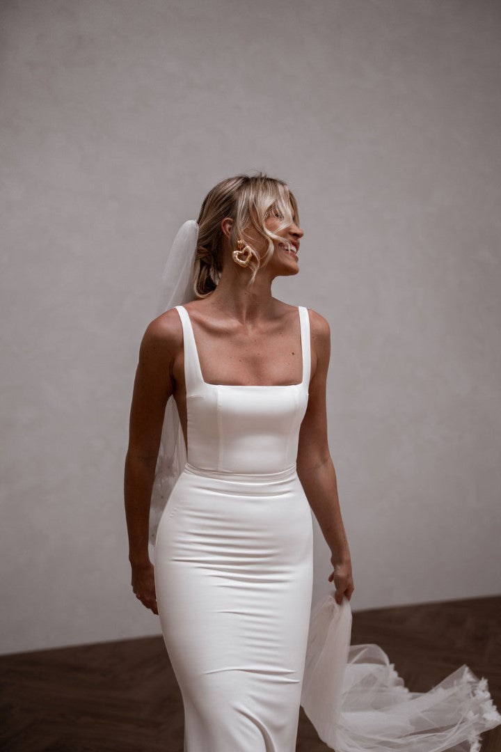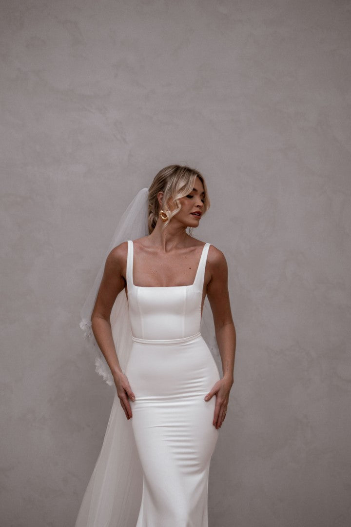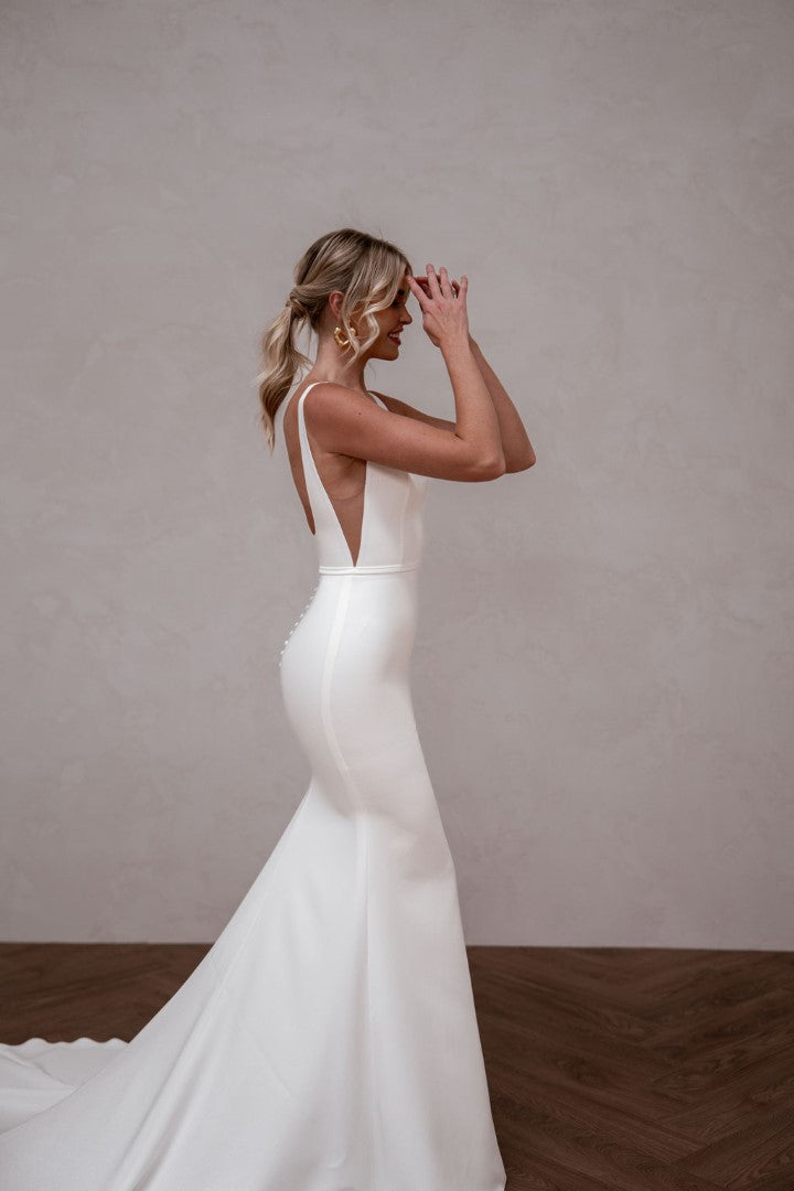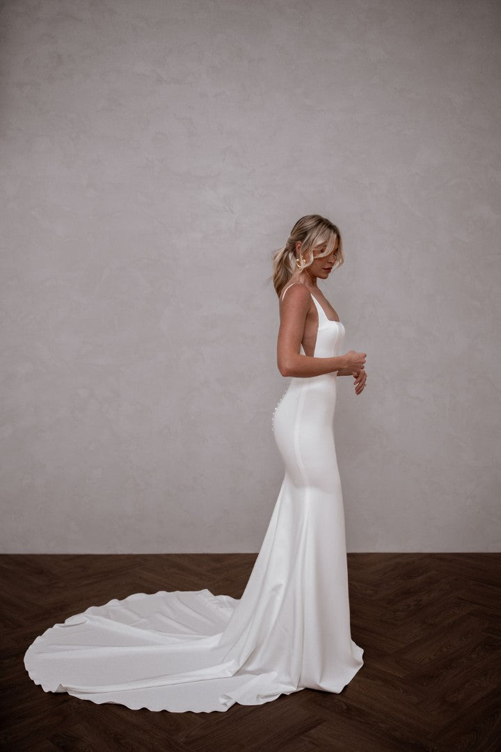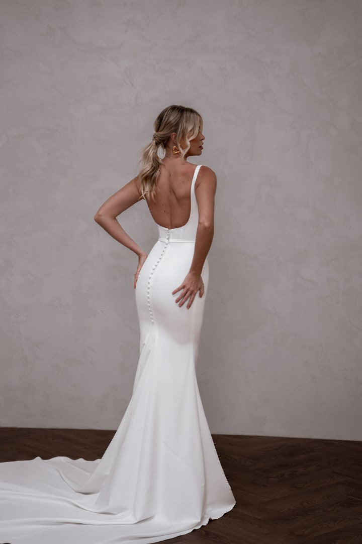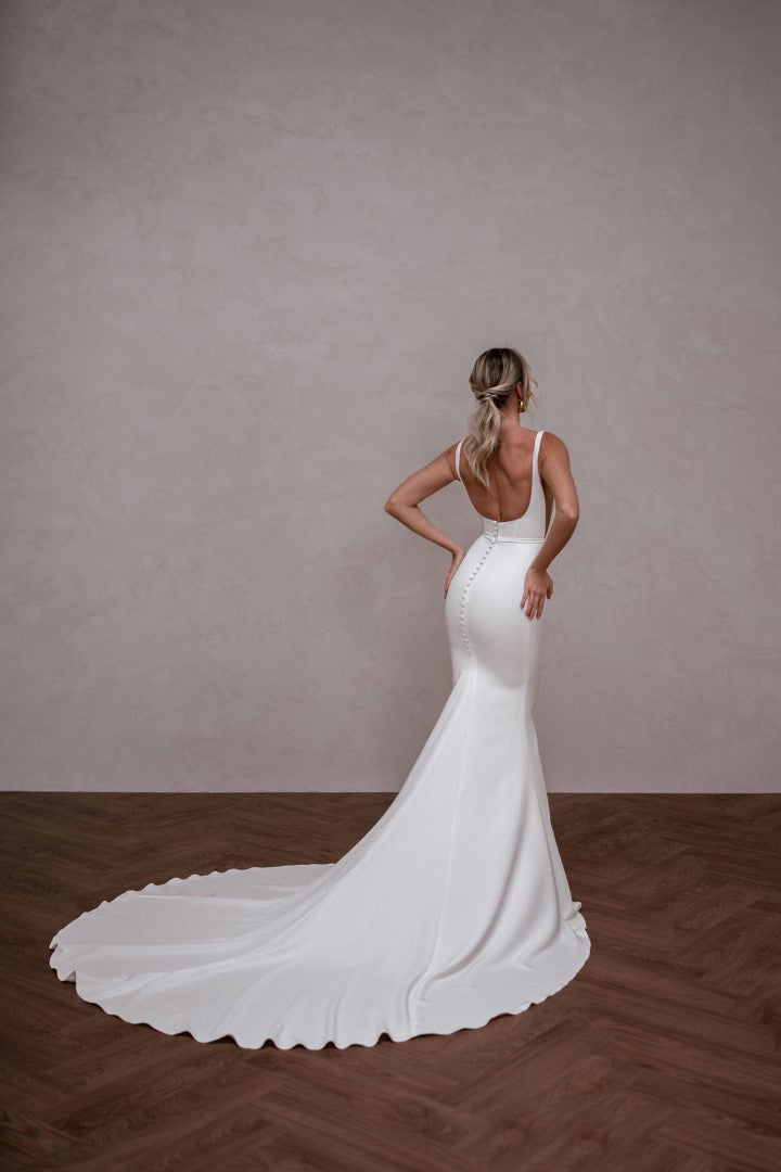 Modern and endlessly flattering, Hunter by Made With Love is a French crepe gown with a square neckline, illusion cut-outs, and a clean square back finished with buttons. Simple yet striking, Hunter frames the bust beautifully and creates a sleek, contoured silhouette. A contemporary classic designed for brides who love minimalist elegance with a fresh twist.