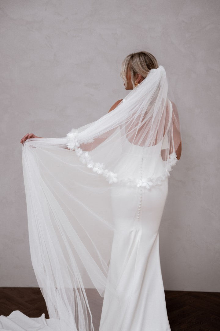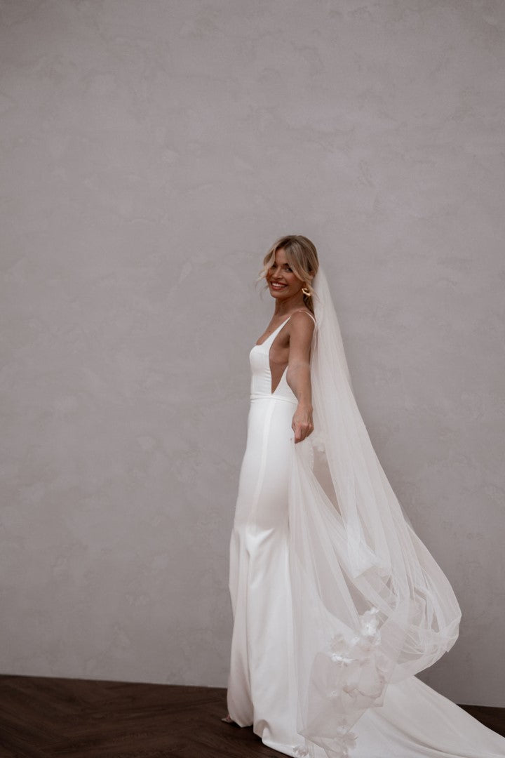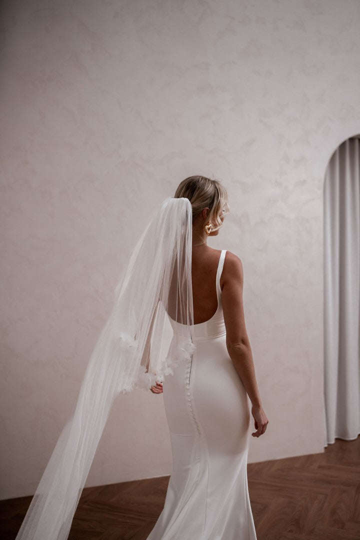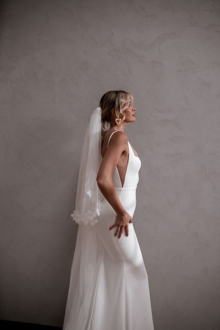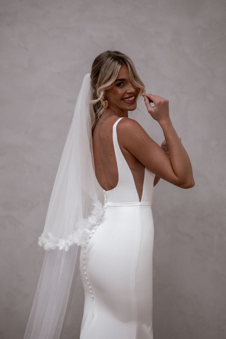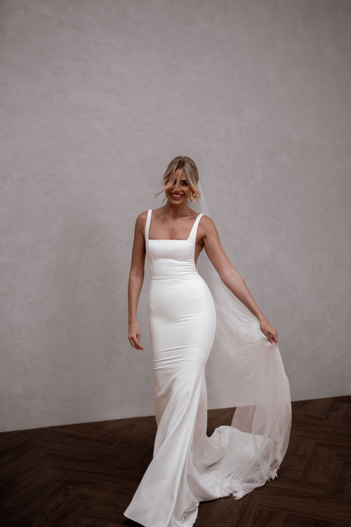 Modern and endlessly flattering, Hunter by Made With Love is a French crepe gown with a square neckline, illusion cut-outs, and a clean square back finished with buttons. Simple yet striking, Hunter frames the bust beautifully and creates a sleek, contoured silhouette. A contemporary classic designed for brides who love minimalist elegance with a fresh twist.