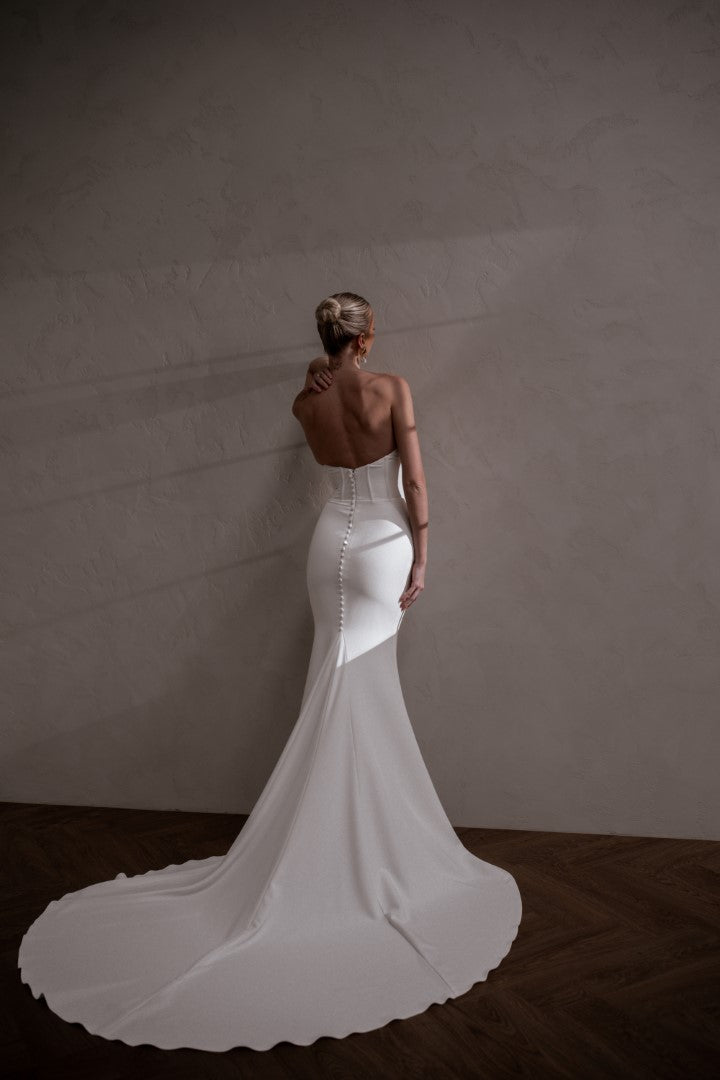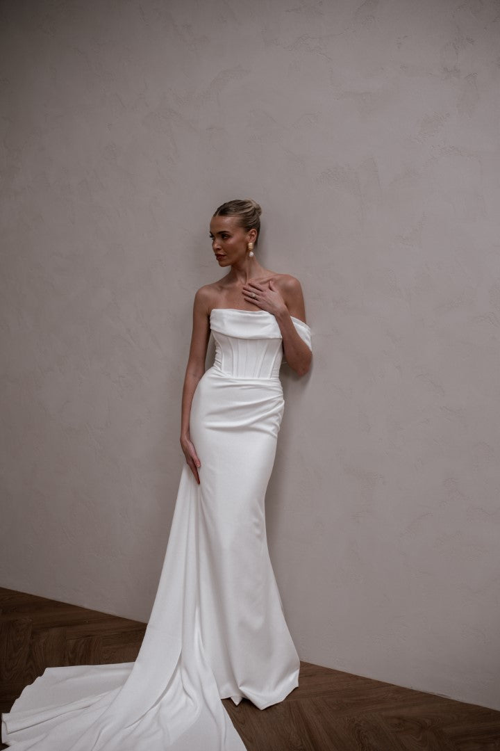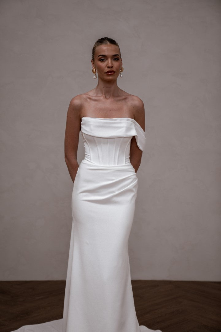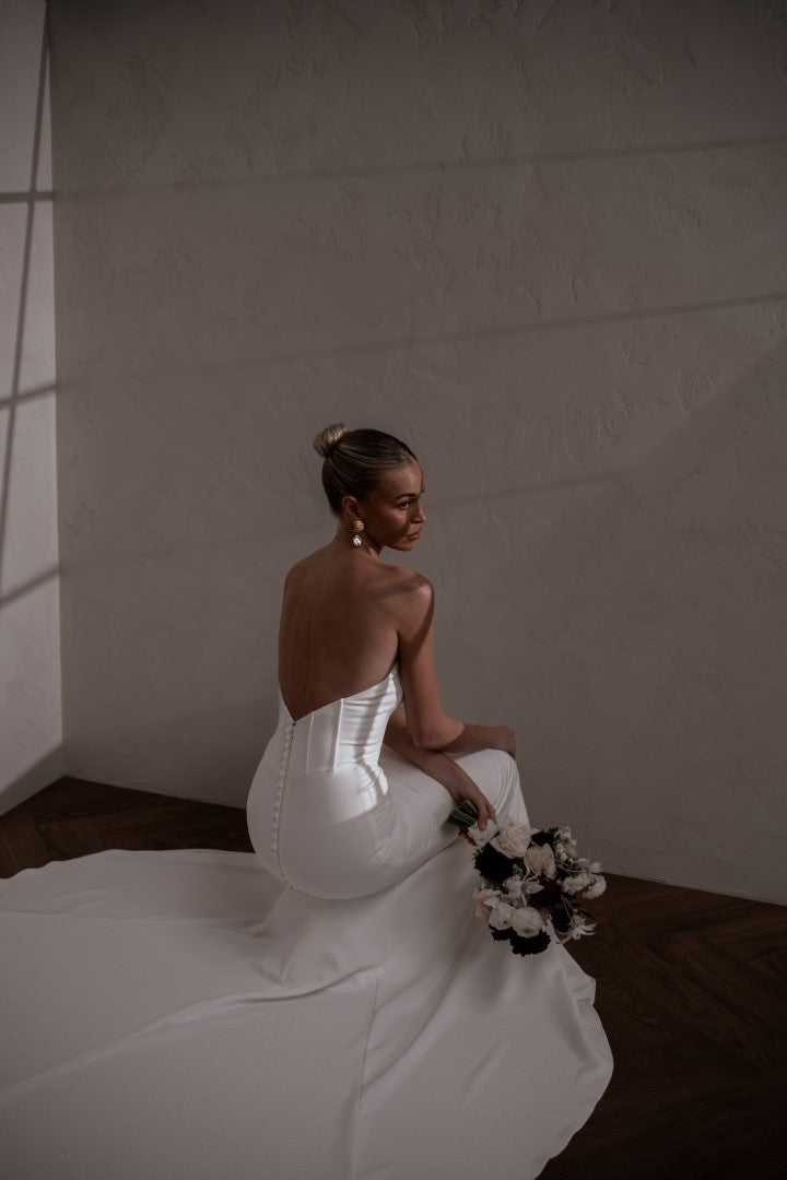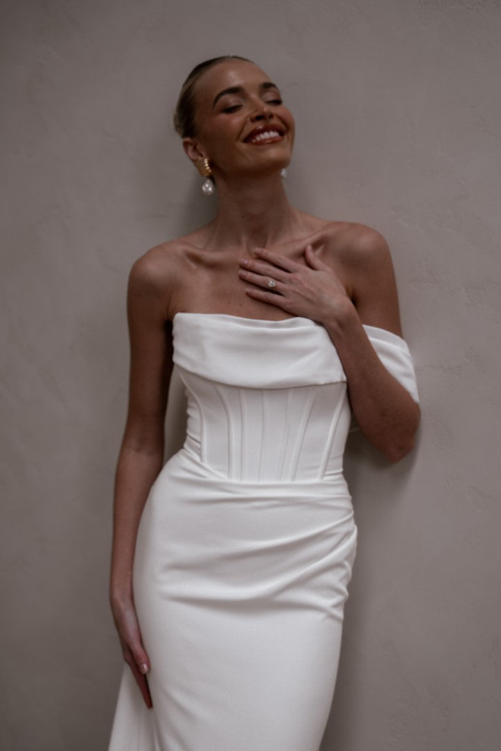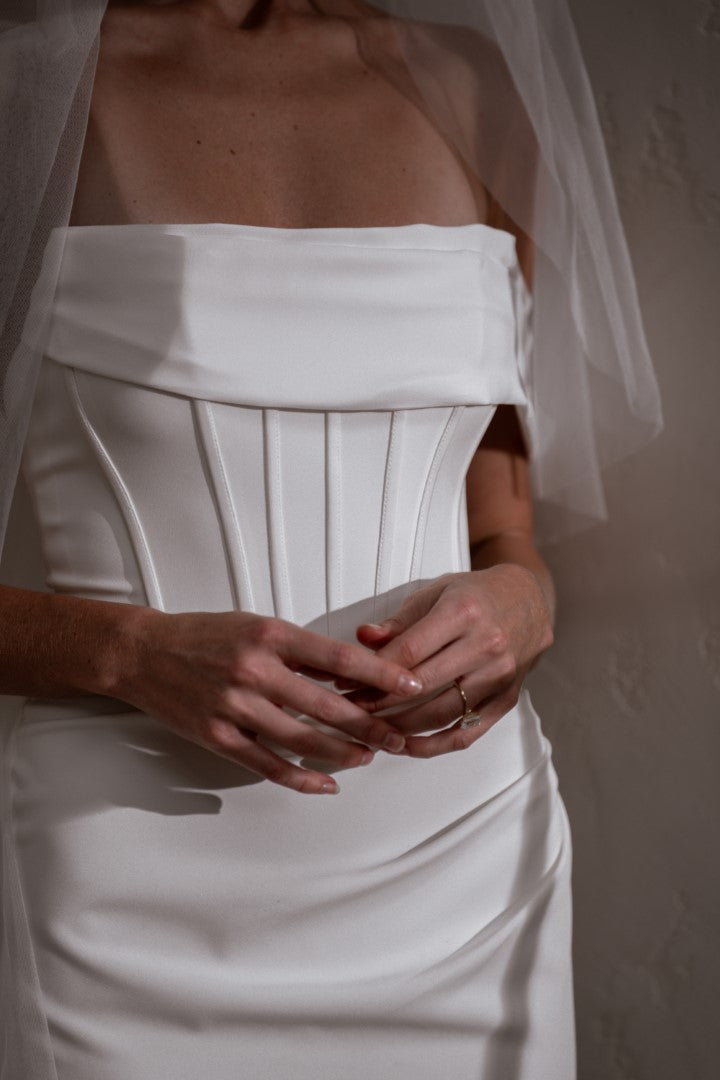 Bold yet refined, Rhode by Made With Love features a sculpted bodice with statement exposed boning and a peaked bust design. Crafted in soft French crepe, the draped detailing flows effortlessly from waist to hips, creating a flattering silhouette with every step. A gown for the bride who wants modern edge with timeless movement.