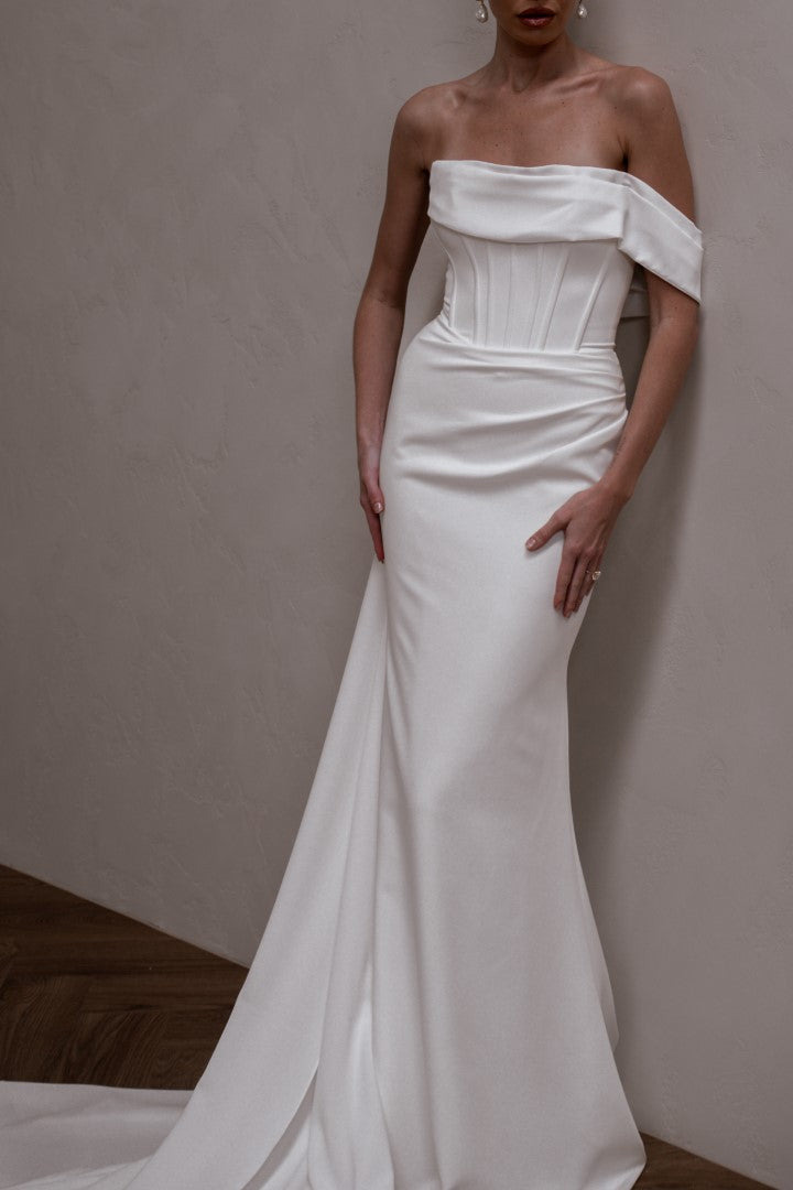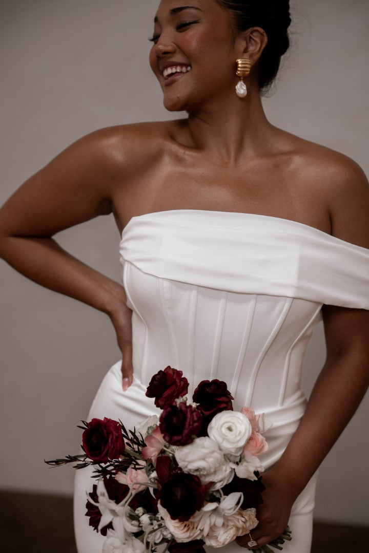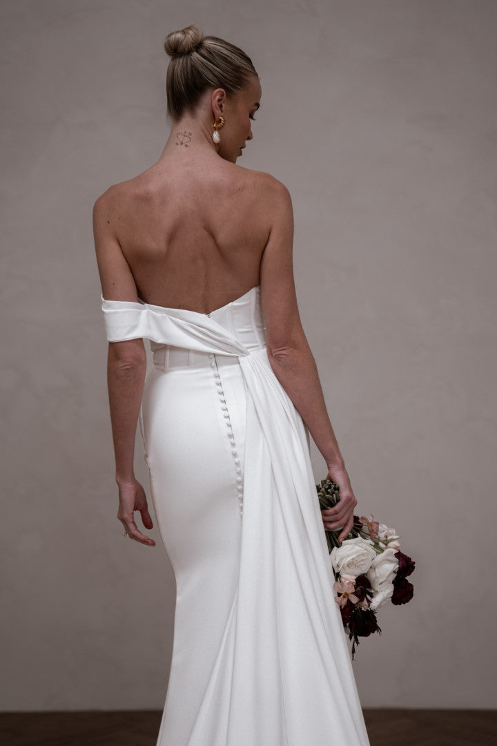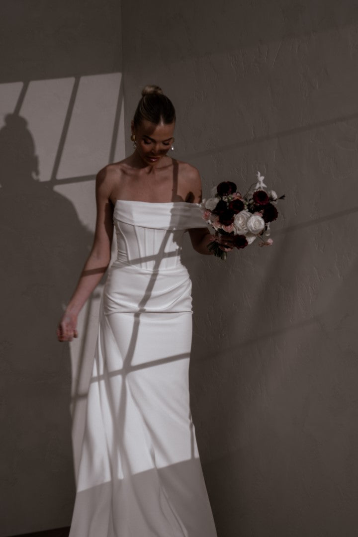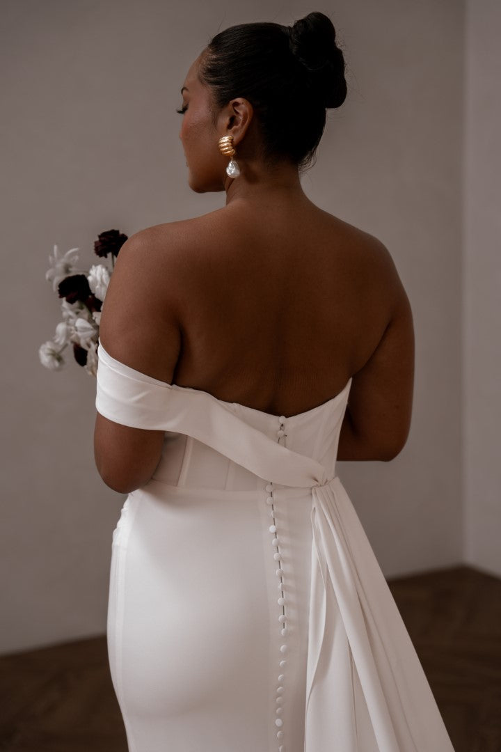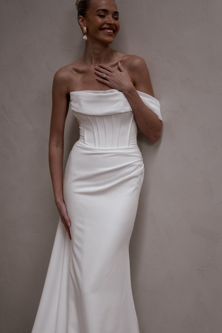 Bold yet refined, Rhode by Made With Love features a sculpted bodice with statement exposed boning and a peaked bust design. Crafted in soft French crepe, the draped detailing flows effortlessly from waist to hips, creating a flattering silhouette with every step. A gown for the bride who wants modern edge with timeless movement.