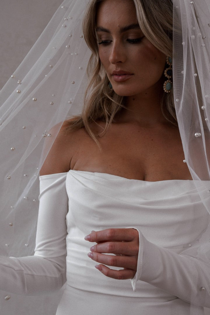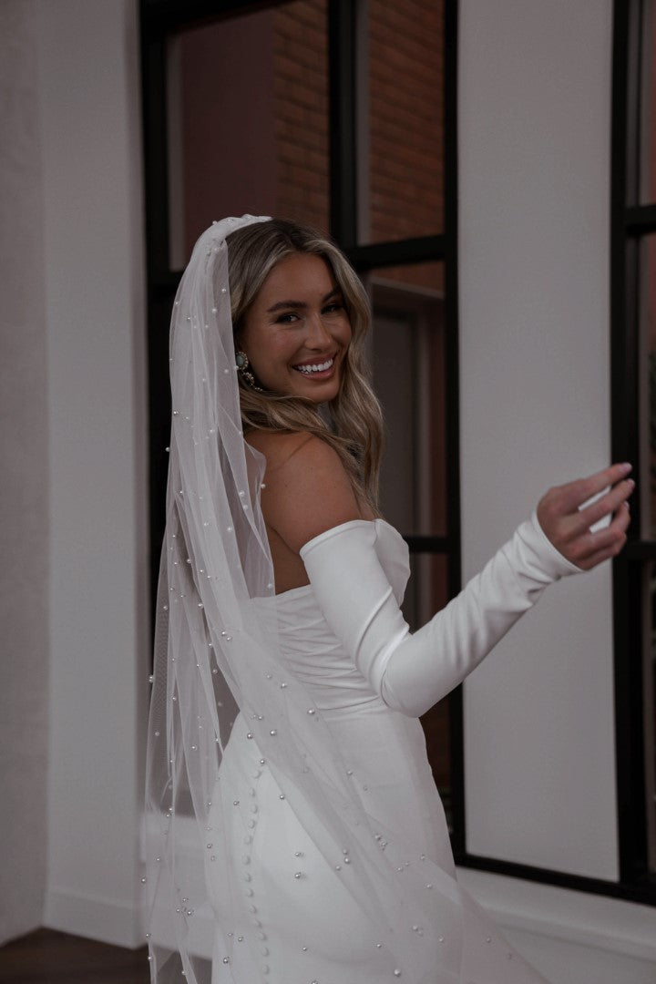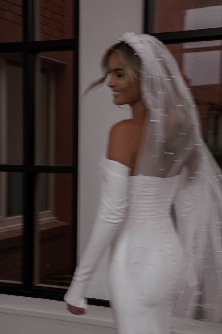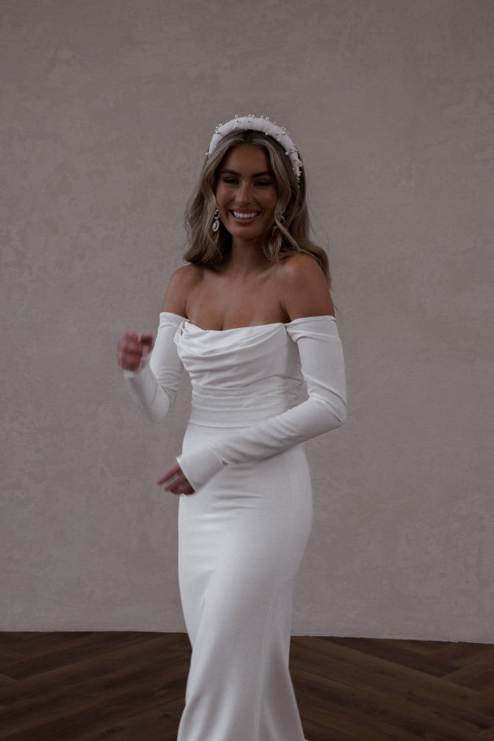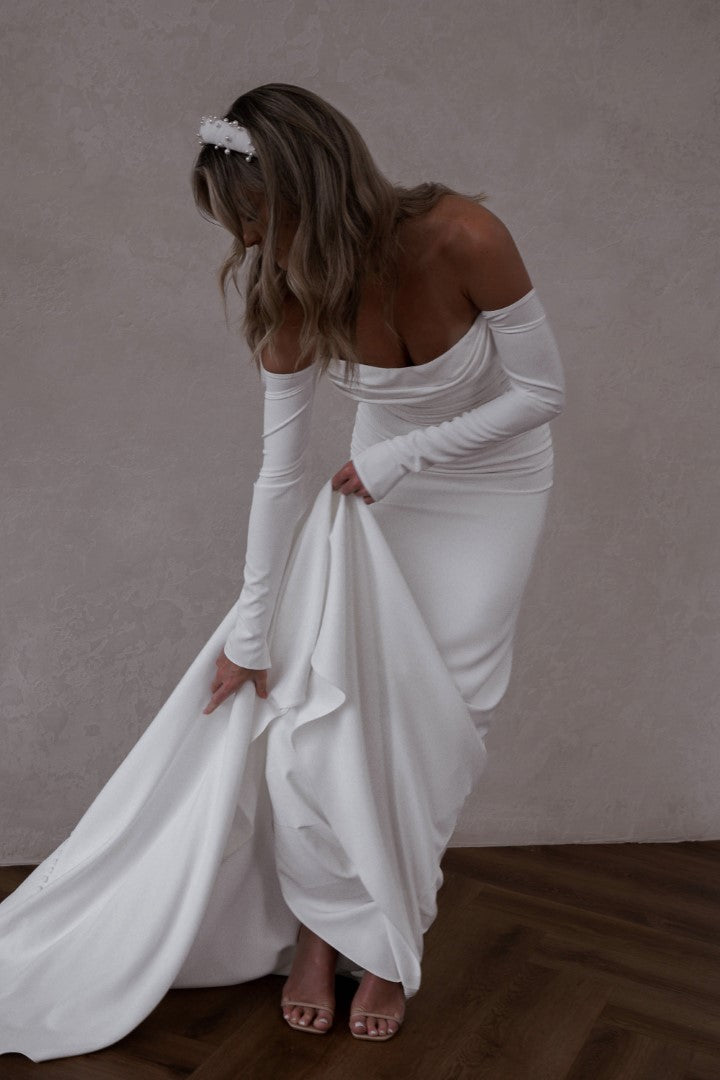 A timeless classic reimagined, Winter Curve by Made With Love is designed to flatter and celebrate every curve. Featuring a sleek fitted silhouette and long off-the-shoulder crepe sleeves, this gown blends traditional romance with a modern edge. Perfectly tailored for comfort and style, Winter Curve is the ultimate choice for brides seeking elegance, sophistication, and confidence.