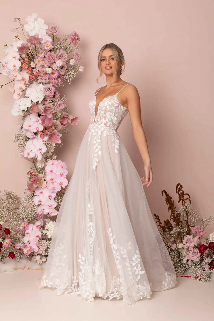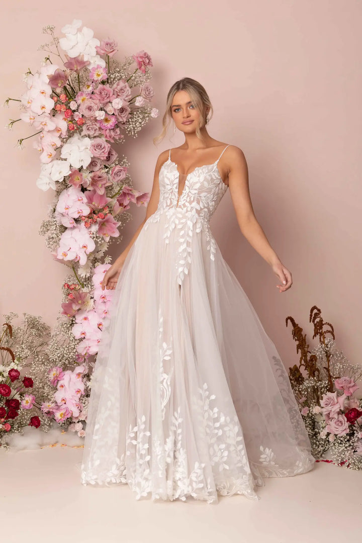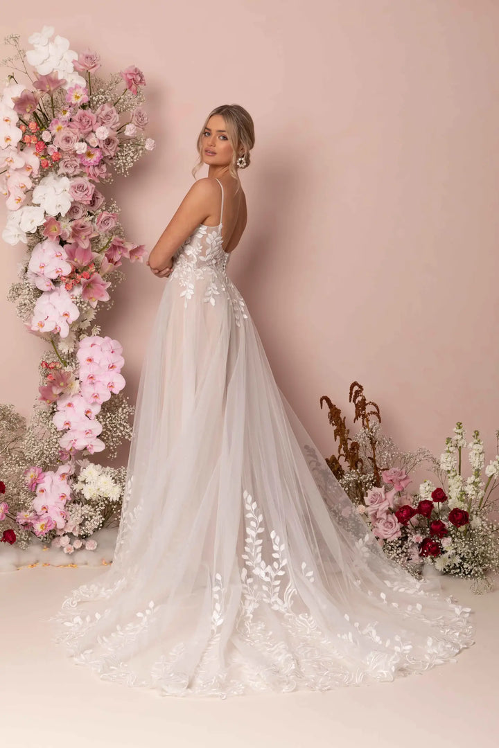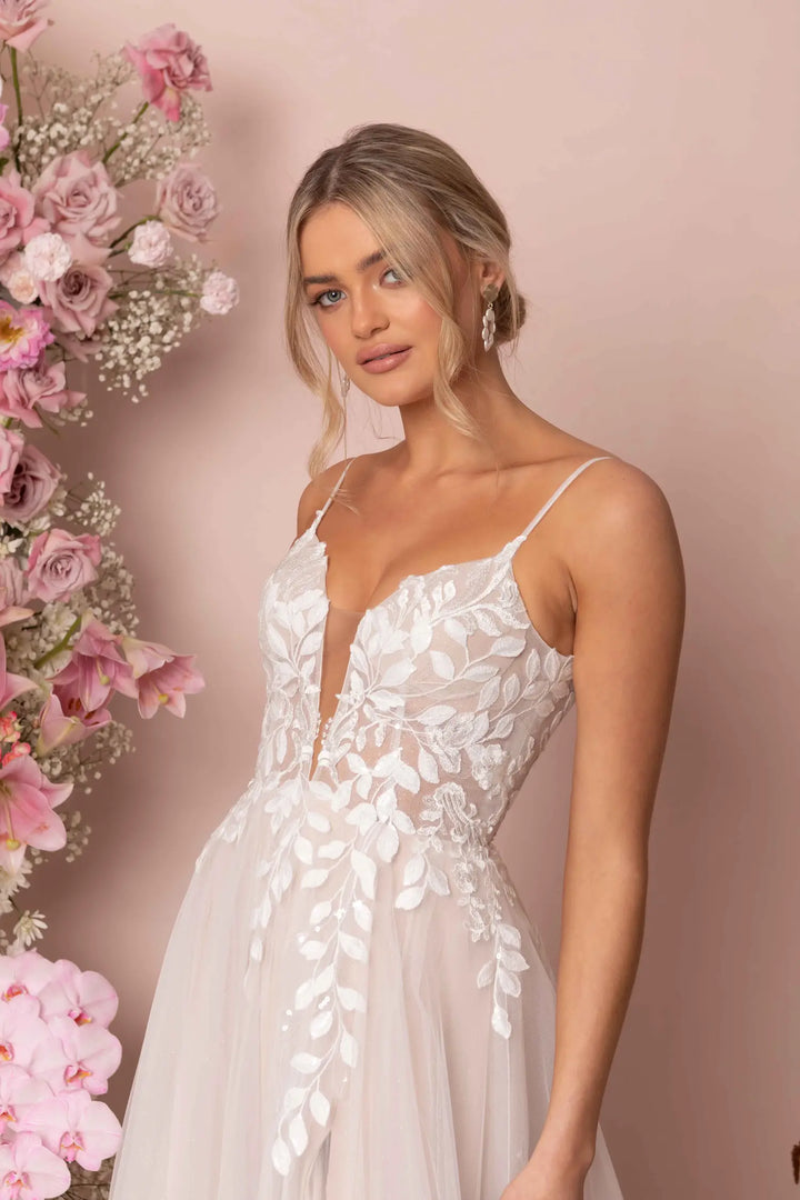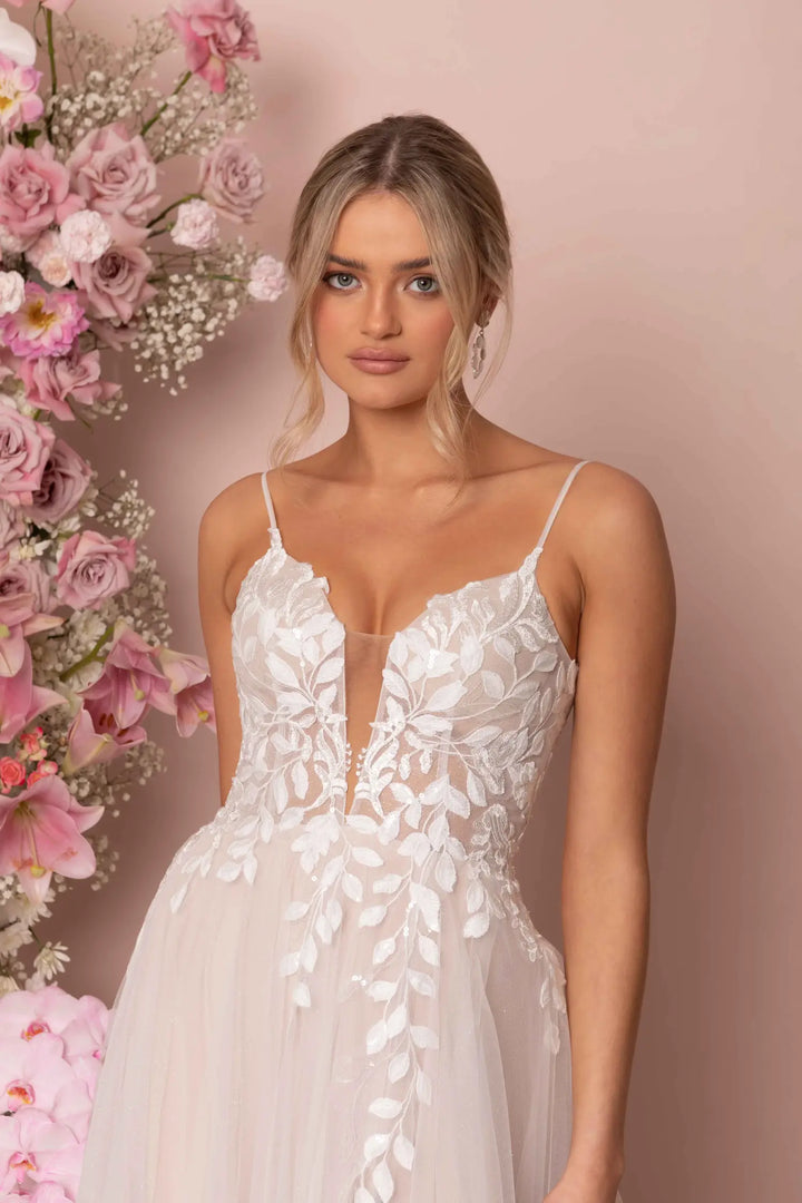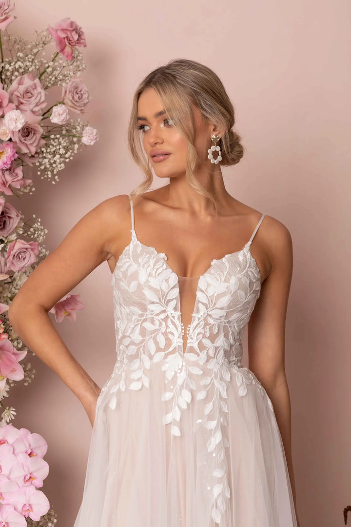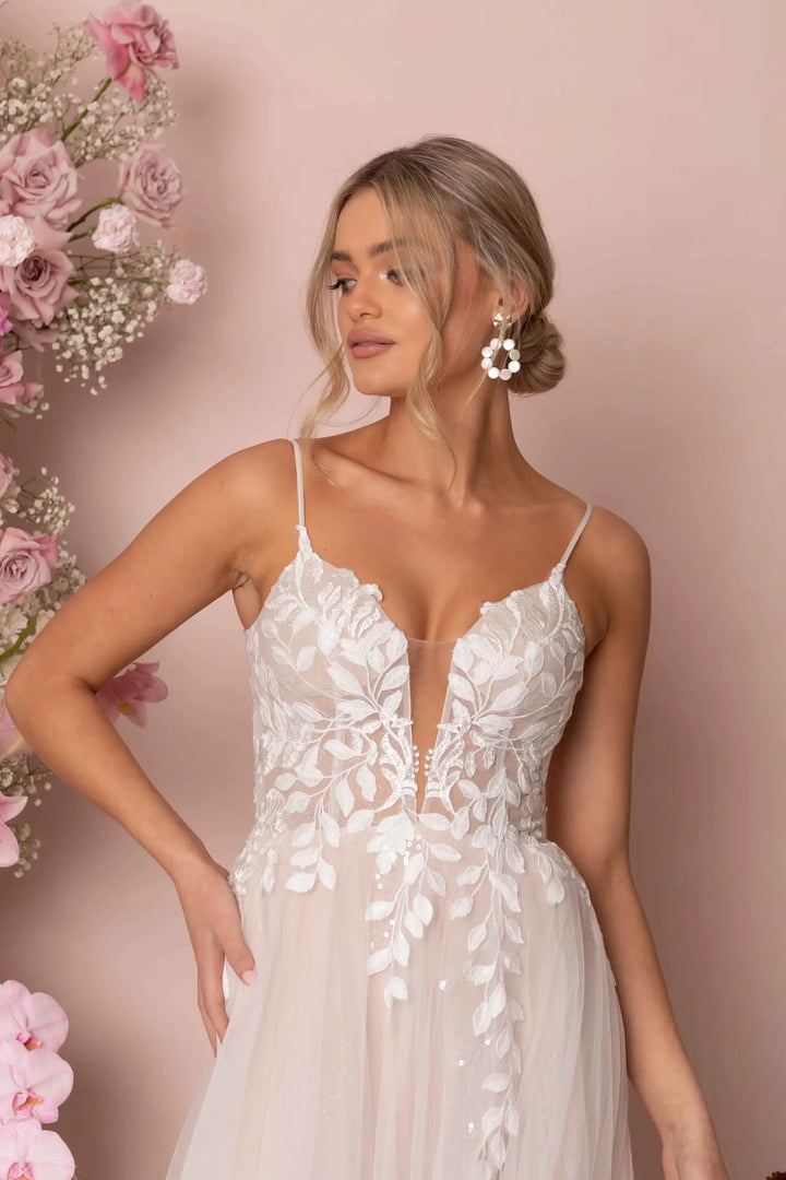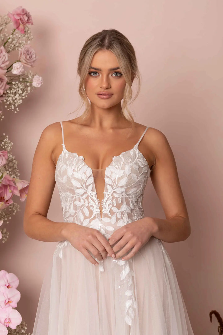 Modern romance meets subtle sparkle in Keegan by Madi Lane. Crafted from sequin-embroidered lace and glitter tulle, this dreamy A-line gown flows effortlessly with a soft skirt and sweeping train. The illusion V-neckline and scoop back with button detail add feminine charm, while built-in boning and stretch lining ensure comfort from ceremony to dancefloor.