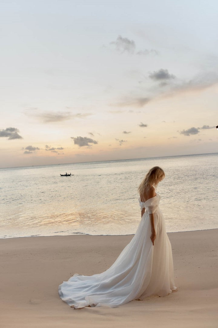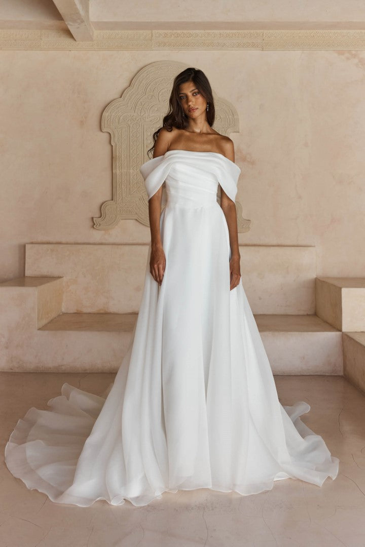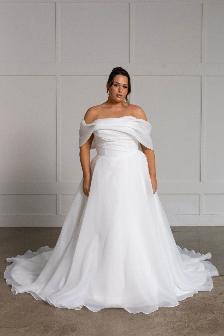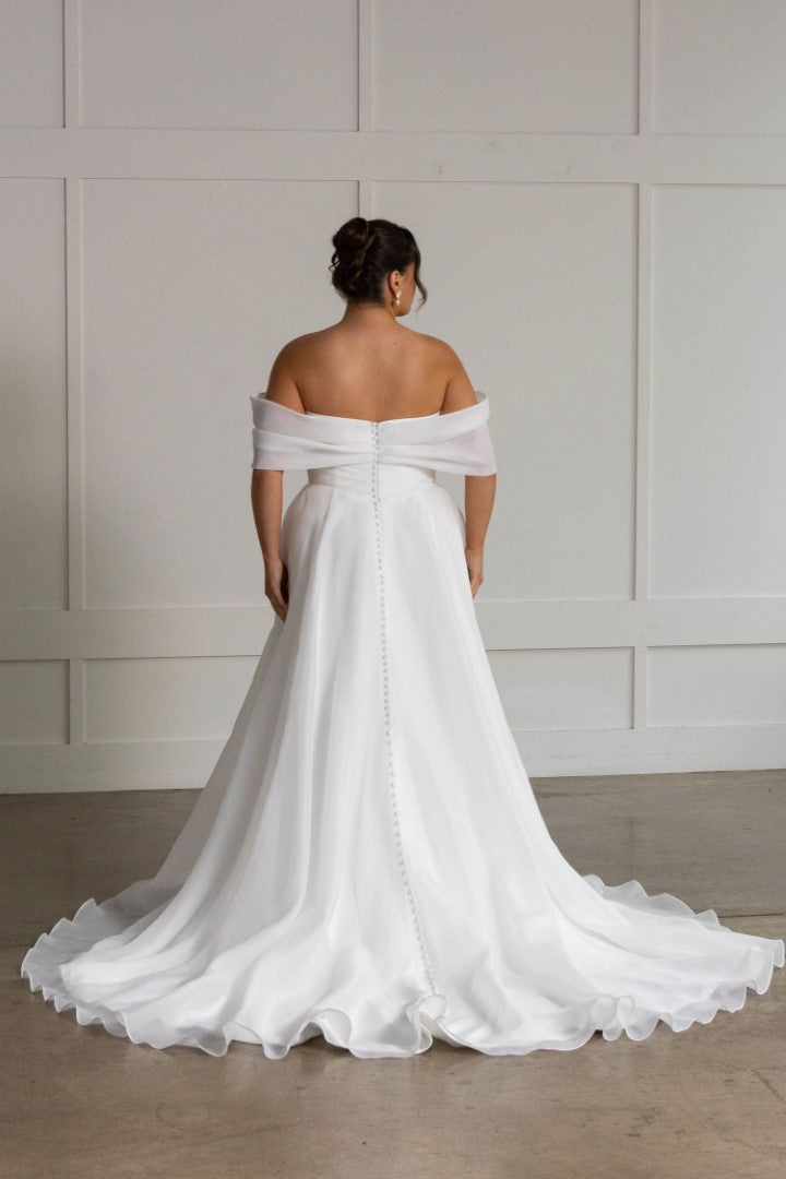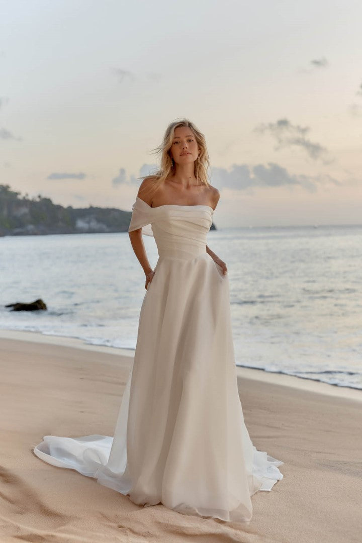 Ethereal and effortlessly romantic, Lissy by Madi Lane is crafted from lightweight organza for a soft, floaty finish. Her off-the-shoulder draped neckline and asymmetric pleated bodice flatter the figure, while the Basque waist and frothy A-line skirt create gentle movement. Finished with organza-covered buttons, side pockets, and an airy illusion train, Lissy is the perfect blend of simplicity and sophistication.