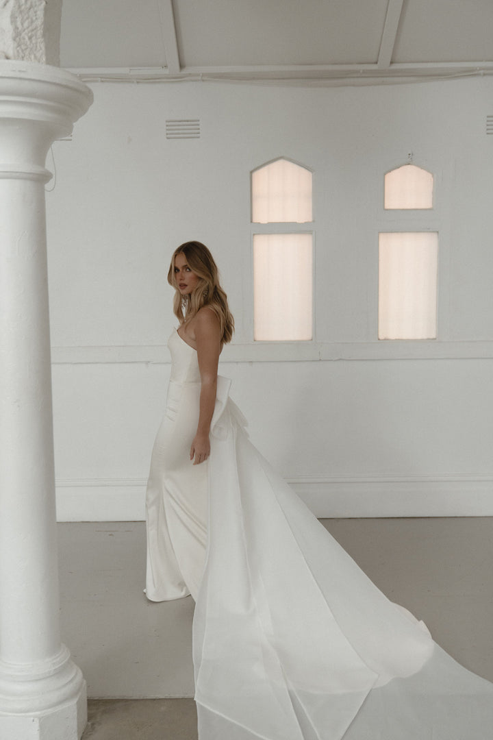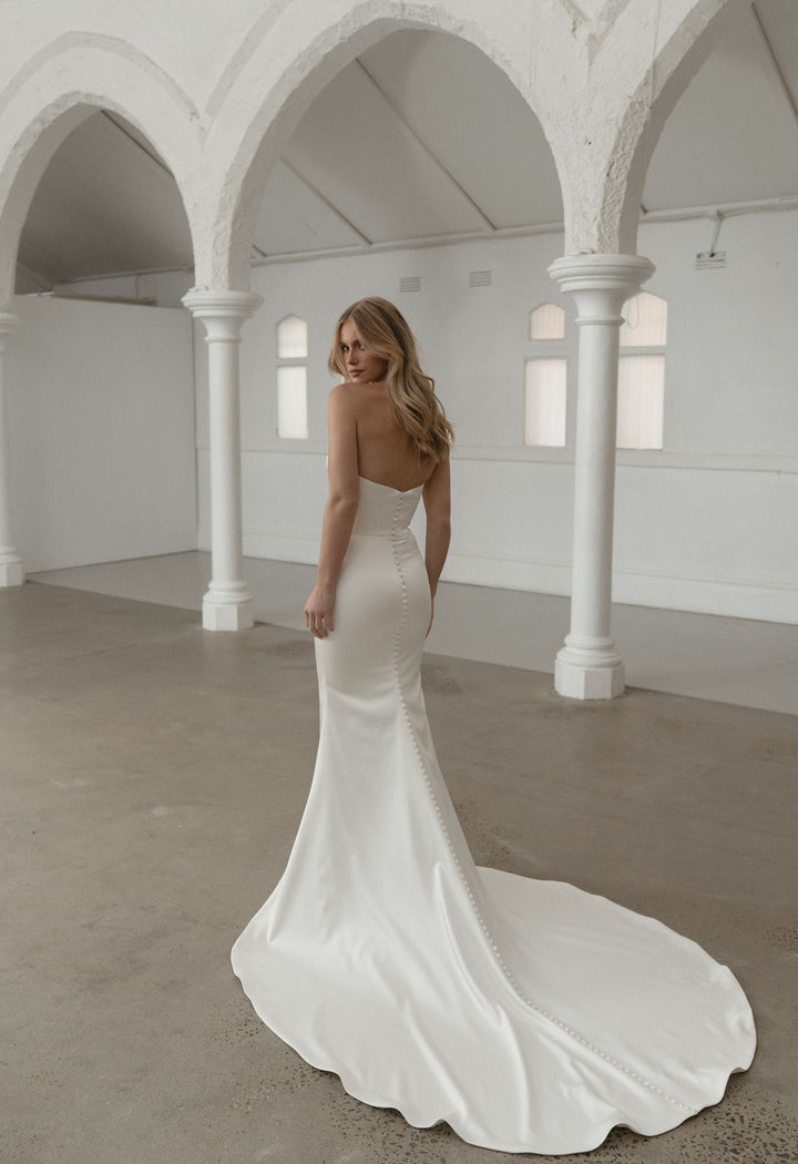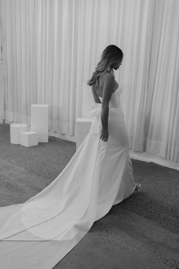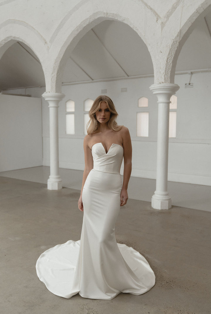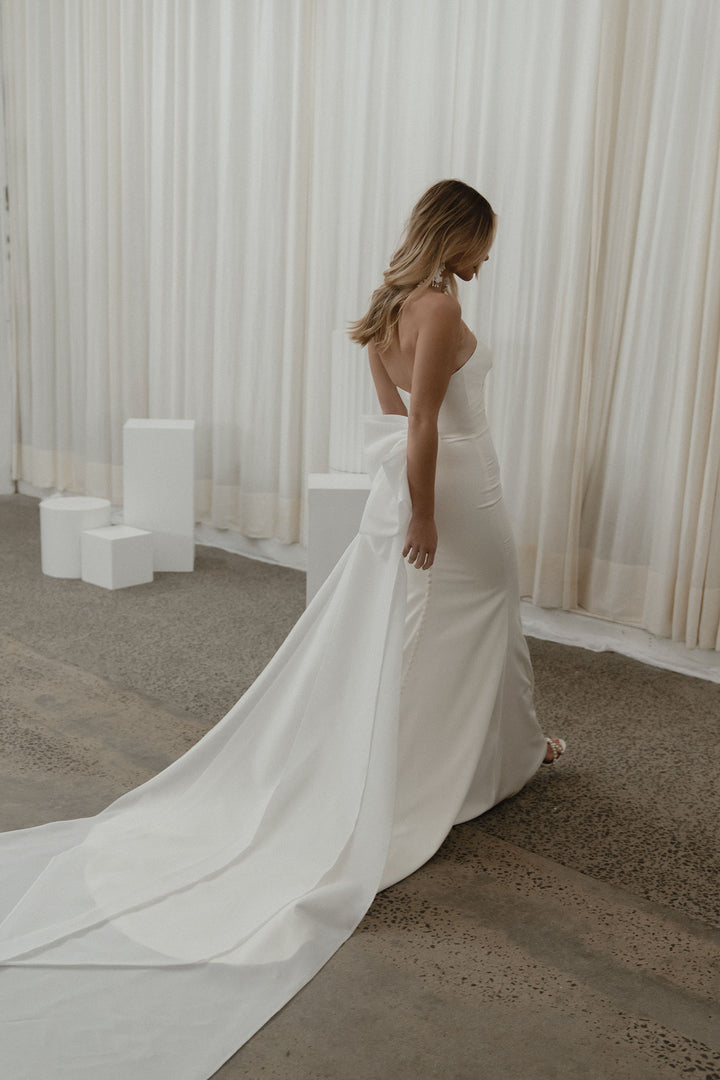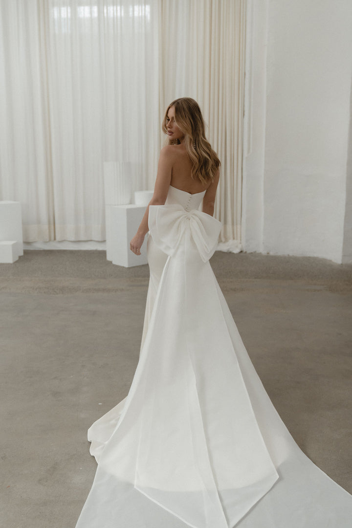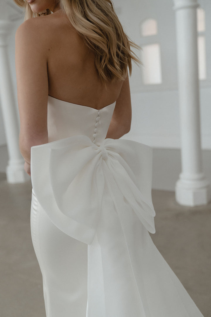 Modern and refined, Silas by Madi Lane captures effortless sophistication in stretch satin. Her pleated, asymmetrical bodice and strapless V-neckline create soft structure and contemporary edge. The sleek fit-and-flare silhouette is perfectly balanced by a dramatic detachable bow, giving you two distinct bridal looks in one.