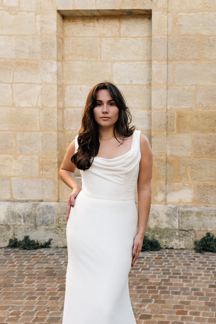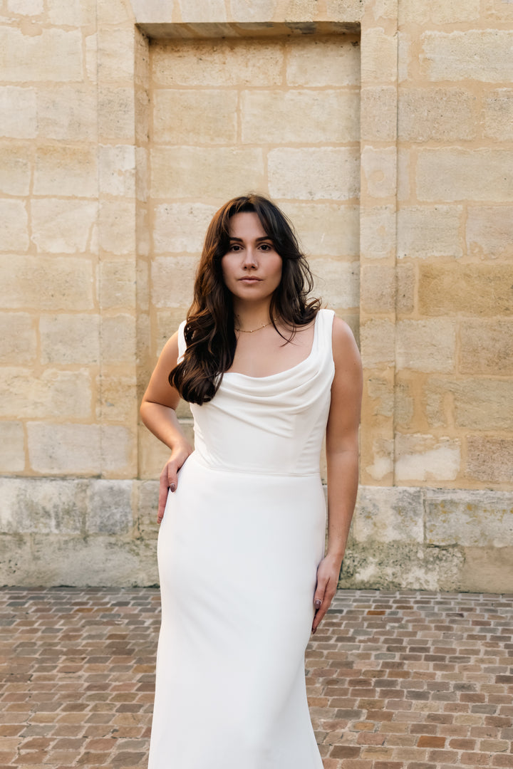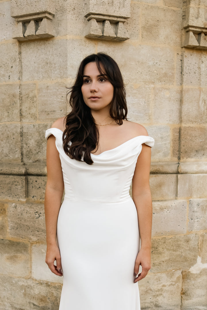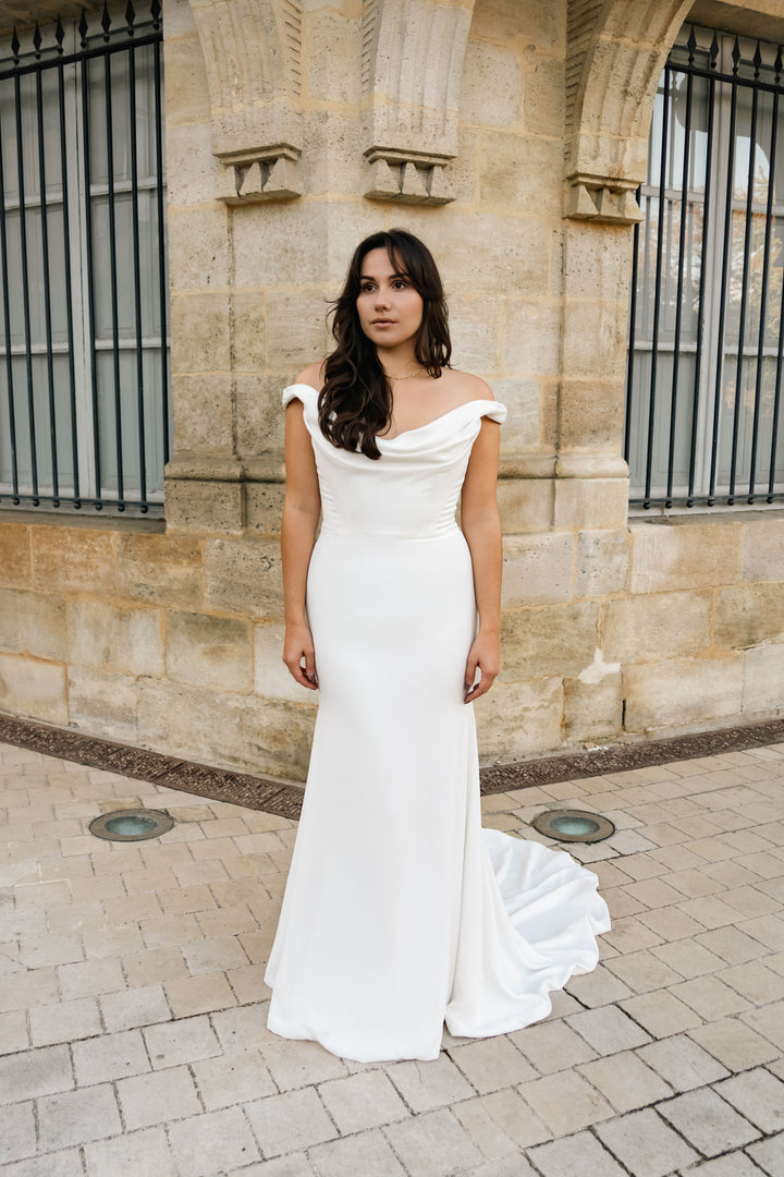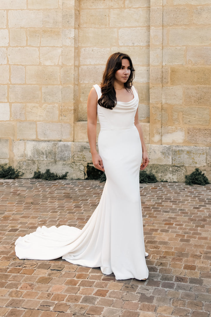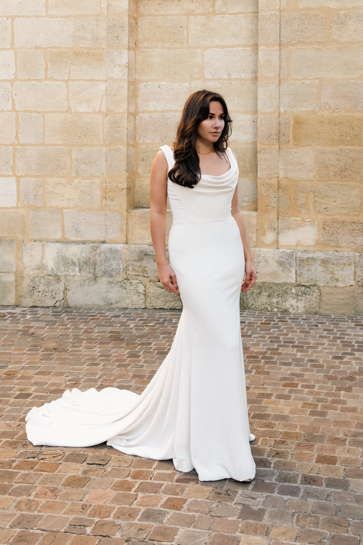 Mia by Noor, exclusive to Nora Eve, captures modern minimalism at its most elegant. Crafted in smooth crepe, her softly draped cowl neckline and structured shoulder straps create a flawless, feminine shape. The sleek fit-and-flare silhouette flows into a statement train finished with covered buttons — a refined, contemporary design for the bride who loves effortless sophistication and timeless beauty.