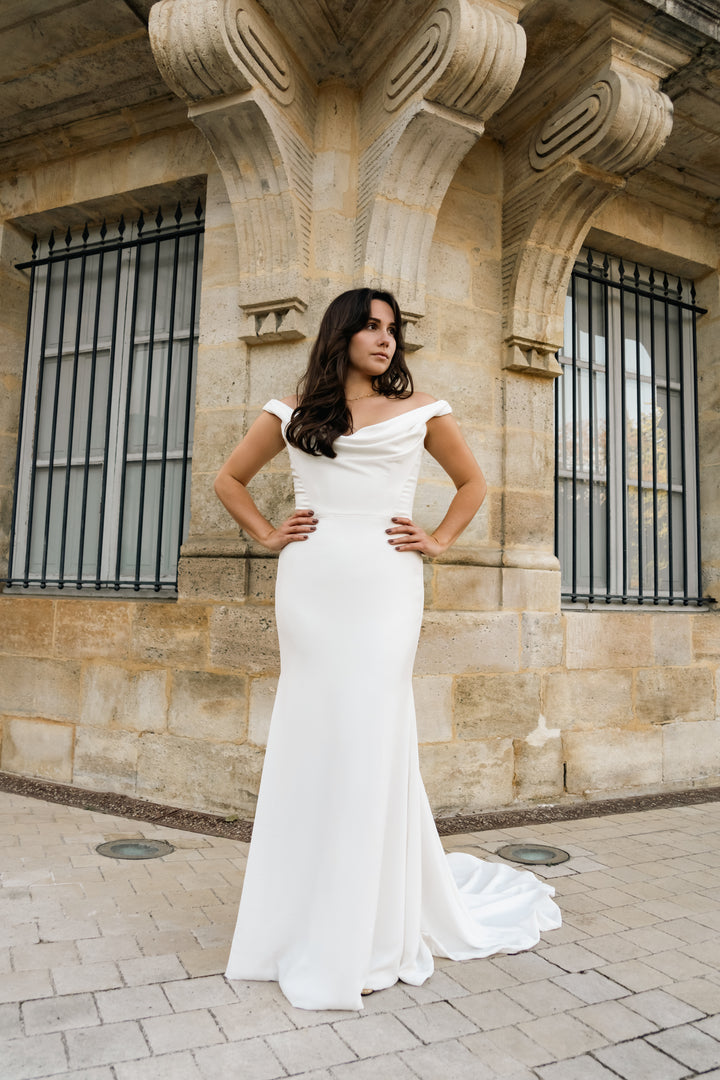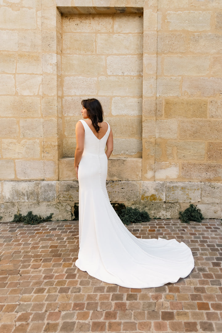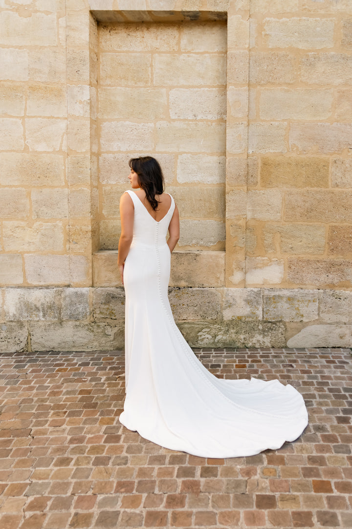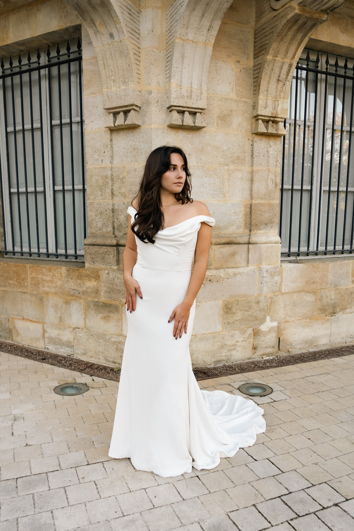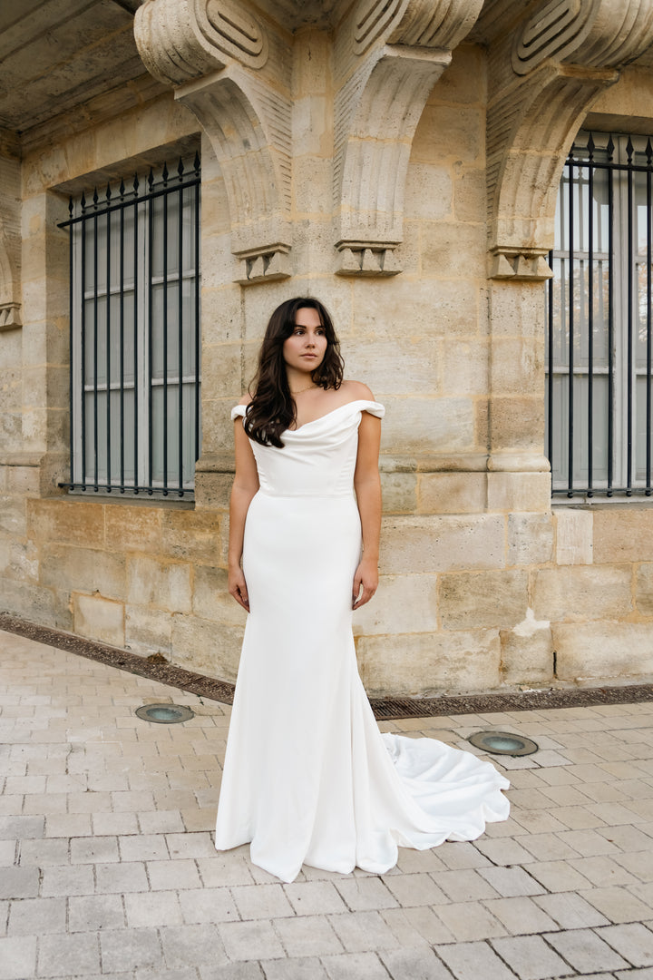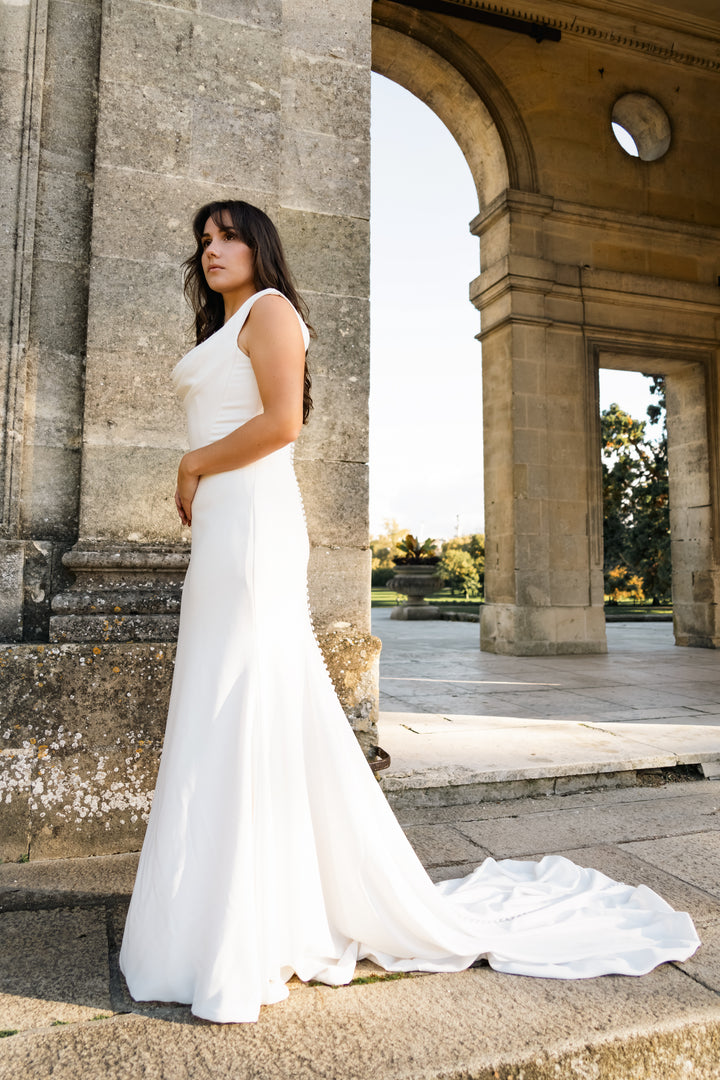 Mia by Noor, exclusive to Nora Eve, captures modern minimalism at its most elegant. Crafted in smooth crepe, her softly draped cowl neckline and structured shoulder straps create a flawless, feminine shape. The sleek fit-and-flare silhouette flows into a statement train finished with covered buttons — a refined, contemporary design for the bride who loves effortless sophistication and timeless beauty.