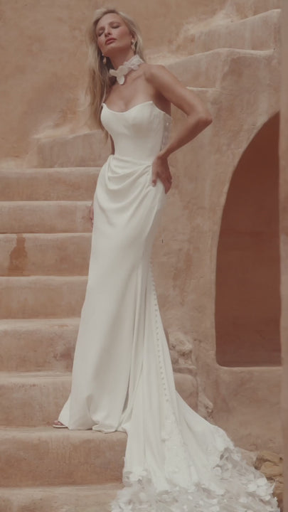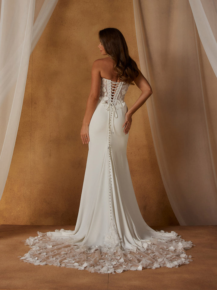 The Nash wedding dress is a modern, couture-inspired masterpiece crafted for the fashion-forward bride who loves clean lines with an avant-garde edge. This strapless fit-and-flare silhouette features a chic scoop neckline and elongated seamlines that sculpt the body, leading to a beautifully draped waist detail for a refined, flattering finish. At the back, an illusion lace-up corset is embellished with soft petal motifs that cascade delicately down the skirt and train, echoed on the detachable sleeves and statement Nash Collar for added dimension and romance. Balancing structured design with gentle, textural detailing, Nash creates an effortlessly glamorous look that feels bold, contemporary, and unmistakably elegant.