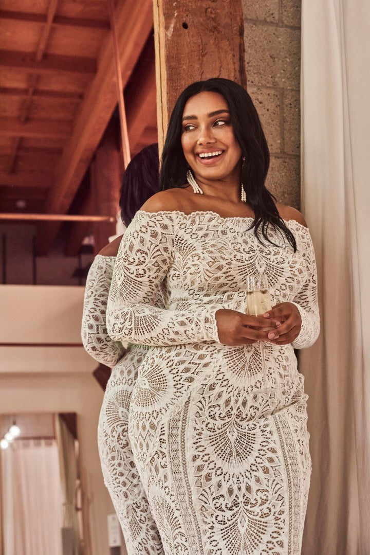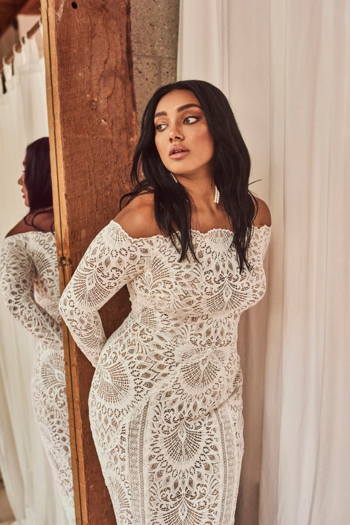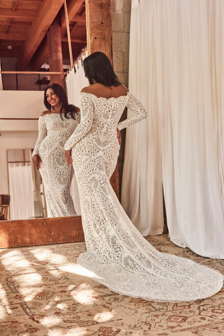 Thoughtfully designed for the curvy bride, Nathalia Curve by Grace Loves Lace celebrates feminine elegance with intricate trims and panel details. Her lace off-the-shoulder neckline flatters the shoulders and bust, while the sculpted silhouette ensures a confident, comfortable fit. A timeless choice for brides wanting romance and sophistication with curve-conscious design.