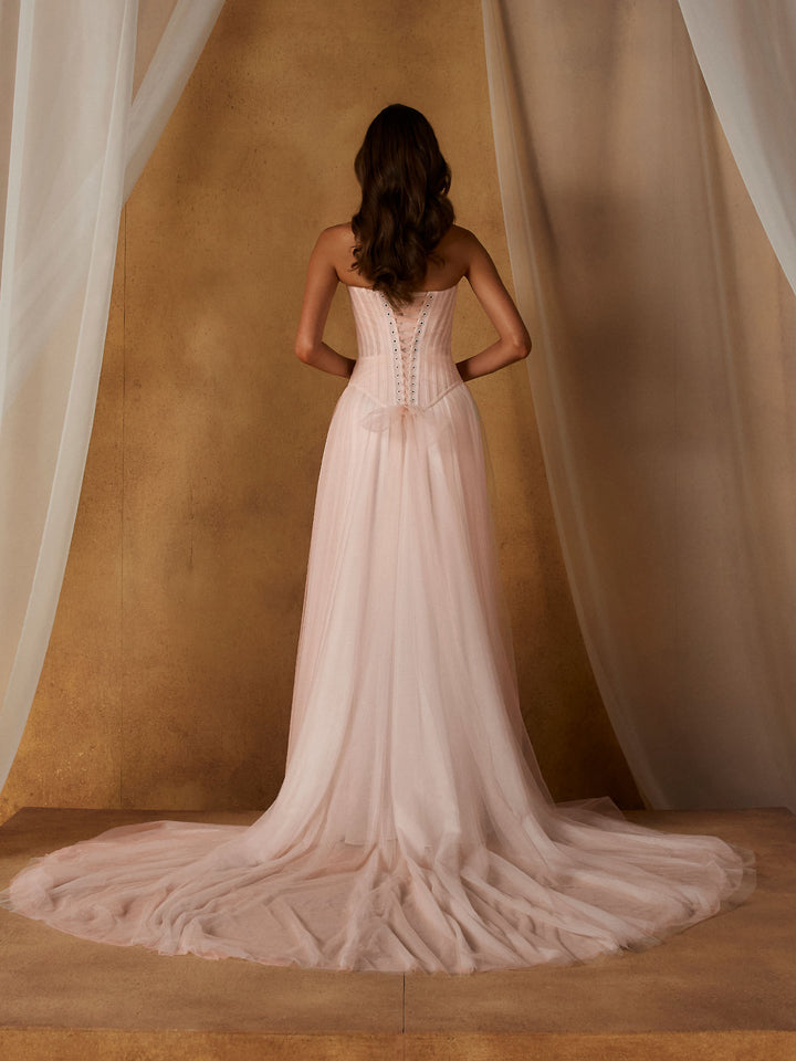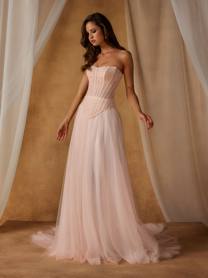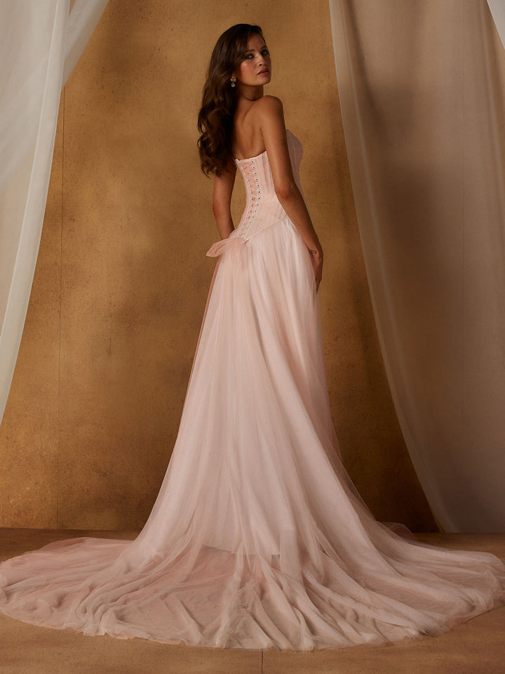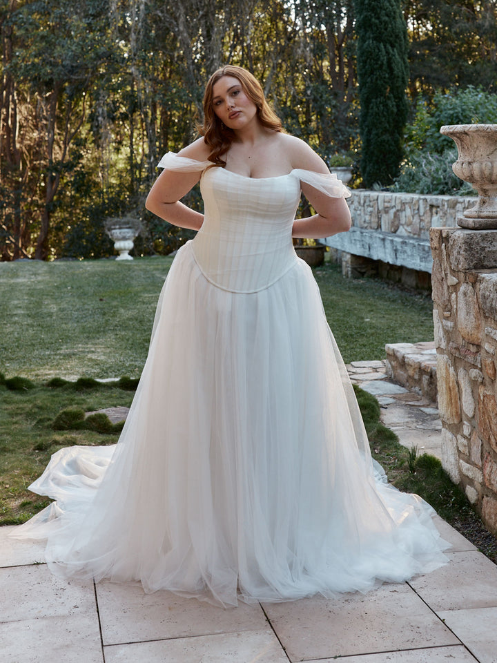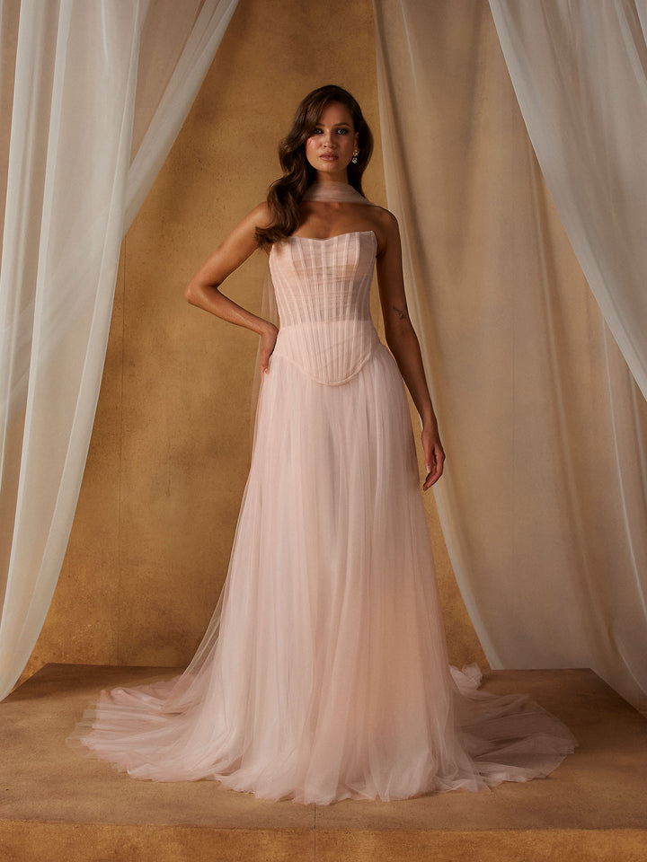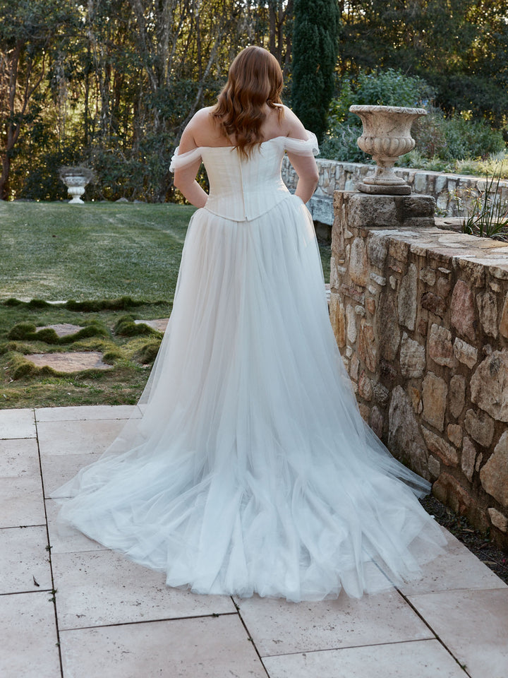 Our Nickel Bodice and Novel Skirt come together to create a beautifully versatile bridal look, perfect for brides who love a blend of sweetness, modernity, and a touch of the unconventional. Available in soft Blush or classic Ivory, the Nickel Bodice features a feminine scoop neckline, exposed boning for contemporary structure, and layers of pleated tulle that add subtle softness. Its rounded drop waist hugs the figure for a flattering, trend-led silhouette, while the classic lace-up back enhances the corset-inspired charm. Wear it strapless for a clean, modern aesthetic or add the detachable tulle off-shoulder sleeves for a more romantic, delicate finish. Paired with either the Novel Skirt or the Novelle Skirt, this combination offers two distinct styling directions, allowing brides to customise their perfect look through elegant bridal separates.