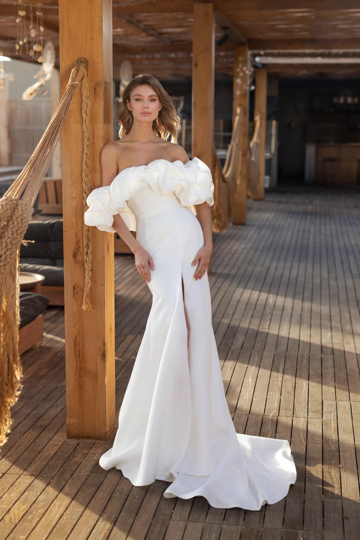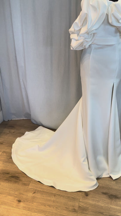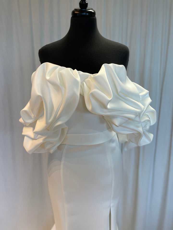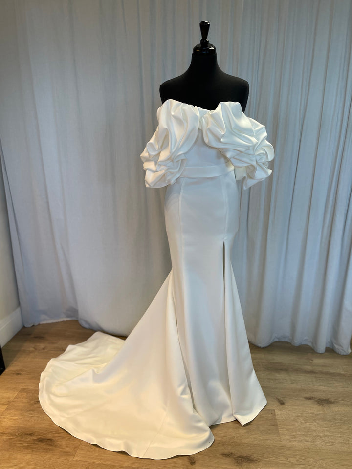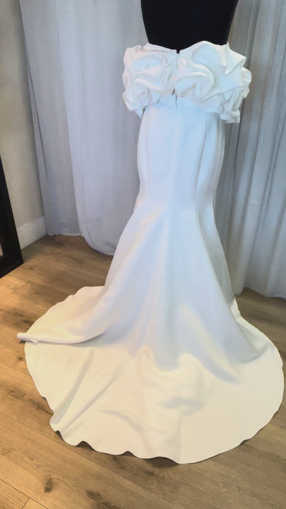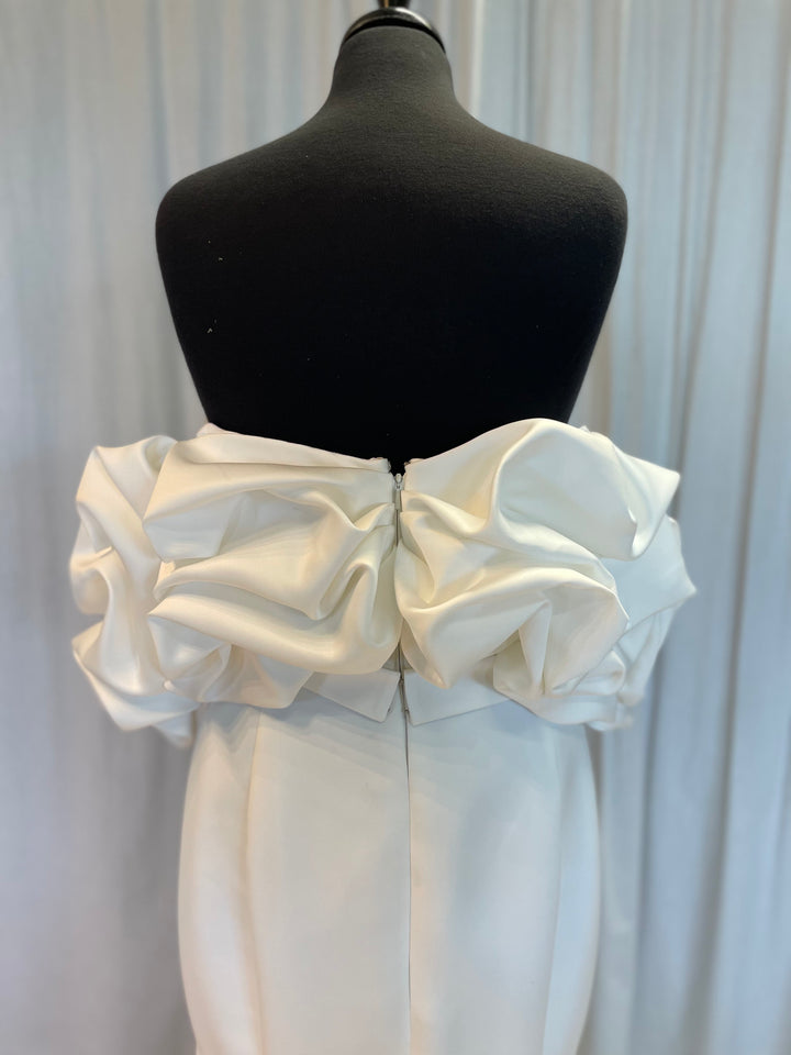 Crafted from luxurious fabrics that move with fluid grace, Rita showcases exquisite craftsmanship—subtle textural accents, soft draping, and thoughtfully placed embellishments that elevate its minimalist sophistication. The bodice offers gentle structure for a confident, comfortable fit, while the skirt flows with soft elegance, creating a look that feels both ethereal and polished.