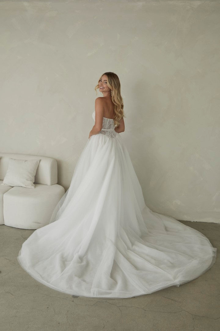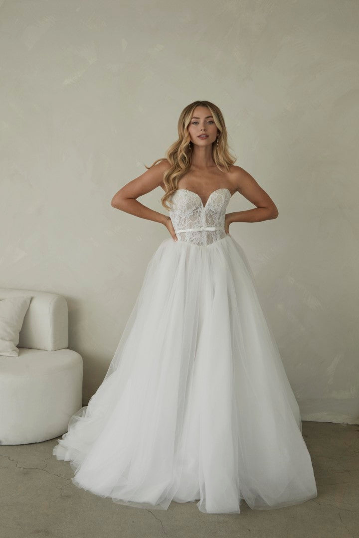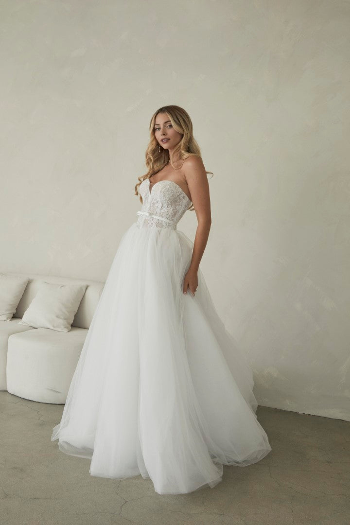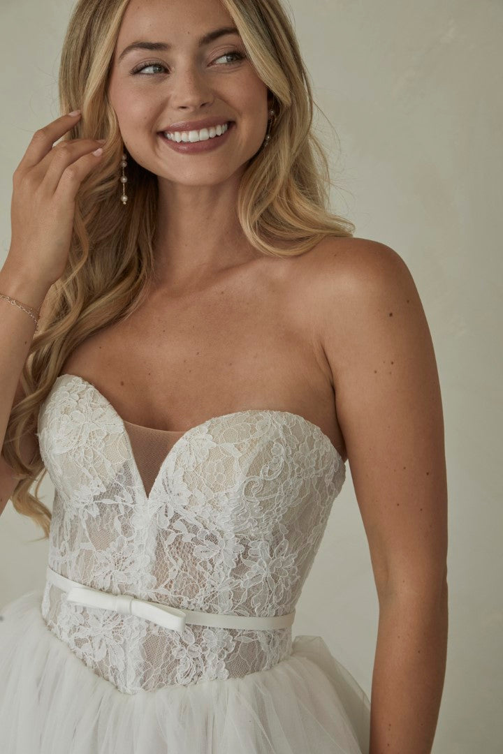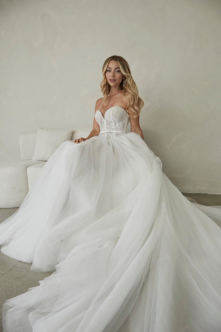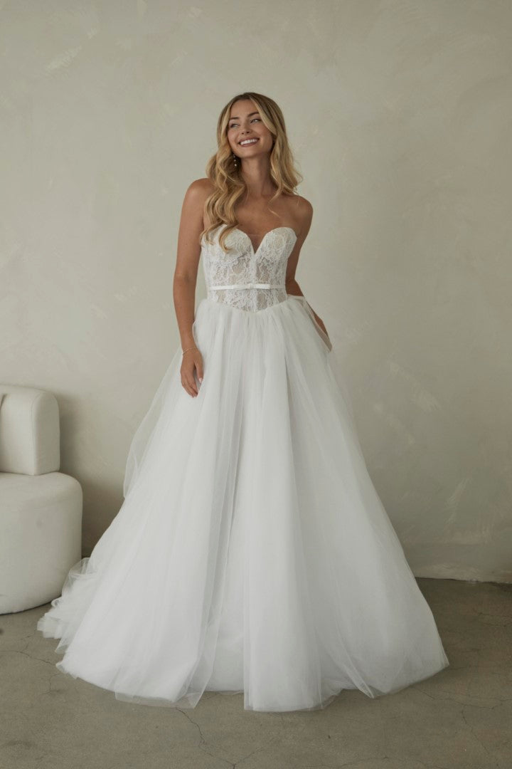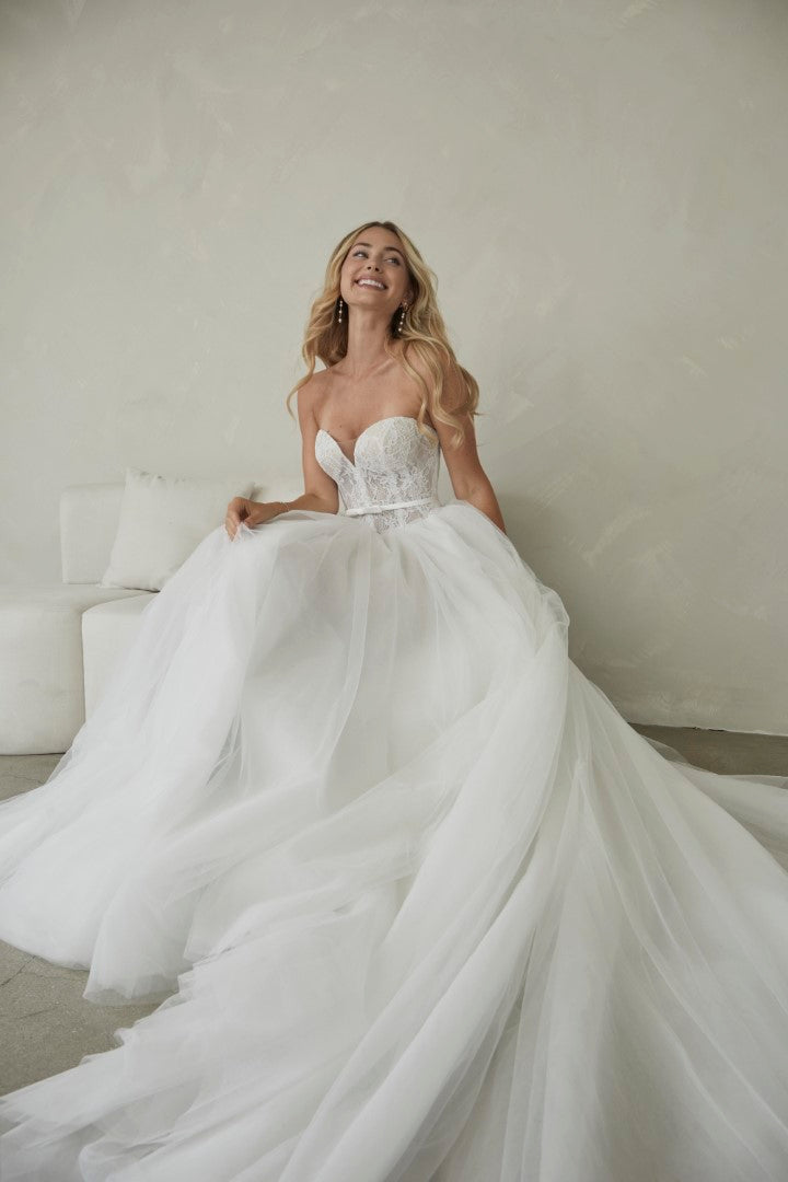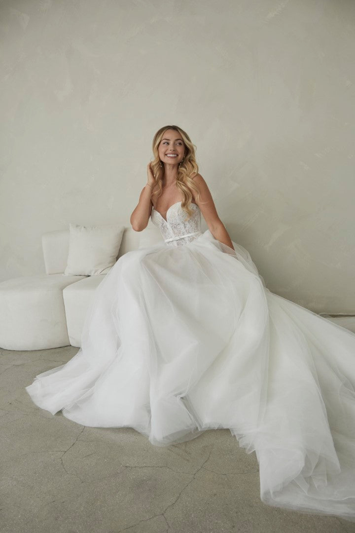 Romantic and timeless, Manette by Serene by Madi Lane combines classic elegance with soft whimsy. Crafted from delicate Chantilly lace and airy tulle, her strapless sweetheart bodice flatters beautifully and is finished with a detachable satin belt for definition. The full gathered tulle skirt creates effortless volume and movement, making Manette perfect for the modern bride who loves fairytale grace with contemporary simplicity.