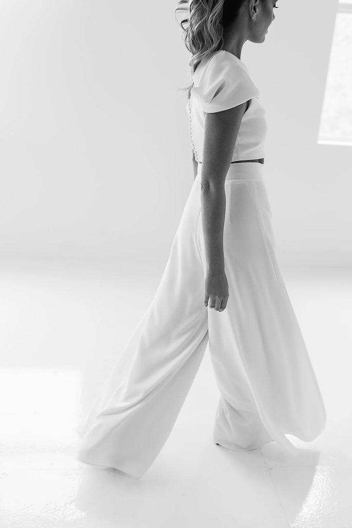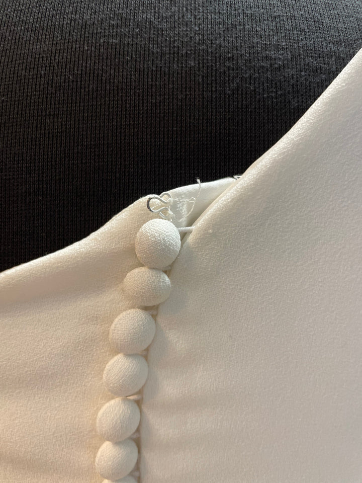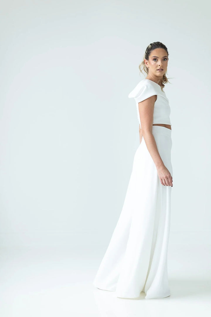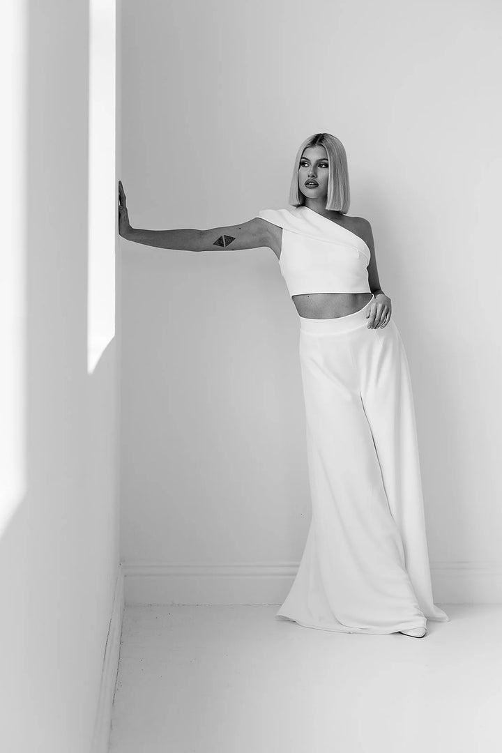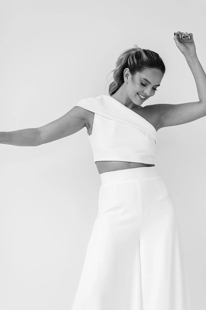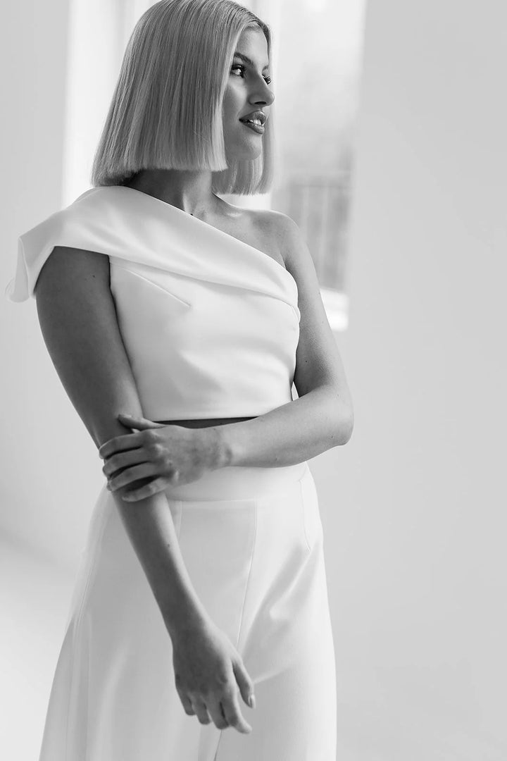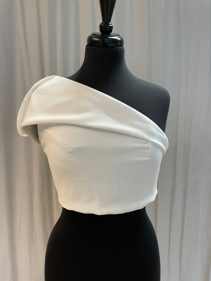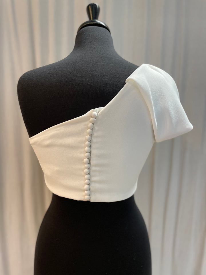 Asymmetric, contemporary, and modern with a flash of shoulder. Created in soft stretch crepe with a gorgeous finishing detail of a button fastening. Wear with Wren Trousers or of any of the other delicious Ella Kate separates.